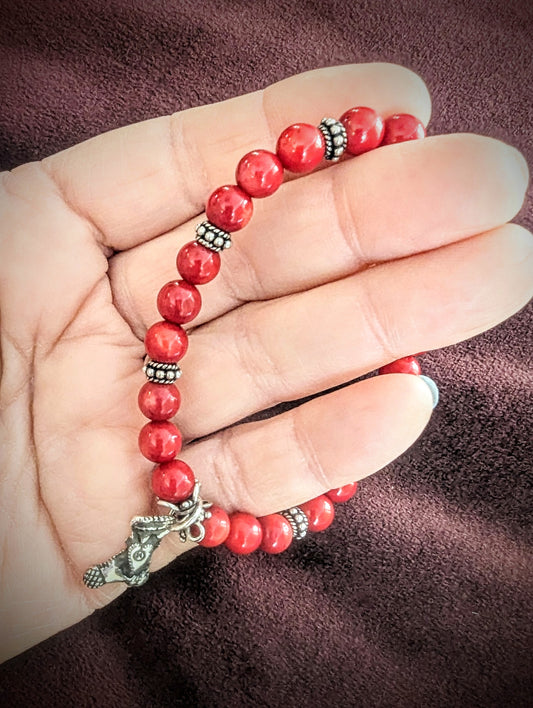 Christmas Bracelet, Red Coral and Silver Christmas Stocking Charm