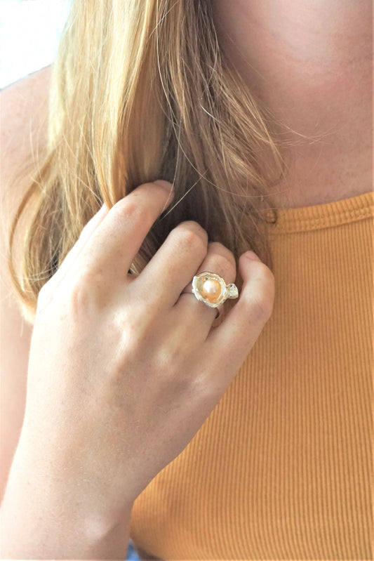 Peach Pearl in Silver Water Droplet Ring, Eco-Friendly Recycled Silver Ring, Unique Artisan Bohemian Jewelry