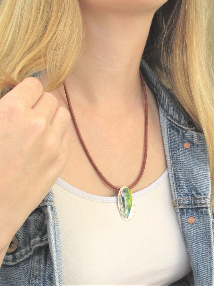 Graffiti Fordite in Sterling Silver Pendant, Picture Pierced Back, Leather Necklace