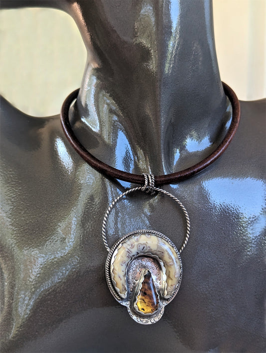 Stunning Round Coral and Amber in Textured Silver Pendant, Artisan Bohemian Gemstone Statement Necklace