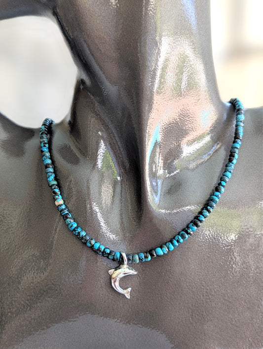 Dainty Silver Dolphin Charm on Blue Turquoise Necklace, Eco-Friendly Artisan Beach Jewelry