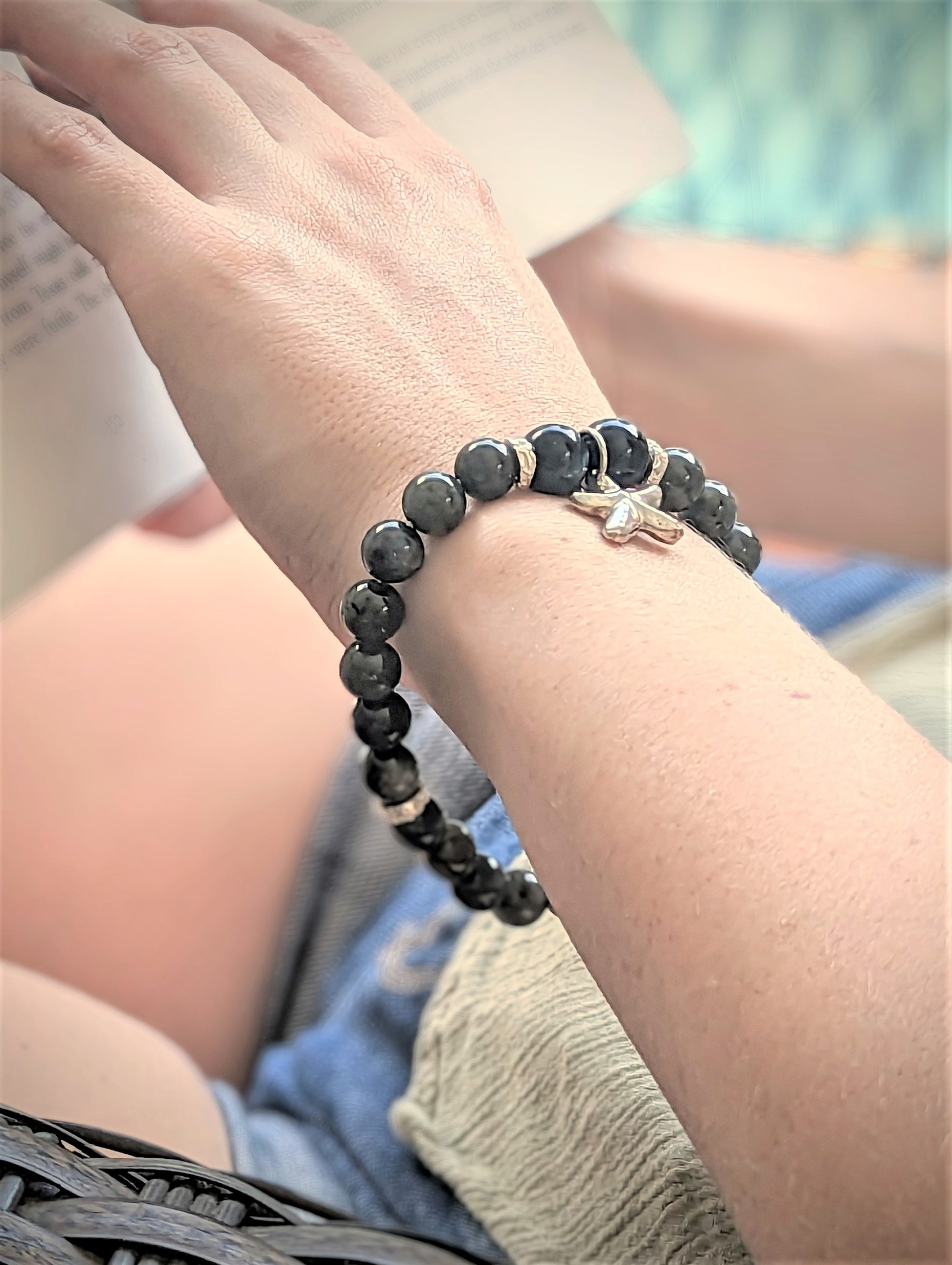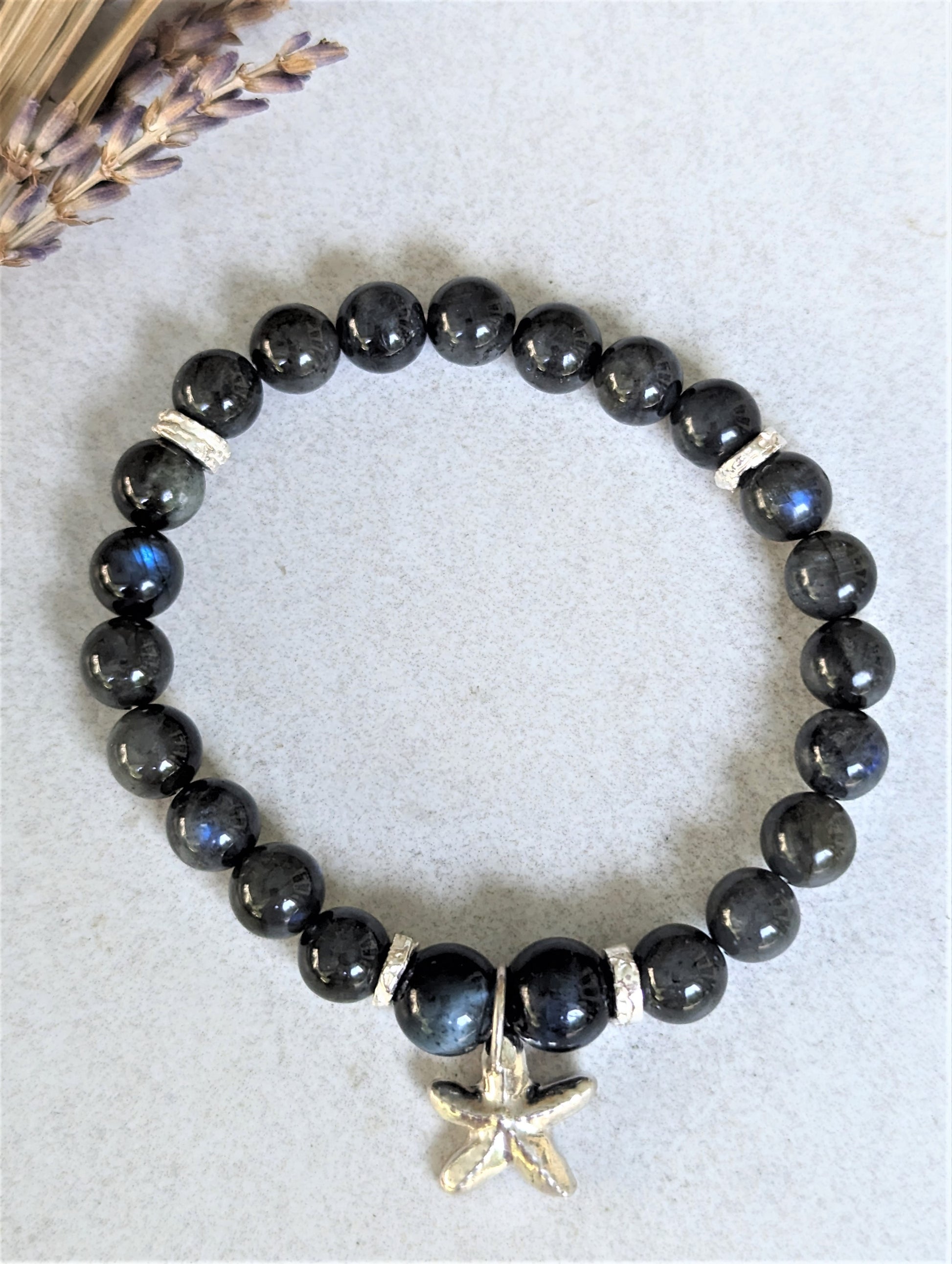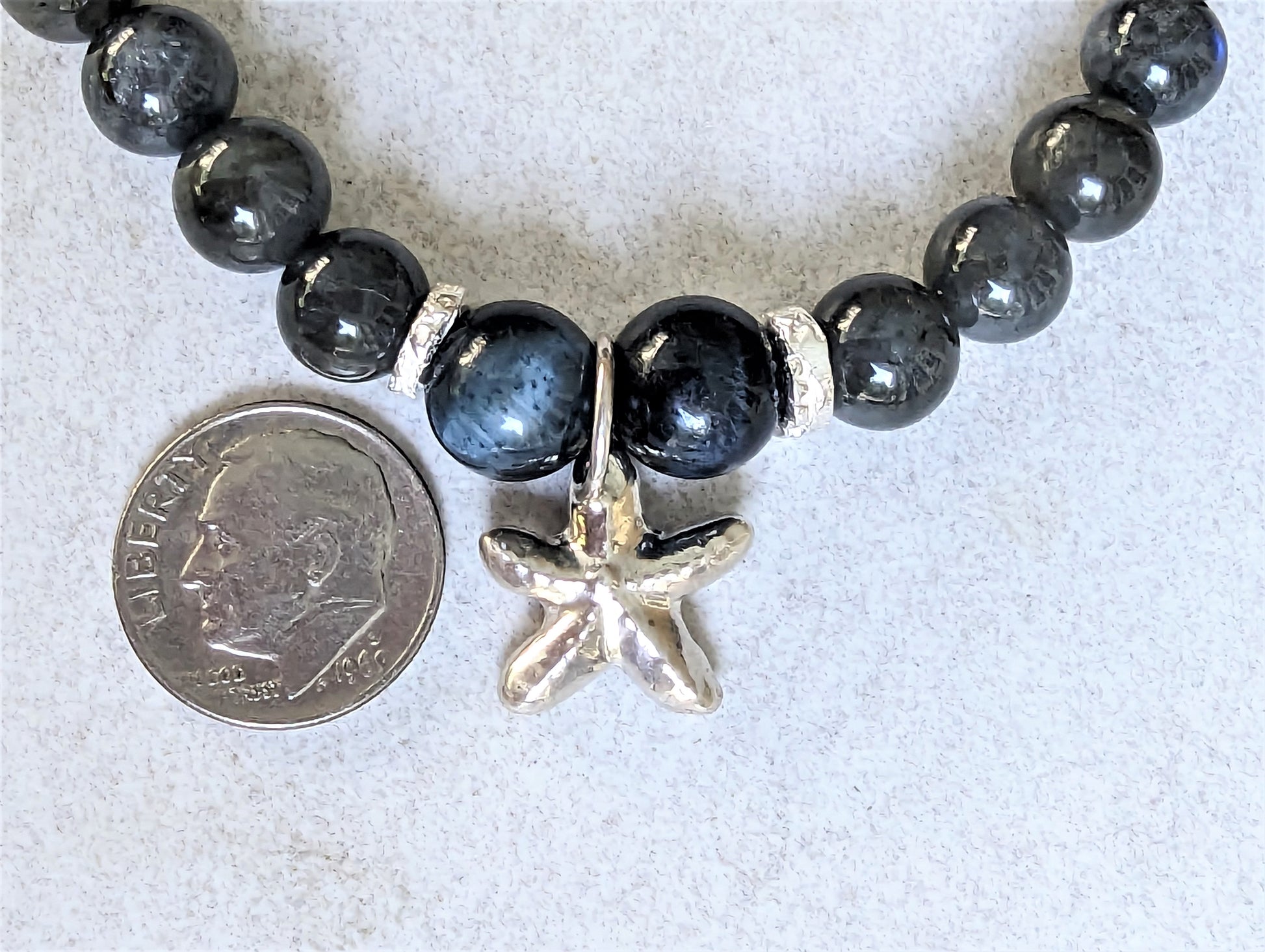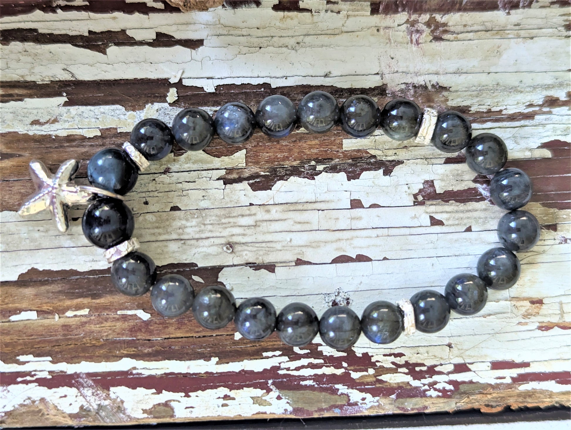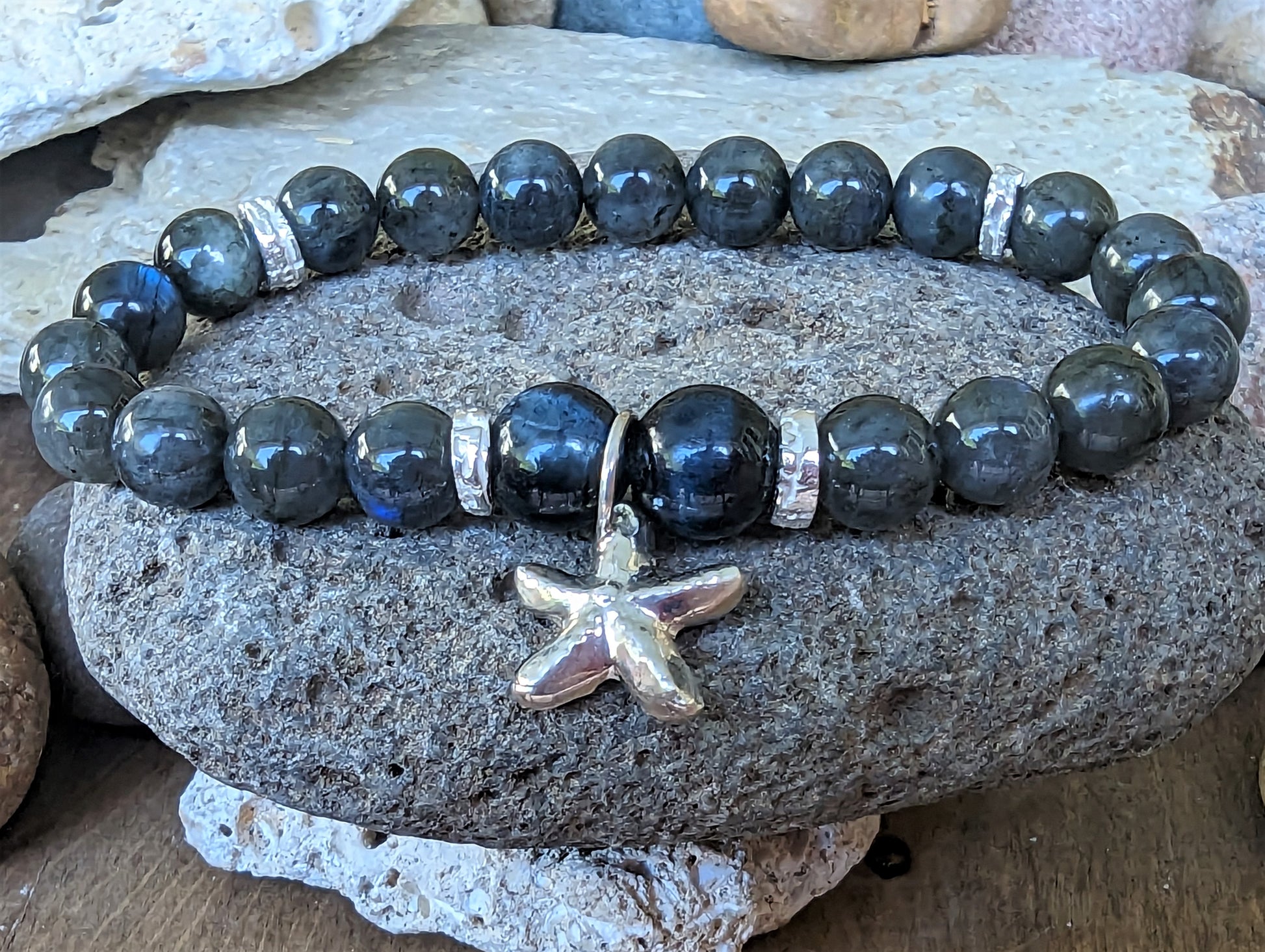 Staring into the rare blue labradorite beads in this bracelet is like staring into the midnight blue sea with nothing but stars to light your way. The beads appear almost black, then suddenly the light hits just right and a brilliant blue flashes out like a spotlight from the deep. Brought to the surface in the swirling blue tide is a small starfish charm, handcrafted of fine silver metal clay. The starfish represents resilience, regeneration, and the interconnectedness of all living beings. Surrounding the starfish are two large blue tigers eye beads. This gemstone is renowned for its striking deep blue hue with its silvery band of light shimmering like the gentle waves, creating a sense of movement within the stone. The combination of the blue tigers eye with the blue labradorite beads creates a harmonious balance, evoking the calming and mysterious qualities of the sea. Handmade silver beads spaced through the bracelet add an extra hint of sparkle. This subtle accessory is worn equally well by a man or a woman. The elastic makes it comfortable and easy to wear. Its beauty is in its simplicity. This bracelet exudes elegance, charm, and a deep connection to the wonders of the natural world. It's an enchanting piece of jewelry that speaks to the soul and brings a touch of the sea's magic to the wearer's everyday life.