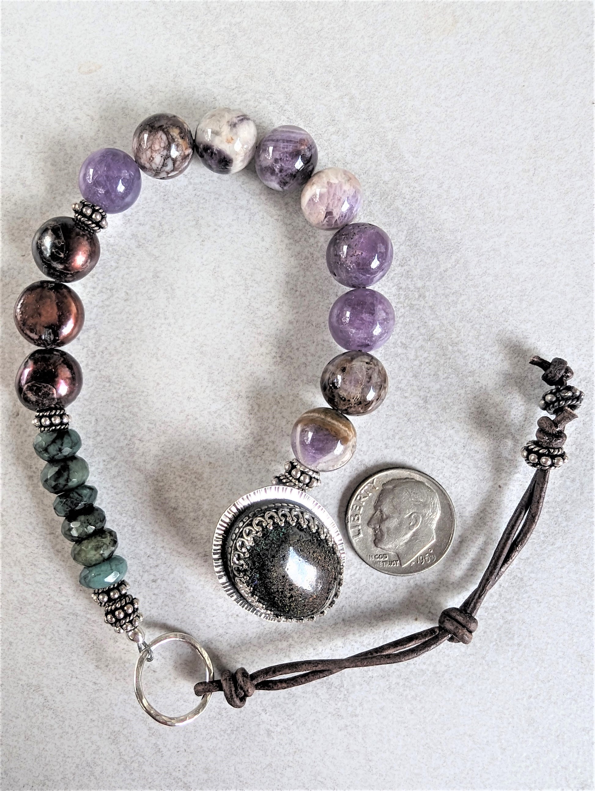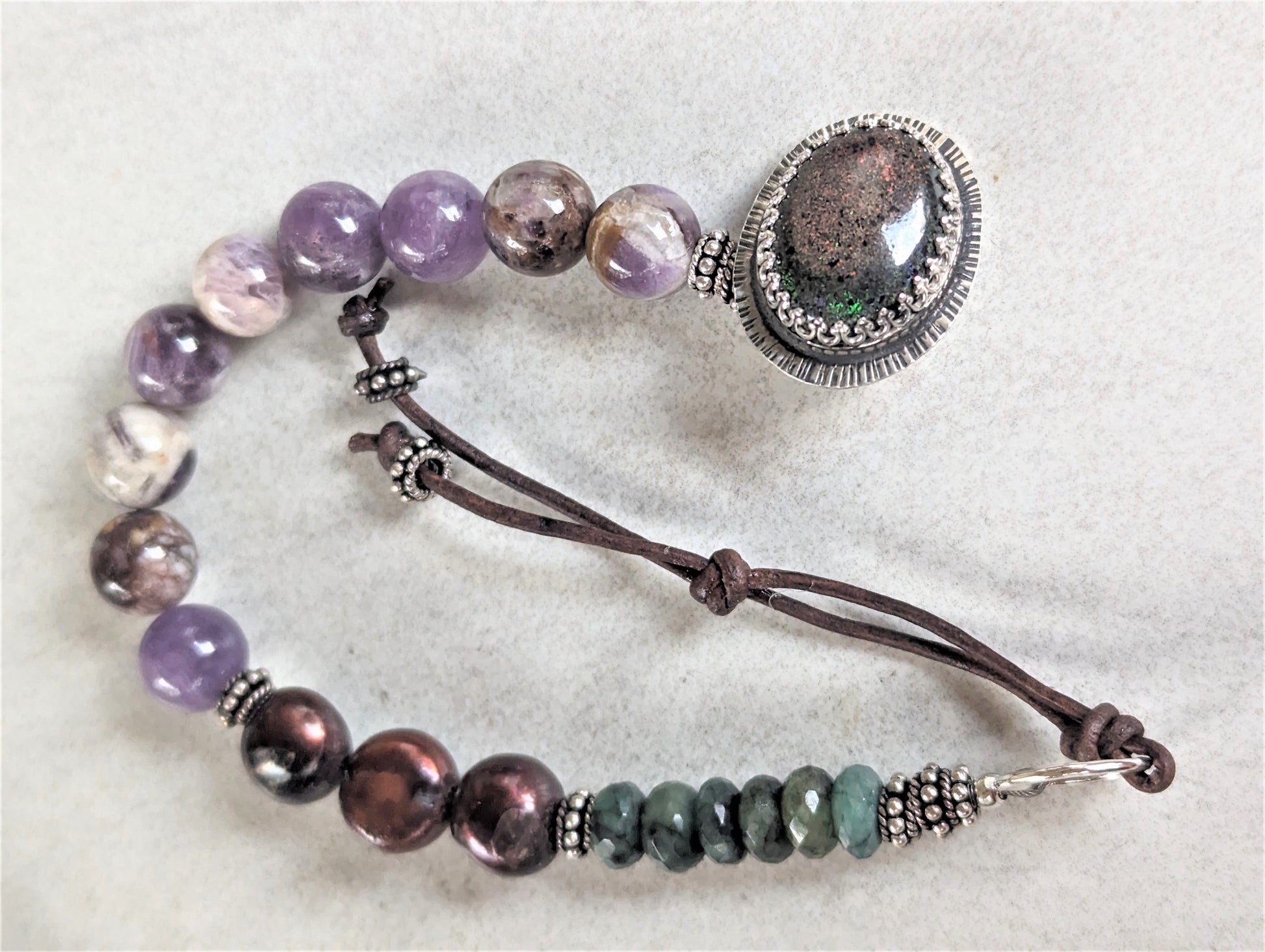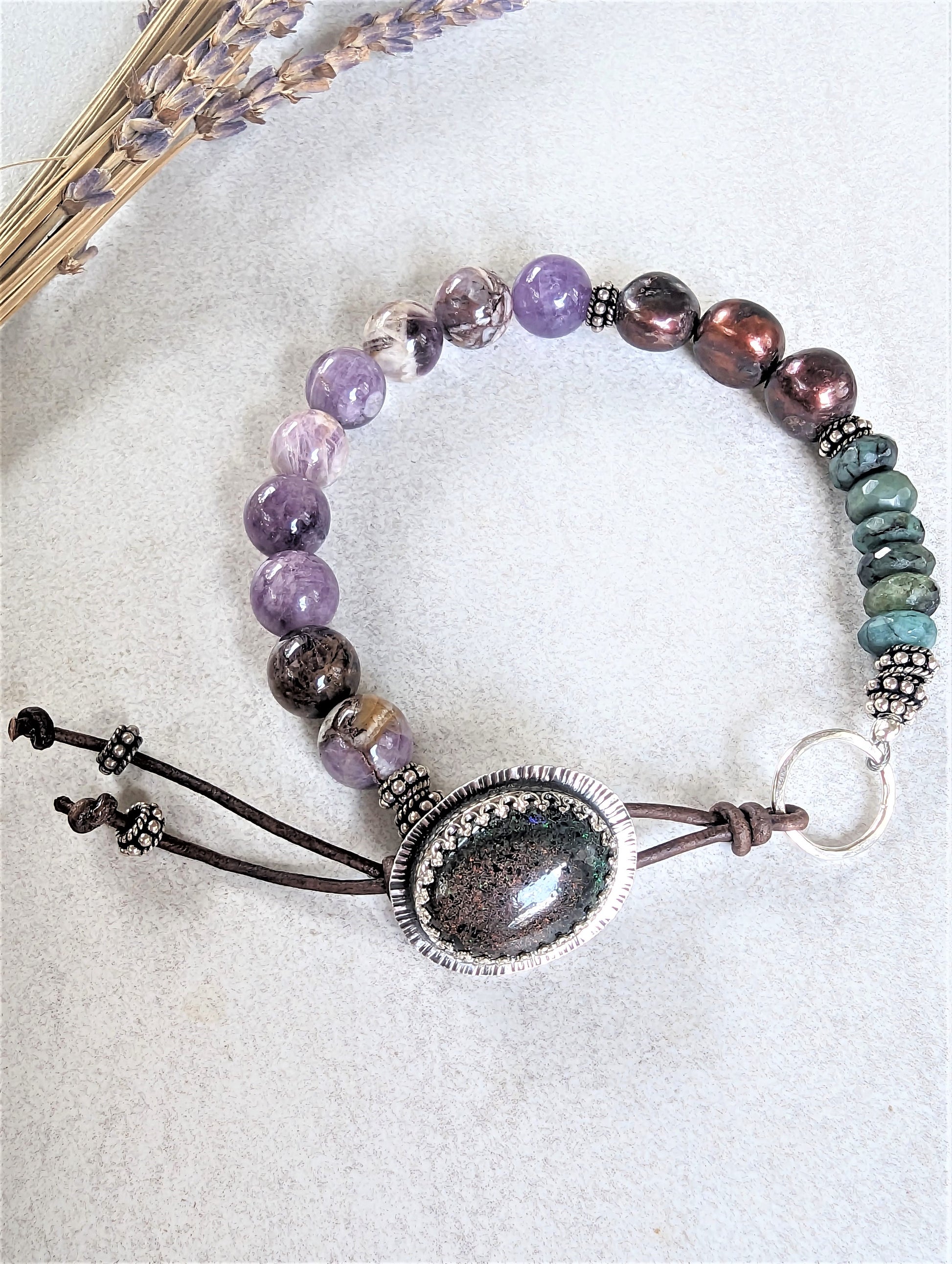 This beautiful bracelet is a harmonious blend of natural elements and artistic craftsmanship, designed to captivate the senses and evoke a sense of wonder. Starting one end of the bracelet is a collection of amethyst sage agate beads, chosen for their unique hue and visual texture. These beads showcase varying shades of lavender, lilac, and pale violet, with creamy swirls reminiscent of a tranquil twilight sky. They are smooth and polished, lending a gentle sheen to the overall composition. Following is a group of large chocolate brown pearls, which exude an earthy elegance. These pearls, with their rich and lustrous surface, provide a warm contrast to the cool tones of the amethyst. Their irregular shapes lend an organic feel, enhancing the bracelet's natural aesthetic. Adding a touch of opulent allure are the faceted raw emerald beads, their vibrant green hues symbolizing vitality and renewal. The clasp of the bracelet is a true work of art. Handcrafted with meticulous attention to detail, it features a button made from Australian boulder opal, a gemstone known for its captivating play of colors. The opal's sprinkles of deep purple and green iridescence is encased in a shiny sterling silver setting that contrasts and accents the warmth of the opal. To complete the clasp is a hand-knotted leather tie which provides a rustic and tactile element. The leather has been carefully chosen for its durability and suppleness, ensuring comfort and longevity. This clasp not only secures the bracelet but also serves as a focal point that draws the eye and sparks conversation. This wonderful bracelet tells a story of earthy elegance and vibrant energy, inviting the wearer to adorn themselves with a truly unique and captivating piece of jewelry.