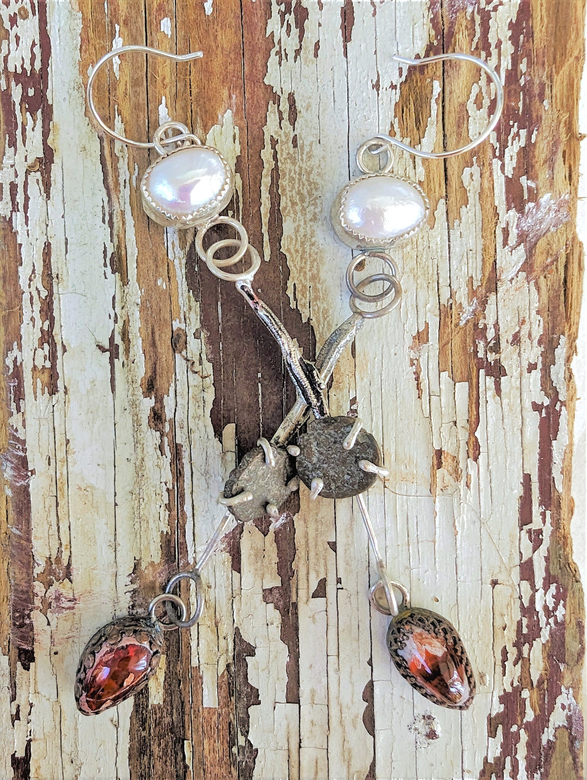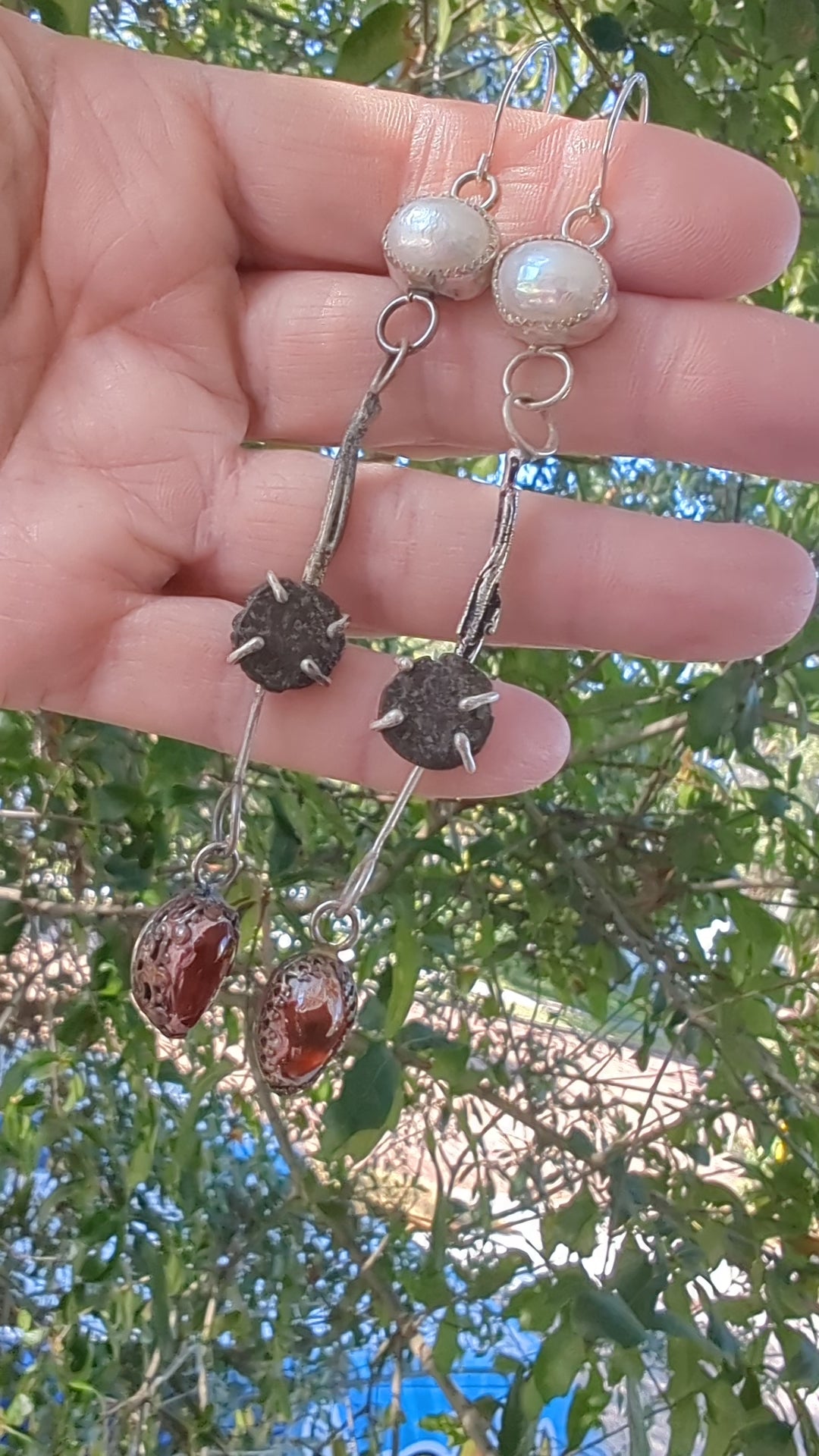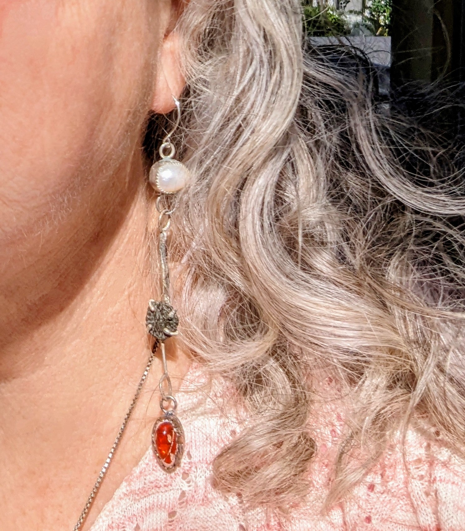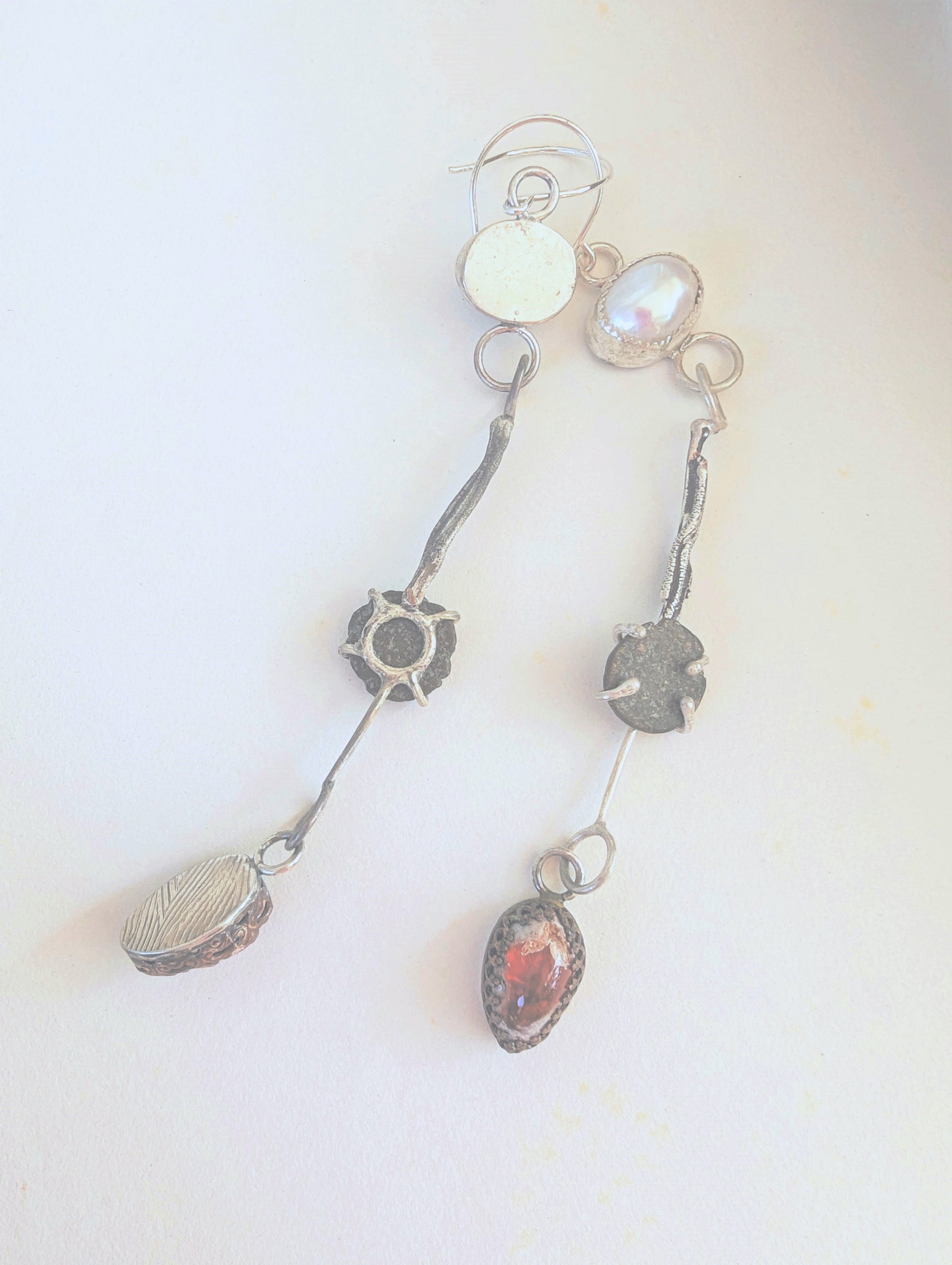 Handmade bohemian-style long dangle earrings crafted from recycled sterling silver exhibit a unique and artistic design. The earrings feature a slender organic stick shape of fused silver, each with a unique and irregular texture, adding a touch of rustic charm to the overall design. At the top of the earrings, a large, lustrous pearl serves as a captivating focal point. The pearl, with its smooth and creamy surface, contrasts elegantly with the textured silver elements. Its placement adds a sense of sophistication to the bohemian aesthetic, blending classic and unconventional elements seamlessly. In the center of the earrings, an ancient Roman coin artifact sits snugly, lending a historical and cultural allure to the jewelry. The coin's aged appearance contribute to the overall vintage and eclectic feel of the earrings, making them conversation starters and pieces with a story to tell. The bottom of the earrings showcases the vivid beauty of Mexican fire opals. These gemstones, known for their fiery flashes of color, add a vibrant and exotic touch to the design. The opals sway delicately, catching and reflecting light with every movement, creating a mesmerizing visual display. The combination of disparate elements in these handmade earrings results in a harmonious blend of bohemian spirit, historical intrigue, and contemporary elegance.