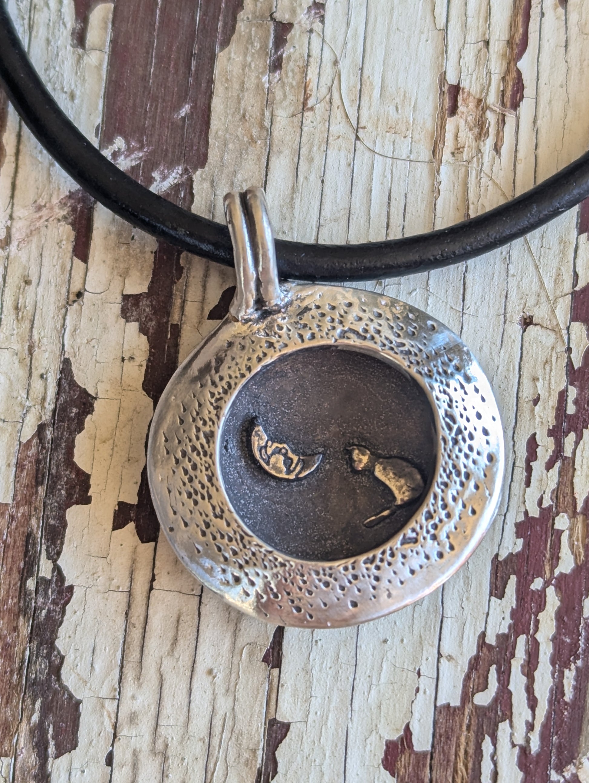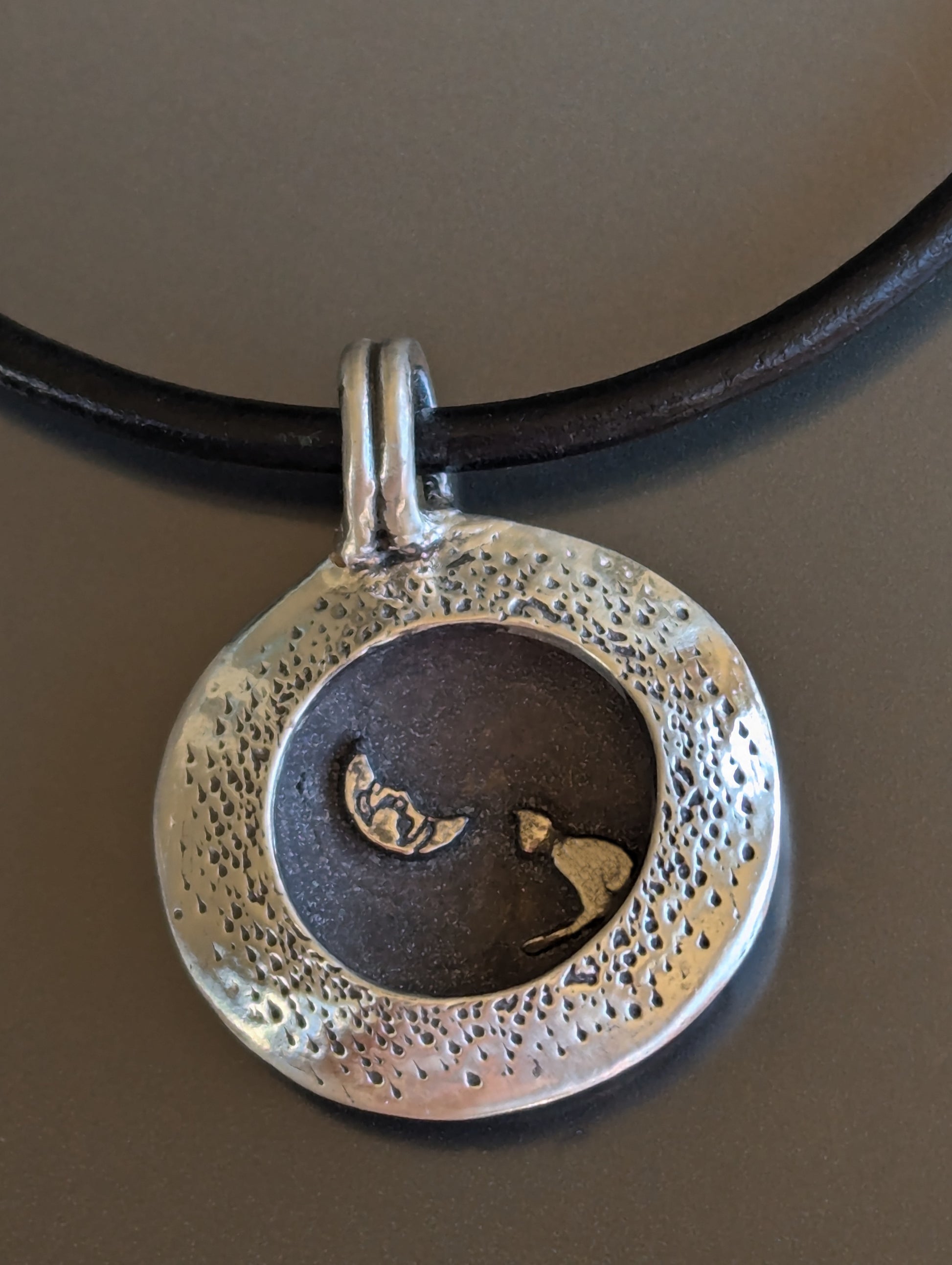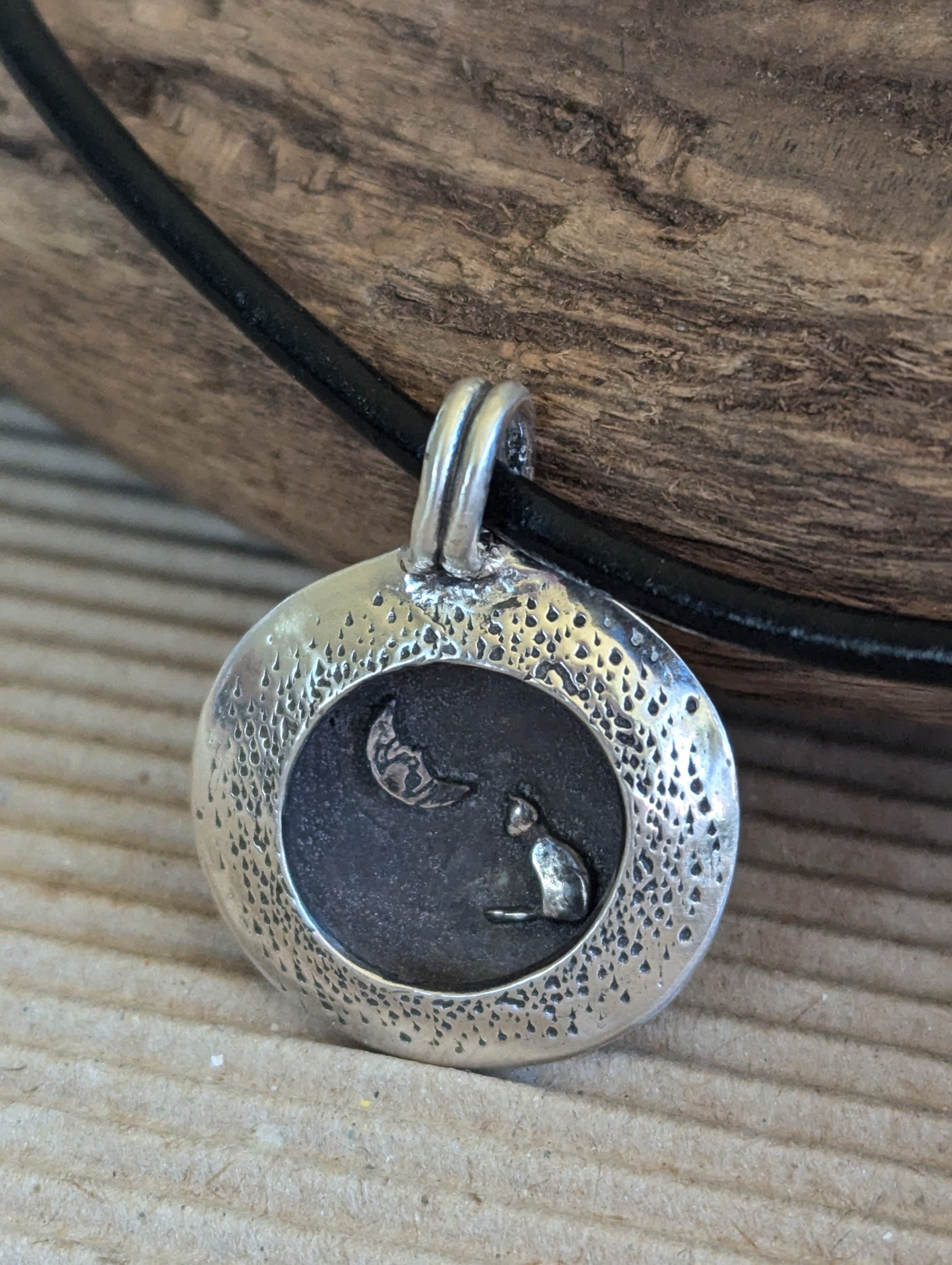 This enchanting lentil pendant captures a sense of celestial wonder. One side features an open lentil design with a delicate, cratered texture along the rim, evoking the rugged surface of a moonlit lunar landscape. A cutout in the center reveals the silhouette of a curious cat, its form gazing upward in awe at a small crescent moon, perfectly framed by the open space. On the reverse, the smooth, polished surface of the lentil is adorned with an artistic crescent moon, lending an elegant simplicity to the piece. The charming pendant was hand-crafted of eco-friendly fine silver metal clay, and hangs on a thick black cord of supple leather. This dual-sided design allows for versatility, with one side inviting contemplation of the cosmos, while the other offers serene minimalism. A perfect pendant for dreamers, night-sky lovers, or anyone drawn to the mystical relationship between cats and the moon.