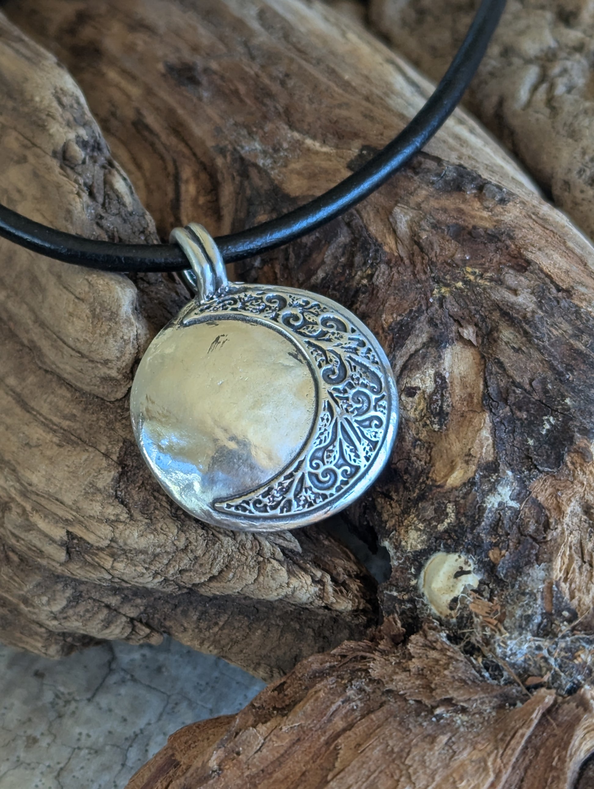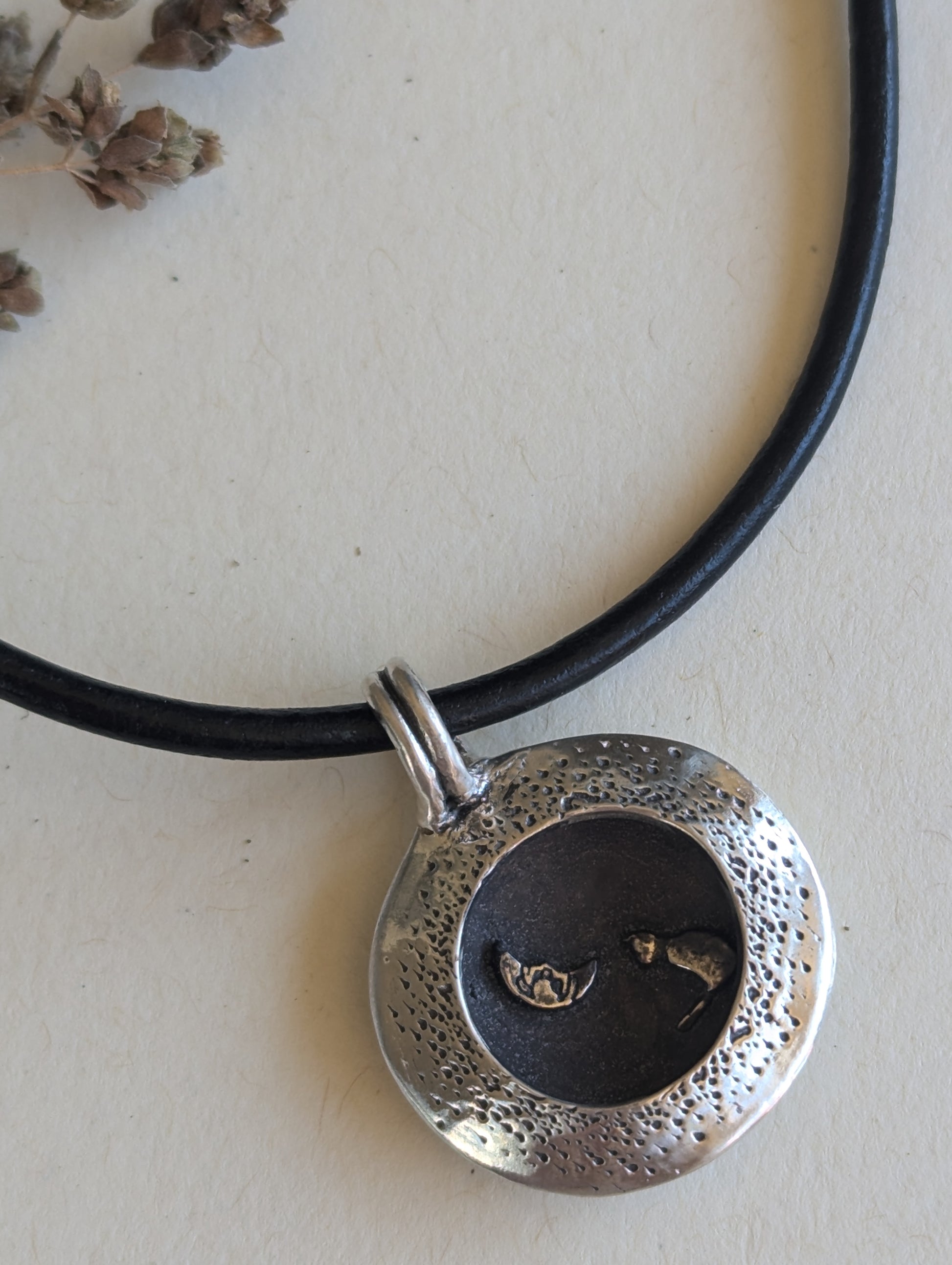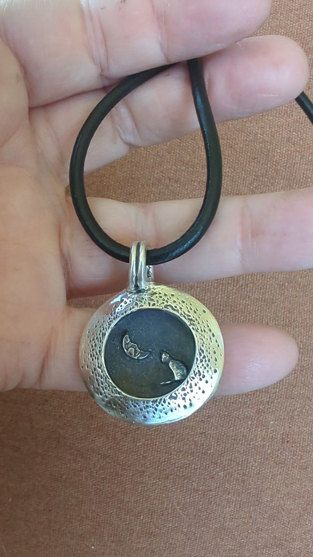 This enchanting lentil pendant captures a sense of celestial wonder. One side features an open lentil design with a delicate, cratered texture along the rim, evoking the rugged surface of a moonlit lunar landscape. A cutout in the center reveals the silhouette of a curious cat, its form gazing upward in awe at a small crescent moon, perfectly framed by the open space. On the reverse, the smooth, polished surface of the lentil is adorned with an artistic crescent moon, lending an elegant simplicity to the piece. The charming pendant was hand-crafted of eco-friendly fine silver metal clay, and hangs on a thick black cord of supple leather. This dual-sided design allows for versatility, with one side inviting contemplation of the cosmos, while the other offers serene minimalism. A perfect pendant for dreamers, night-sky lovers, or anyone drawn to the mystical relationship between cats and the moon.