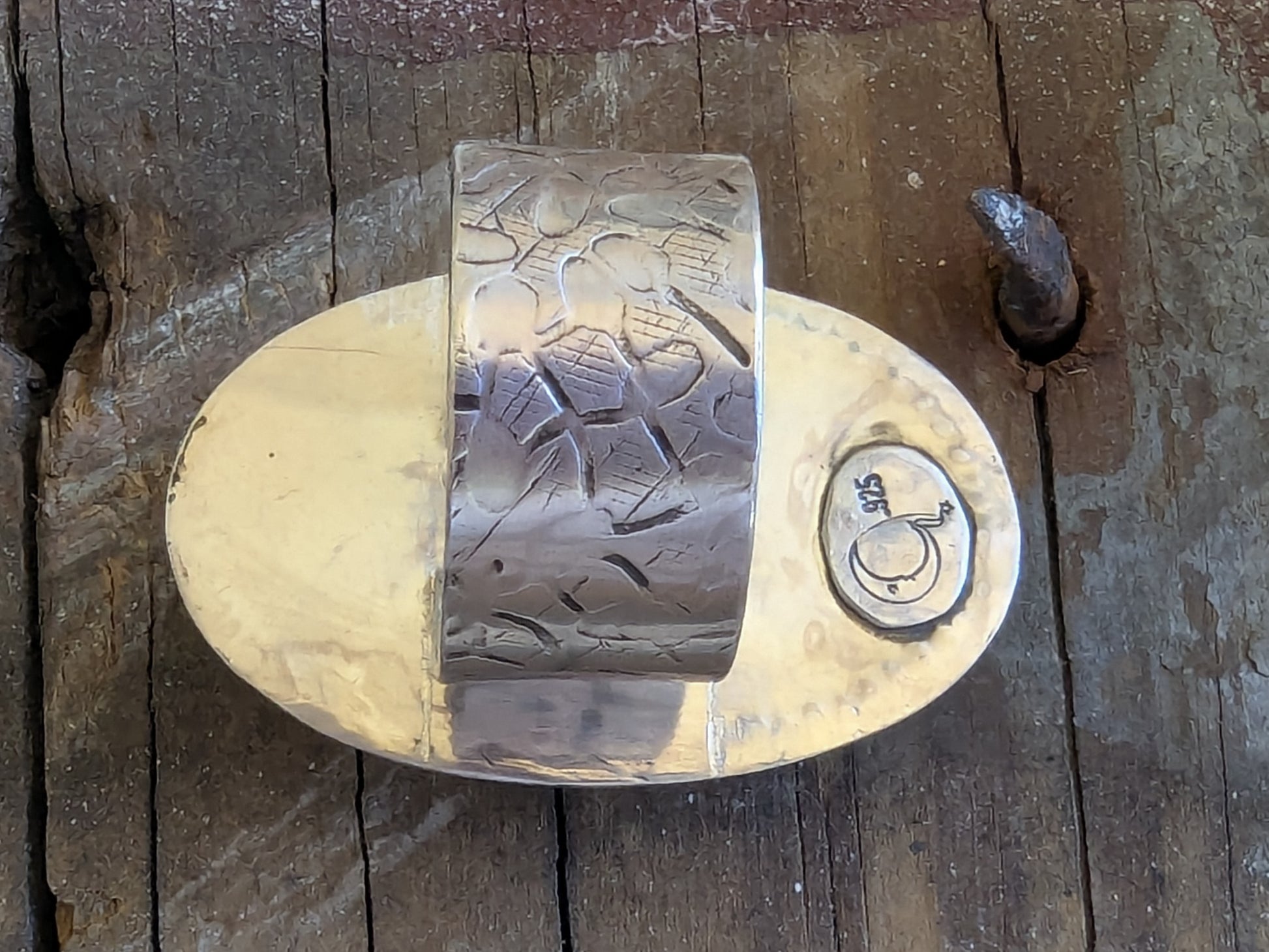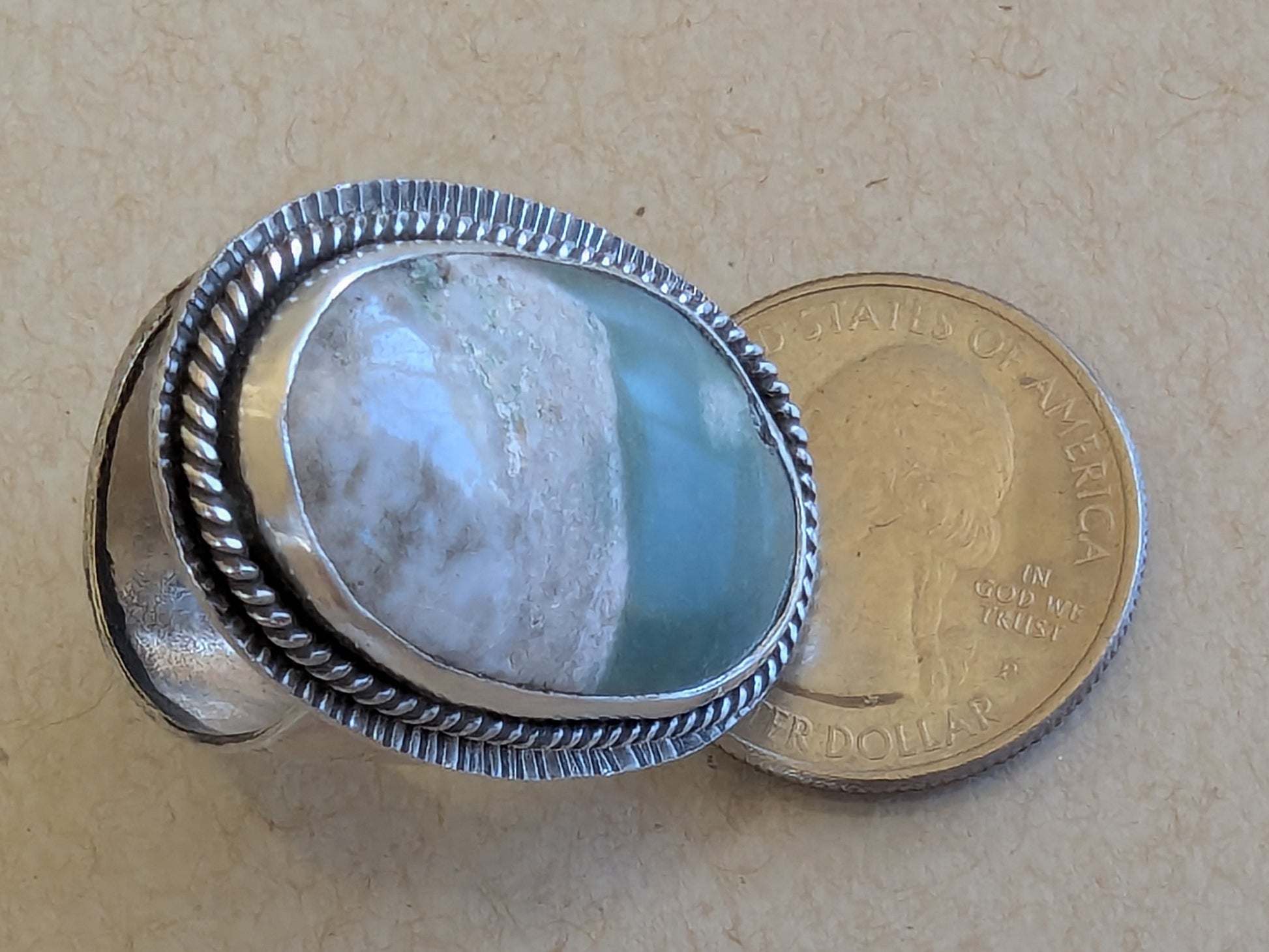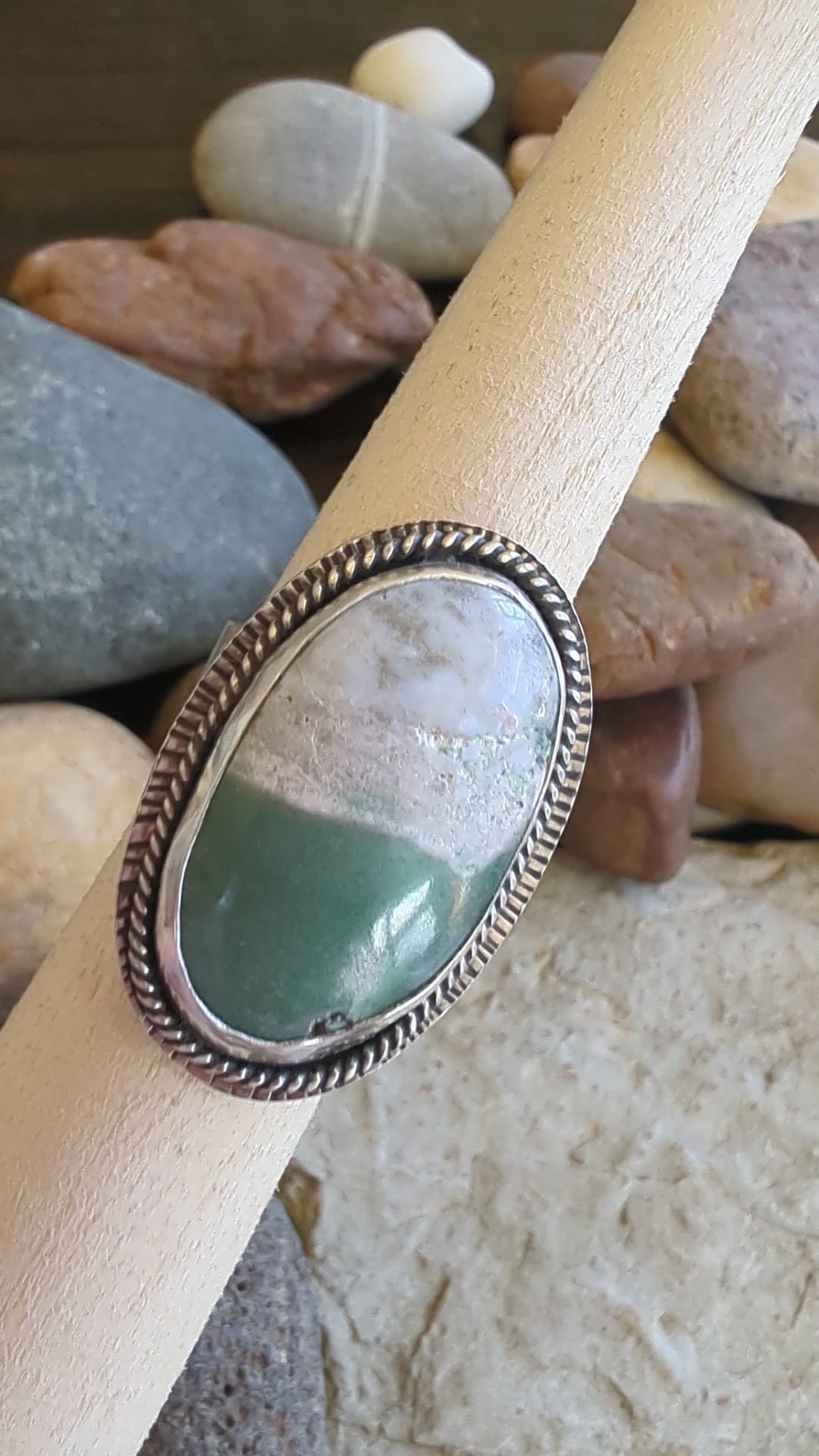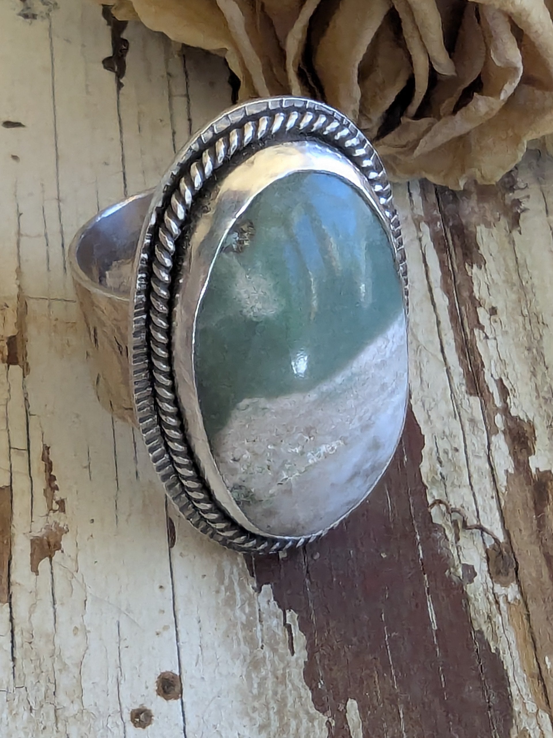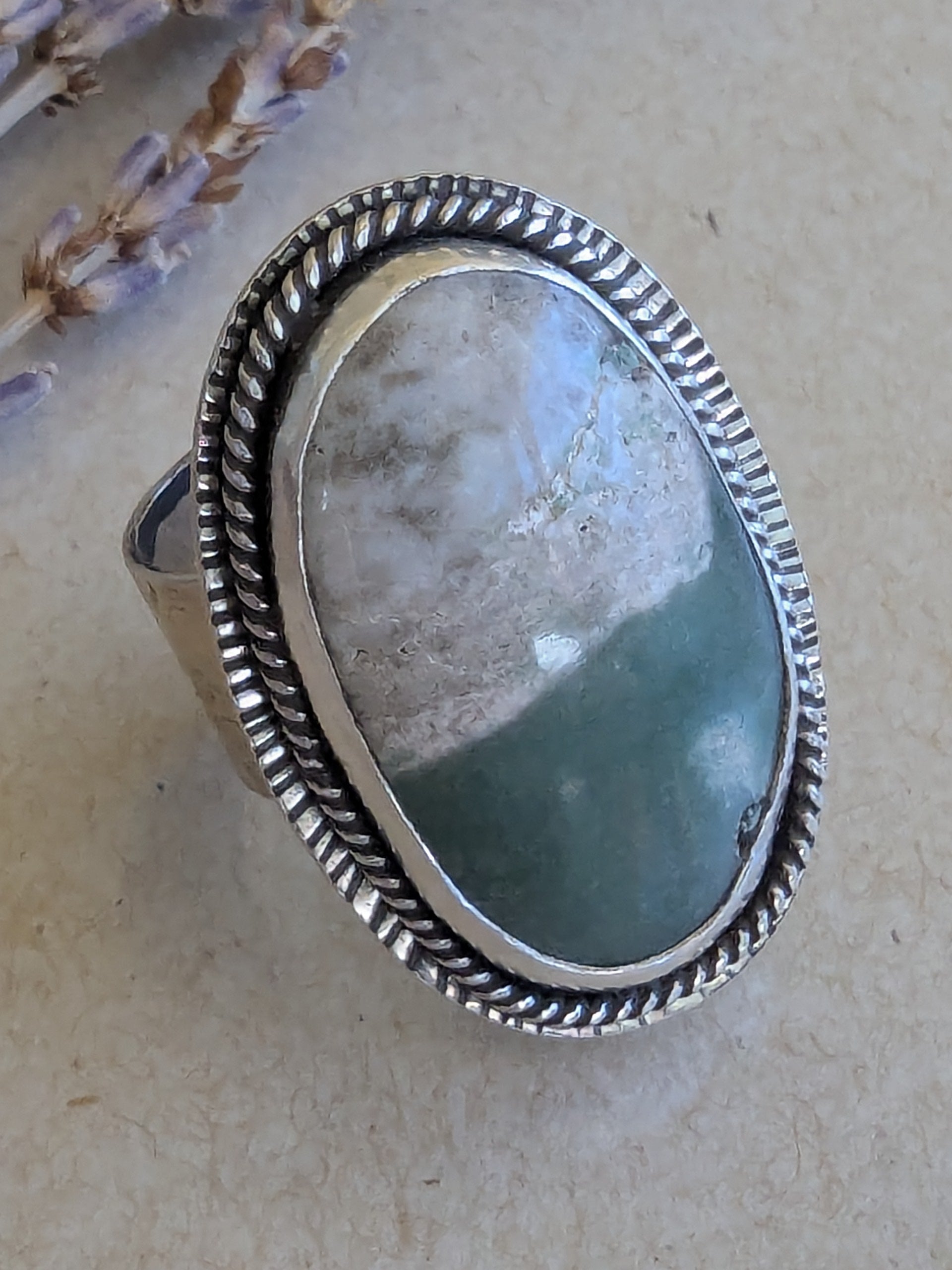 Bold and earthy, this handcrafted ring features a striking large oval variscite stone, uniquely patterned with half soft green and half creamy white. Set in a custom sterling silver bezel, the stone's natural beauty takes center stage, while the organic division of color adds intrigue and balance. Surrounding the stone is a silver twisted rope embellishment and hand hammered background that add rich texture to complement the smooth, cool stone. The wide sterling silver band is softly textured, giving it a raw elegance that complements the stone's natural patterns. Every mark and hammer impression is intentional, creating a one-of-a-kind tactile surface that catches light and shadow beautifully.