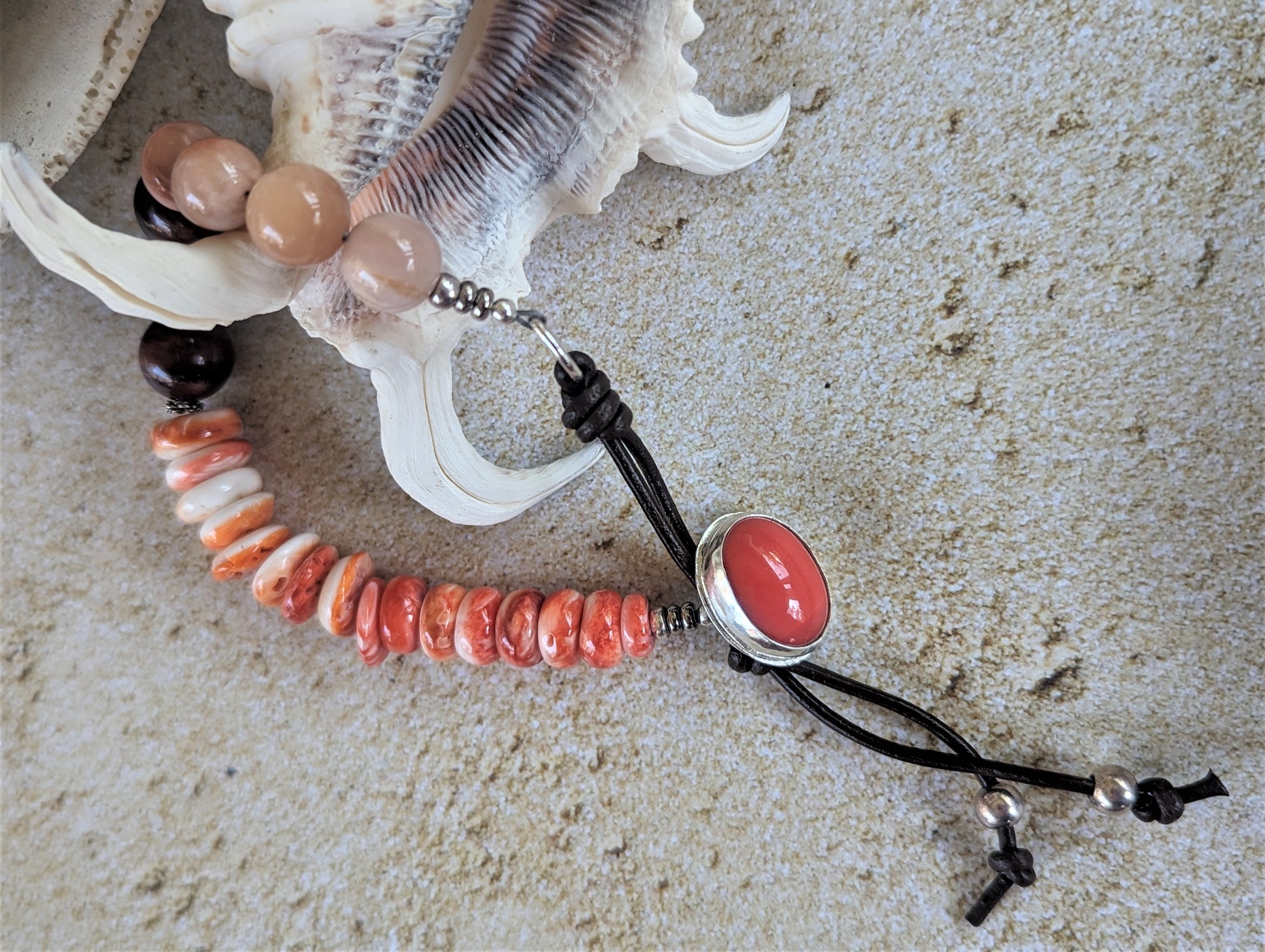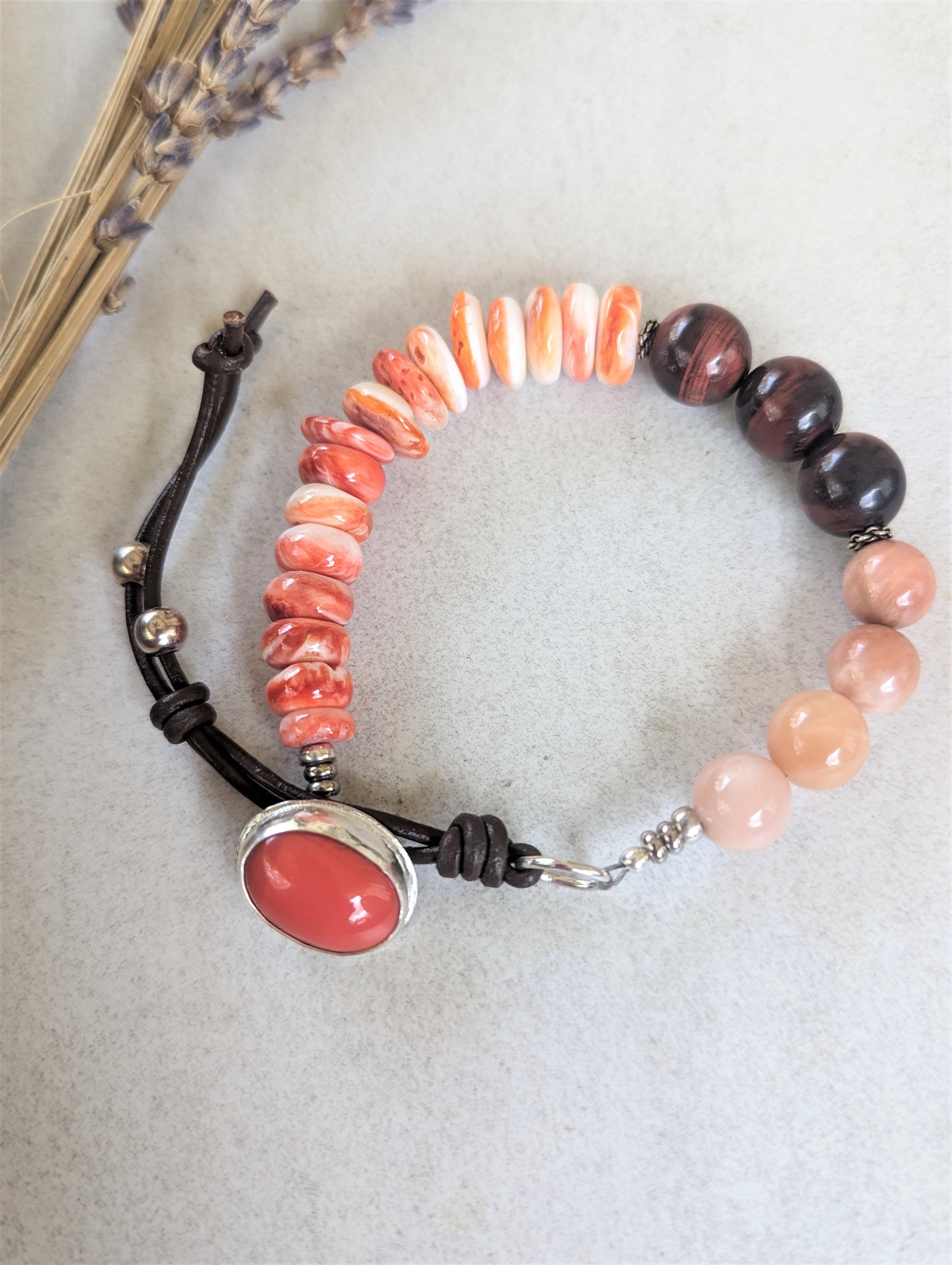 This bracelet features a combination of chunky design and colorful beads creating a captivating and harmonious accessory suitable for anyone seeking a distinctive and meaningful adornment. The primary stone of the bracelet is spiny oyster which contribute to the bracelet's uniqueness with their vibrant orange and reddish tones. These beads display intricate patterns and a high polish, adding a lively and organic feel to the design. Contrasting with the bright spiny oyster are red tiger eye beads which possess a rich reddish-brown hue with golden bands. These beads have a captivating shimmer that catches the light, adding depth and warmth to the bracelet. Bringing a cool blend of the bright and the warm is peach moonstone. These beads exhibit a soft, translucent peachy color with subtle iridescent flashes, adding a delicate touch to the bracelet. The center piece and pop of color is the bright orange coral button, set in sterling silver. This button forms the closure of the bracelet along with the hand knotted leather cord. When worn, this bracelet becomes a statement piece that reflects individuality, style, and a connection to nature. The combination of chunky design and striking gemstones creates a captivating and harmonious accessory suitable for anyone seeking a distinctive and meaningful adornment.