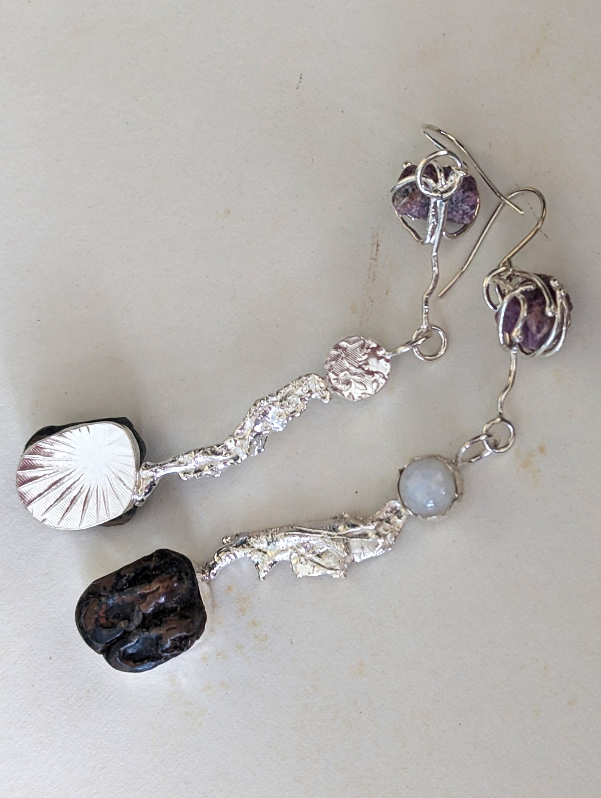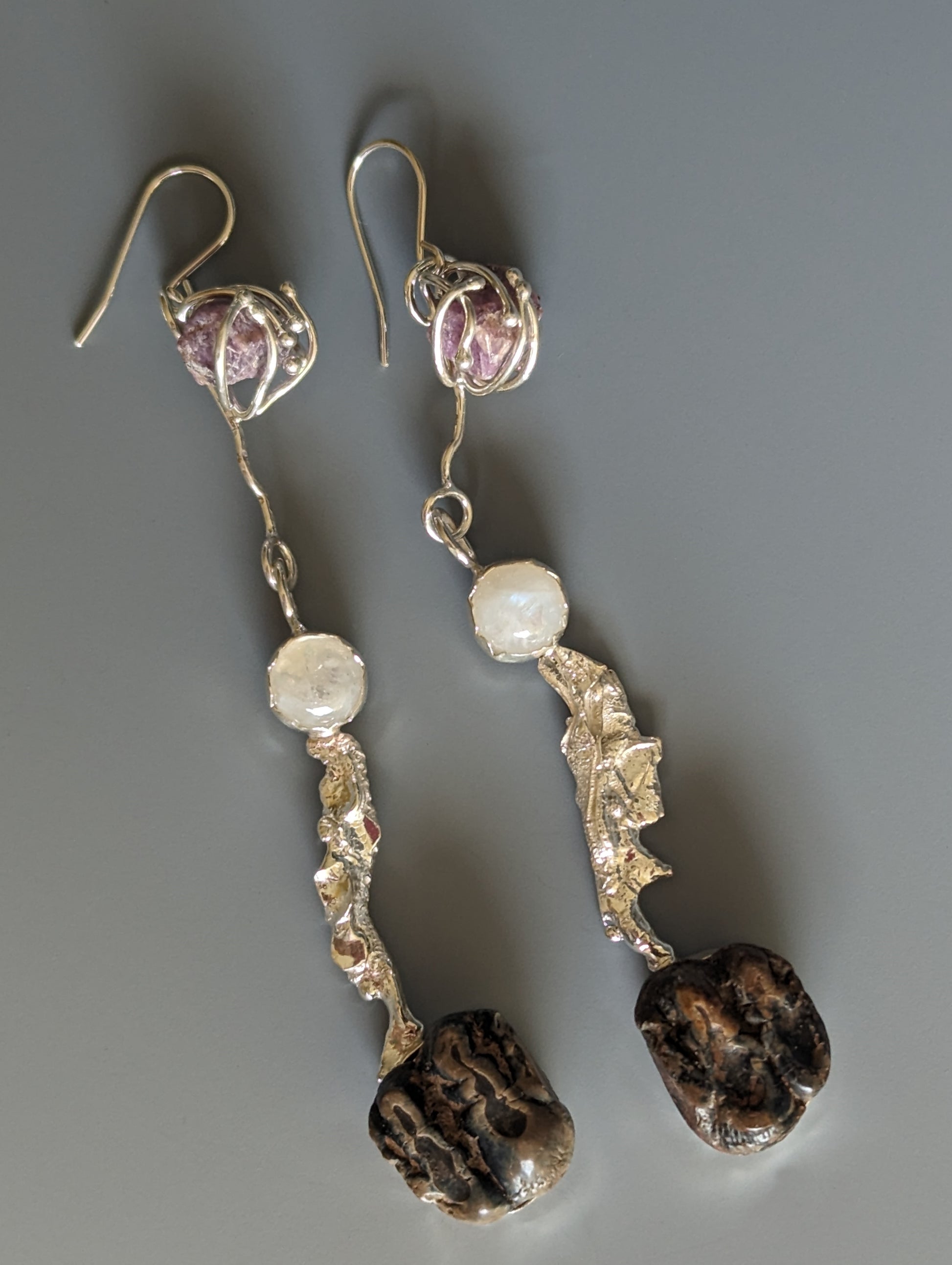 These eco-friendly earrings are part of my Urban Archaeology collection, a question of what future generations might think of us. These pieces feature chunks of tortured silver, recycled scraps that have been fused to form surprising and intriguing forms. Natural gems and ancient relics join in unexpected combinations. These jewels will never fail to inspire conversation!