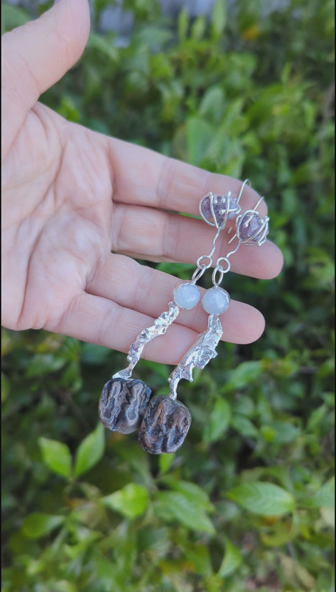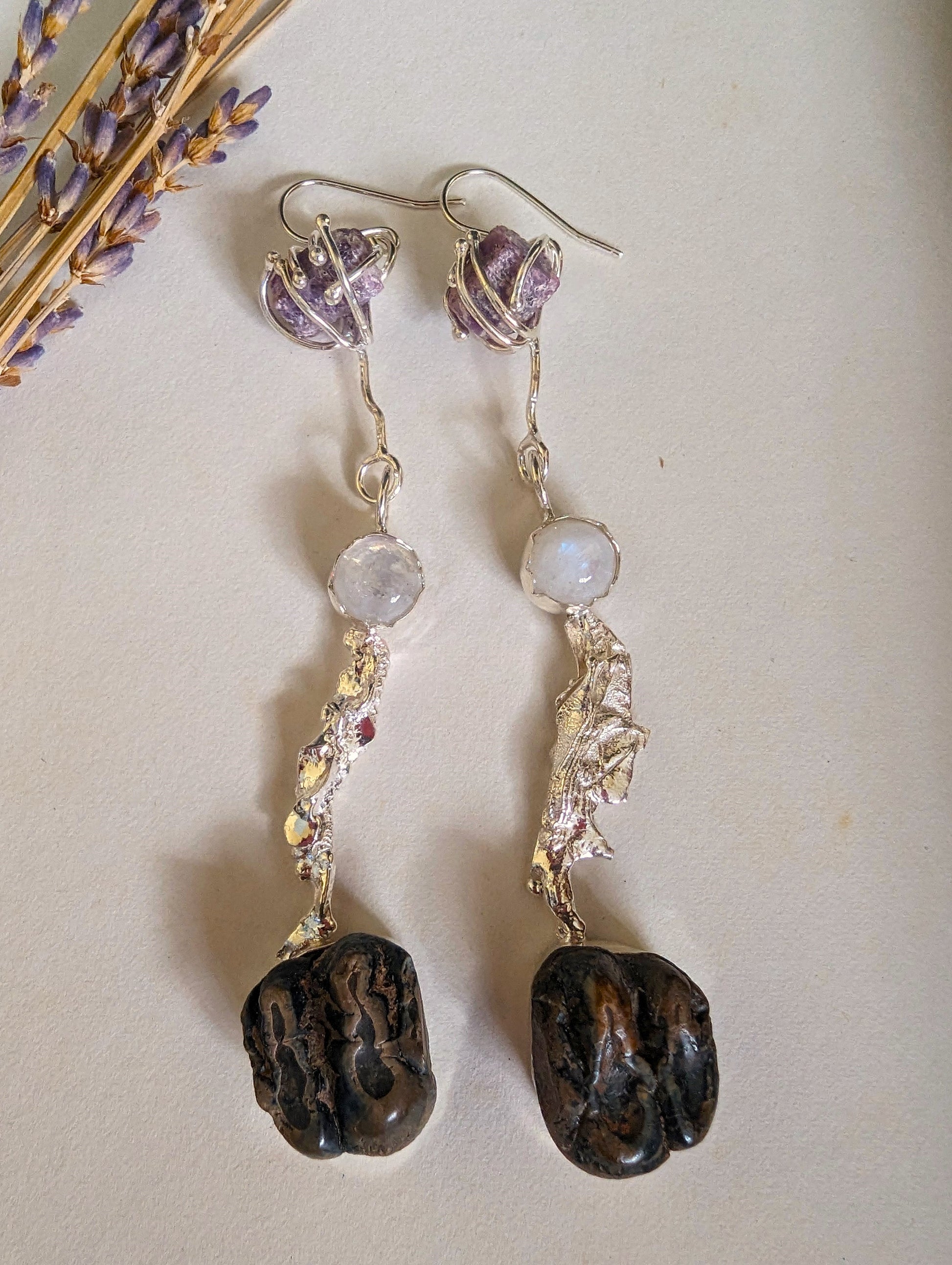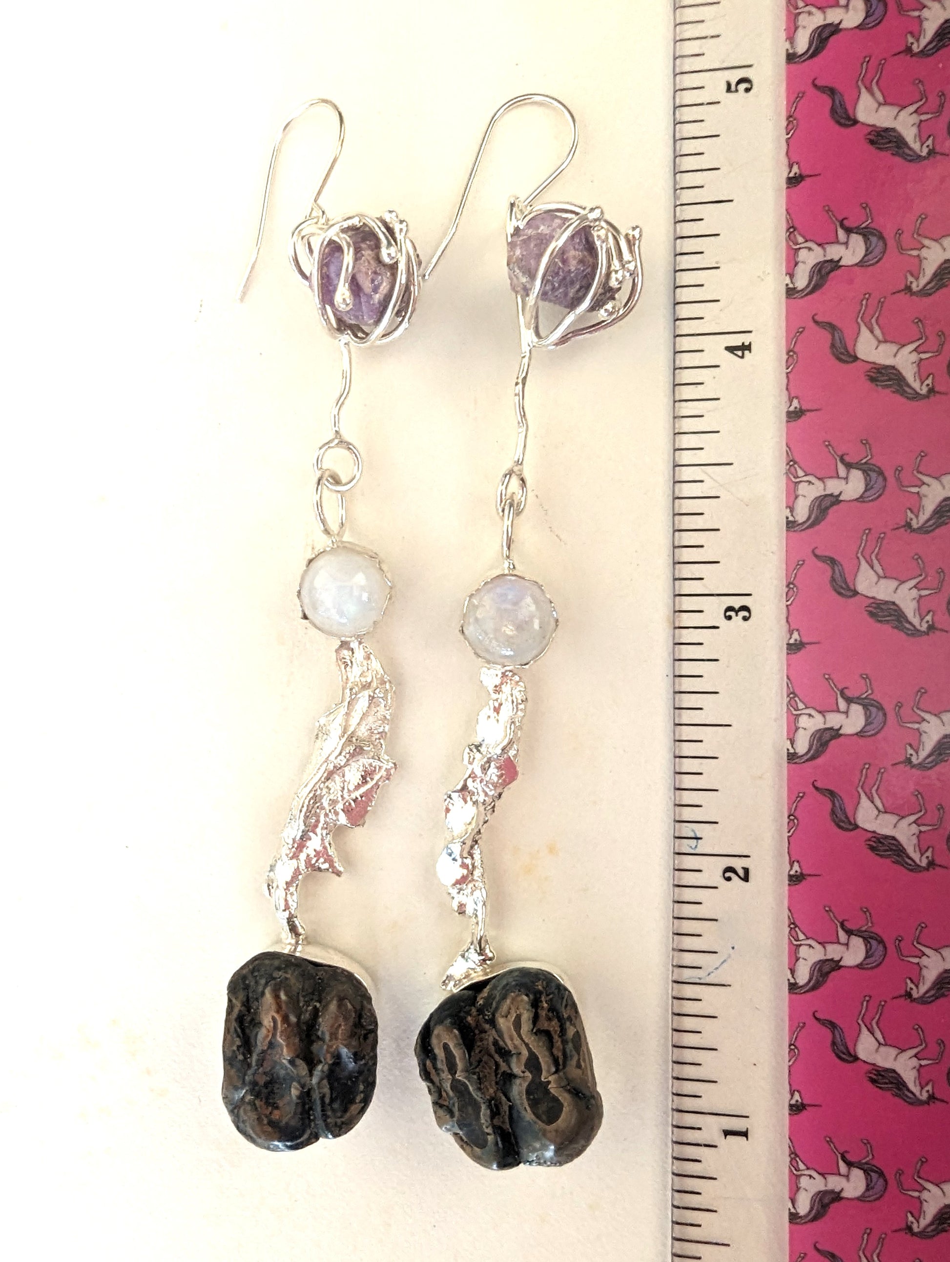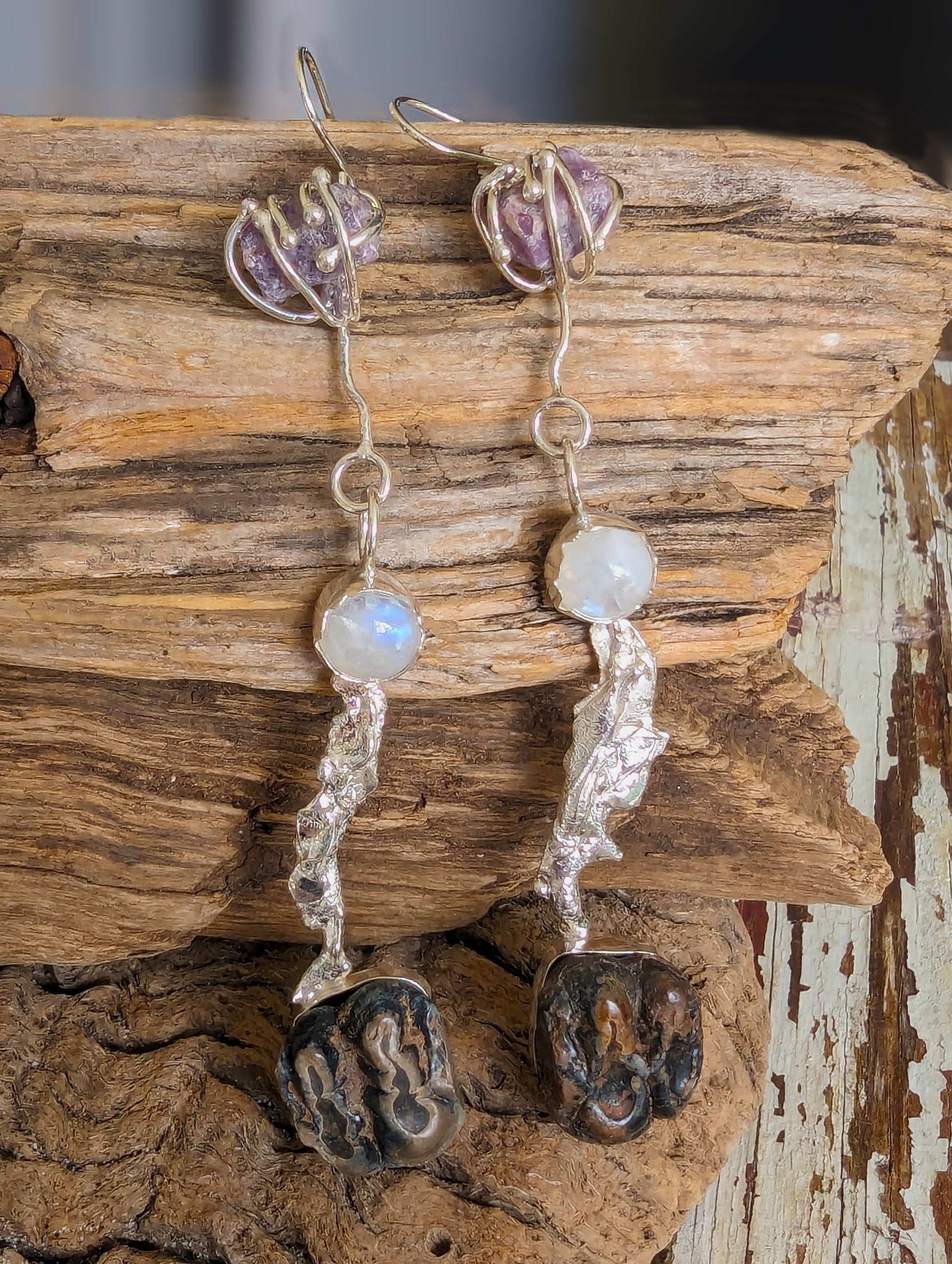 This handmade pair of funky bohemian long dangle earrings exude a captivating charm, blending elements of nature and artisanal craftsmanship. Crafted with meticulous care, they are an eclectic fusion of materials, each contributing to their unique allure. The base of these earrings is forged from sterling silver, expertly fused and shaped to form an unique framework. This sterling silver foundation serves as a canvas for the other natural elements to shine. Raw rubies top the dangles, with their rich hue and raw, uncut beauty, are tightly grasped in silver claws. Swinging below the rubies are glowing rainbow moonstones, each exhibiting a mesmerizing play of iridescent colors. These moonstones lend an ethereal quality to the earrings, casting a subtle glow that dances with movement. Adding a touch of whimsy and intrigue, fossilized manatee teeth adorn the lower ends of the earrings. These unique and rare elements, with their organic texture and earthy tones, imbue the earrings with a sense of mystique and connection to the natural world. The freeform design of the earrings is long and dangle, creating a graceful silhouette that sways gently with the wearer's movements. With their eclectic mix of materials and bohemian flair, these earrings are not just accessories but wearable works of art, each pair telling its own enchanting story.