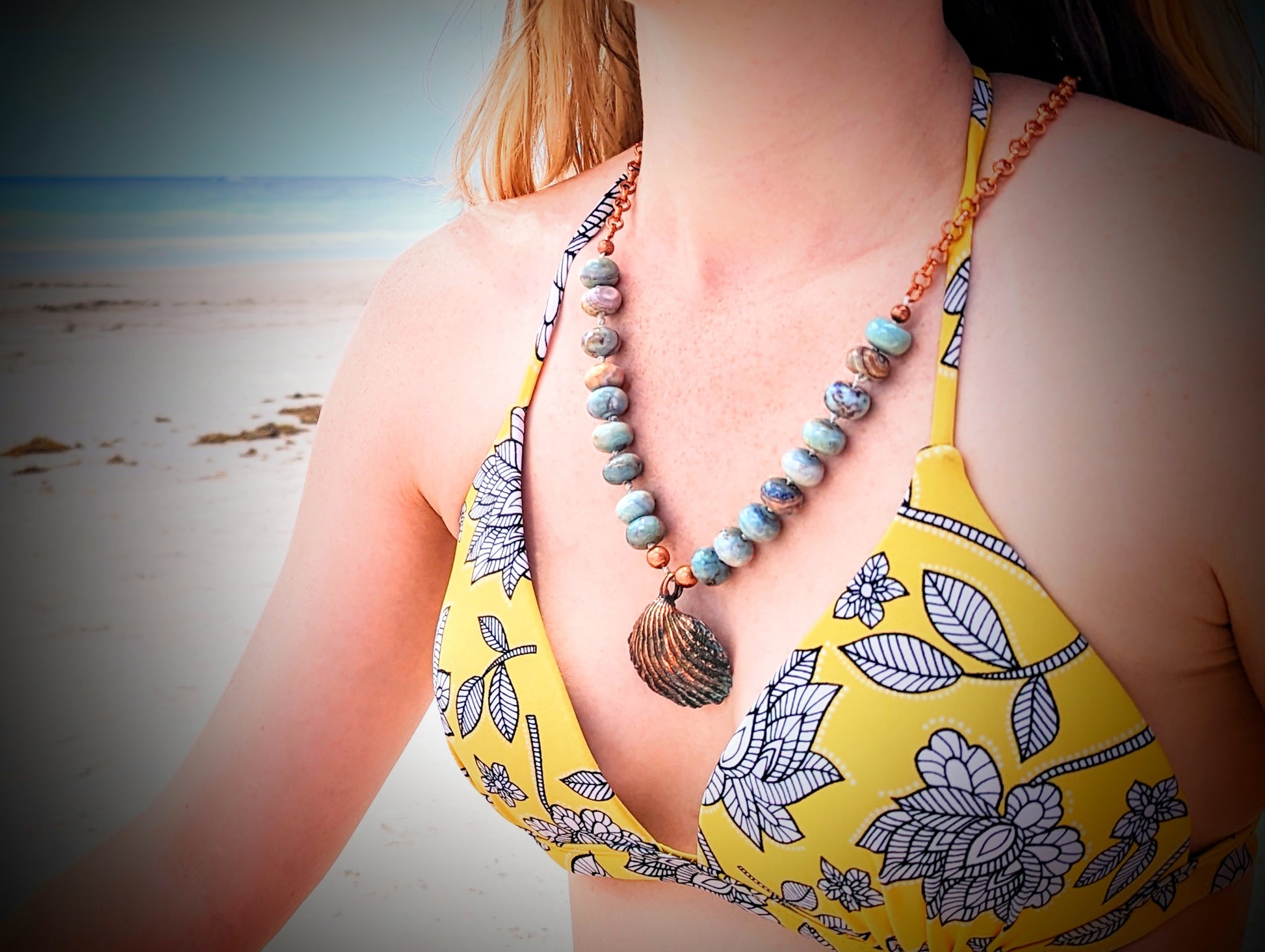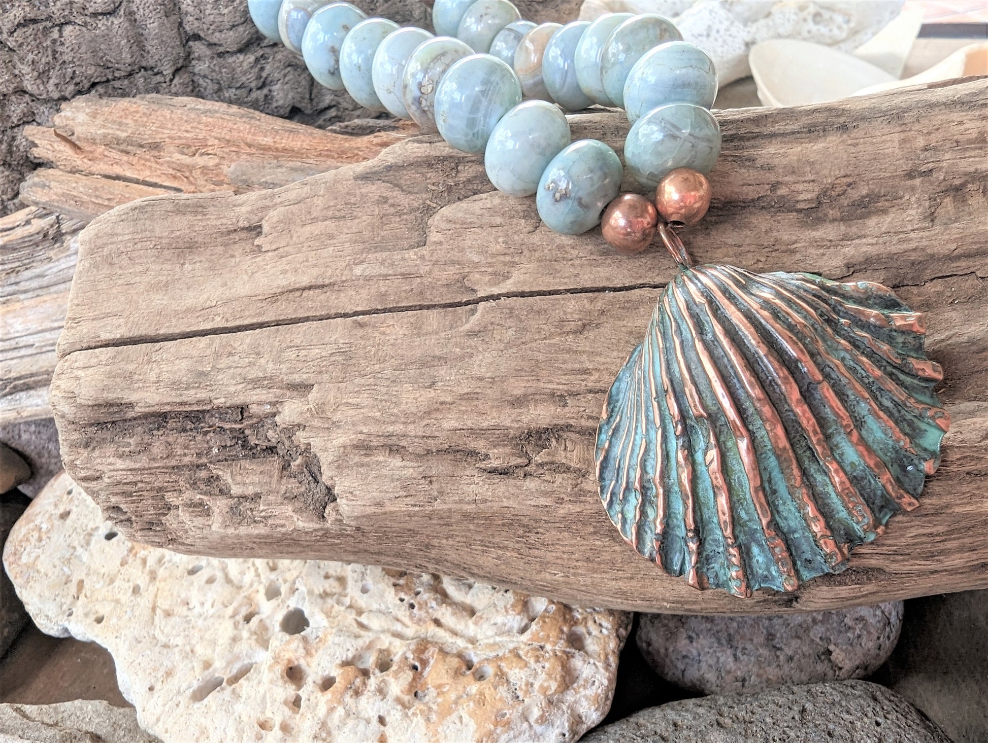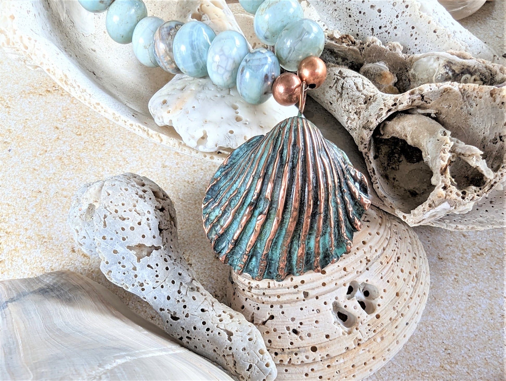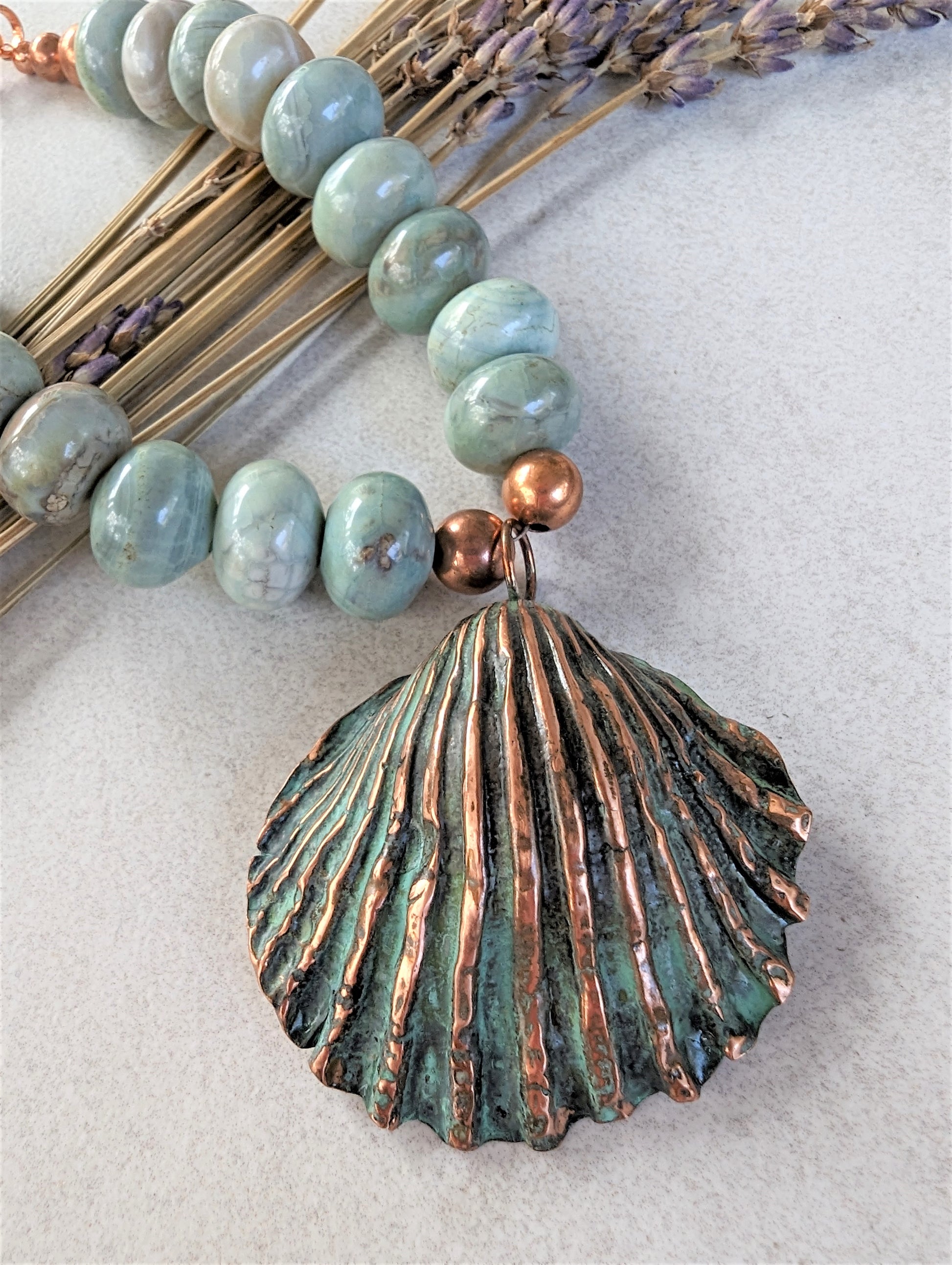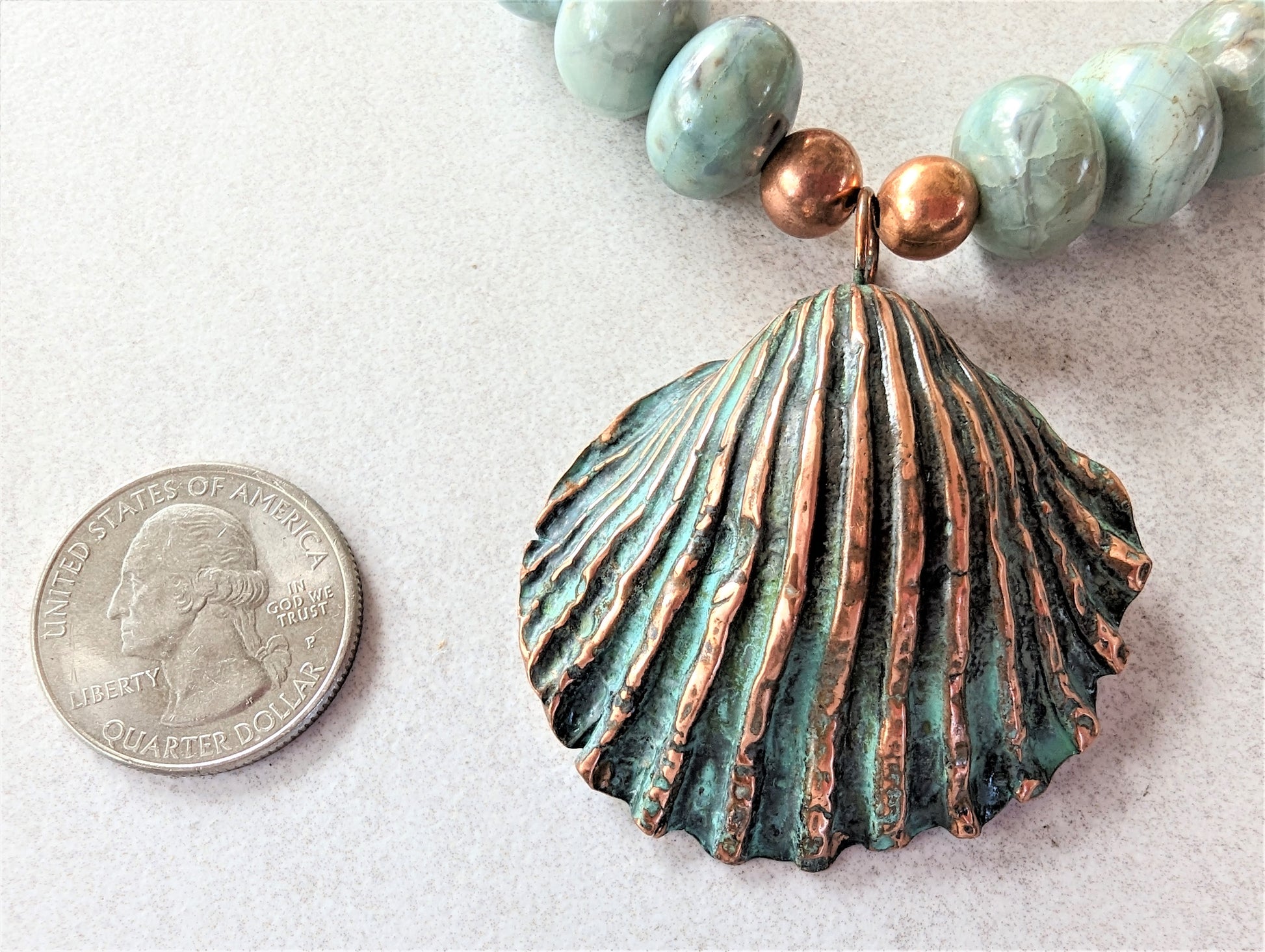 This pendant is a replica of a shell I picked up on the beach on the east coast of Florida. It was created using eco-friendly copper metal clay and a mold I made of the shell. The size of the pendant is substantial, about 2 1/2", making it a statement piece that commands attention. The antique verdigris patina is achieved by treating the surface of the copper with a special oxidization process. Over time, this process creates a rich greenish-blue patina that mimics the natural weathering of copper exposed to the elements. The patina adds a sense of history and character to the pendant, giving it an aged and timeless look. The pendant is suspended from a hand-knotted chain of chunky blue-green dragonskin agate. The creamy color of the agate along with its swirling veins blends beautifully with the warm hues of the copper and the patina. The necklace is finished with a heavy copper chain and a beautiful copper S-hook embellished with aquaterra jasper.