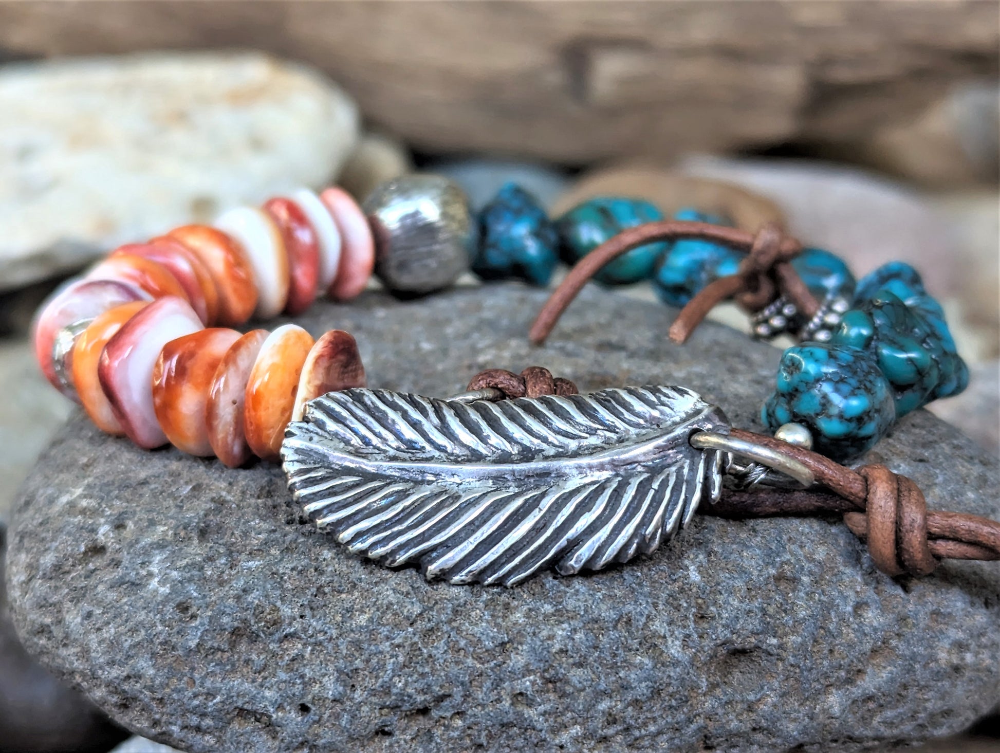 This bracelet is a beautiful combination of natural turquoise nuggets and bright, colorful spiney oyster beads, with accents of shiny silver. The effect is a typical southwest style, although that was not my original intent! I began with the feather, which I carved by hand from fine silver metal clay. I wanted to make a bracelet with the luscious turquoise, and what goes with turquoise better than my favorite spiny oyster? I added the silver bead which I handmade and textured also of fine silver metal clay, and a couple of other fine silver tube beads for extra sparkle. All of that begged for the feather, and the perfect use for the feather was as the closure with soft knotted leather. The leather comes from Texas where is was processed with environmentally friendly chemicals and dyes. So the evolution of the bracelet was just of parts that I happen to love, which turn out to be of a certain style! I am a Florida girl, the beach is my vibe. I don't intentionlly appropriate anyone else's culture, but I can't help it if I love the same stones!