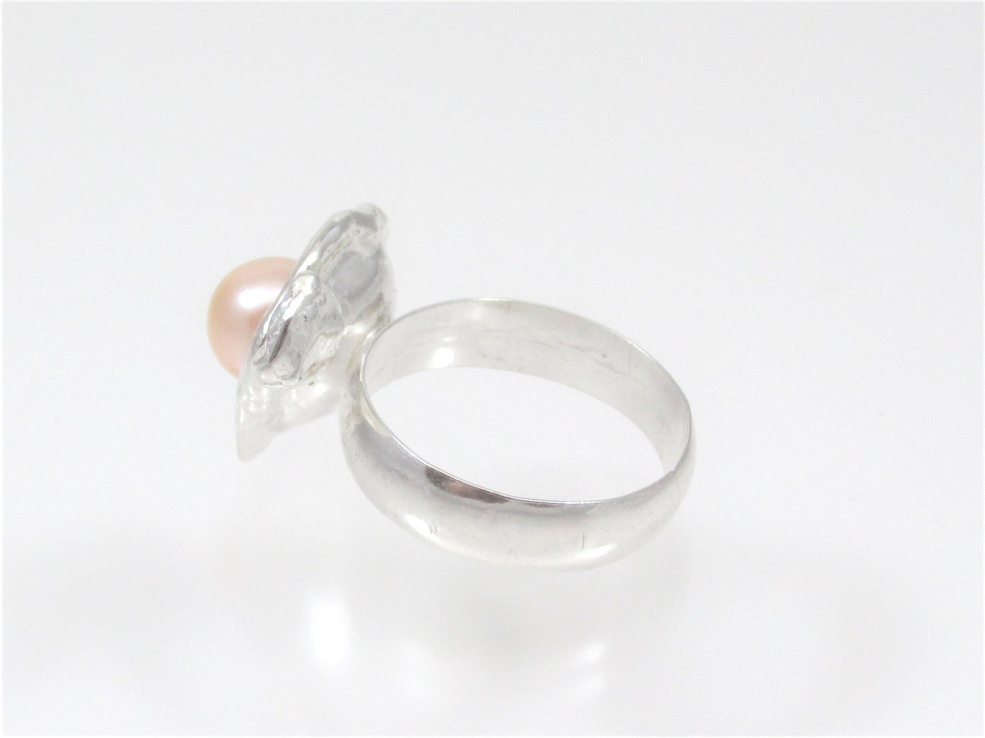 This ring is the definition of OOAK! I melted sterling silver scrap and poured it into water creating lots of fascinating little splats and splooshes! I picked one of the prettiest cups and soldered on a second tiny one for a mini cascade, then set a luscious peach freshwwater pearl in the center. A little bitty oyster for your finger? A 3-D photo of a pearl hitting water? Make of it whatever you like, it's a pretty, fun little ring that is truly versatile.
