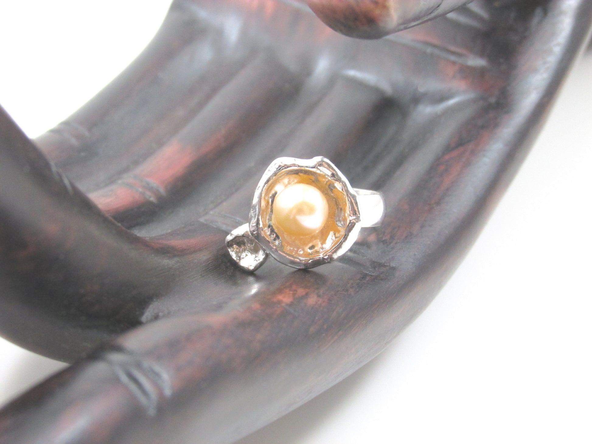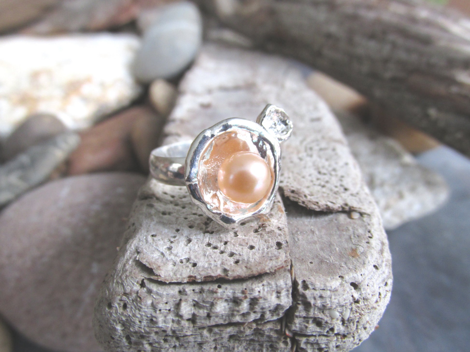 Eye-catching ring with a lustrous peach colored pearl set in an organically shaped cup of silver, with another little silver "sploosh" beside it!