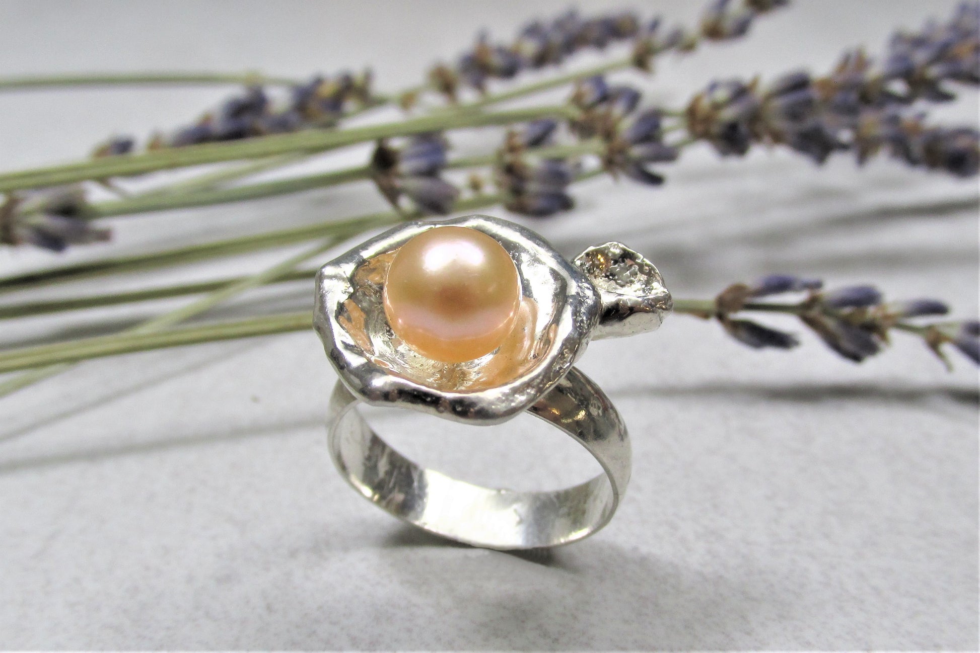 Peach Pearl in Silver Water Droplet Ring, Eco-Friendly Recycled Silver Ring, Unique Artisan Bohemian Jewelry