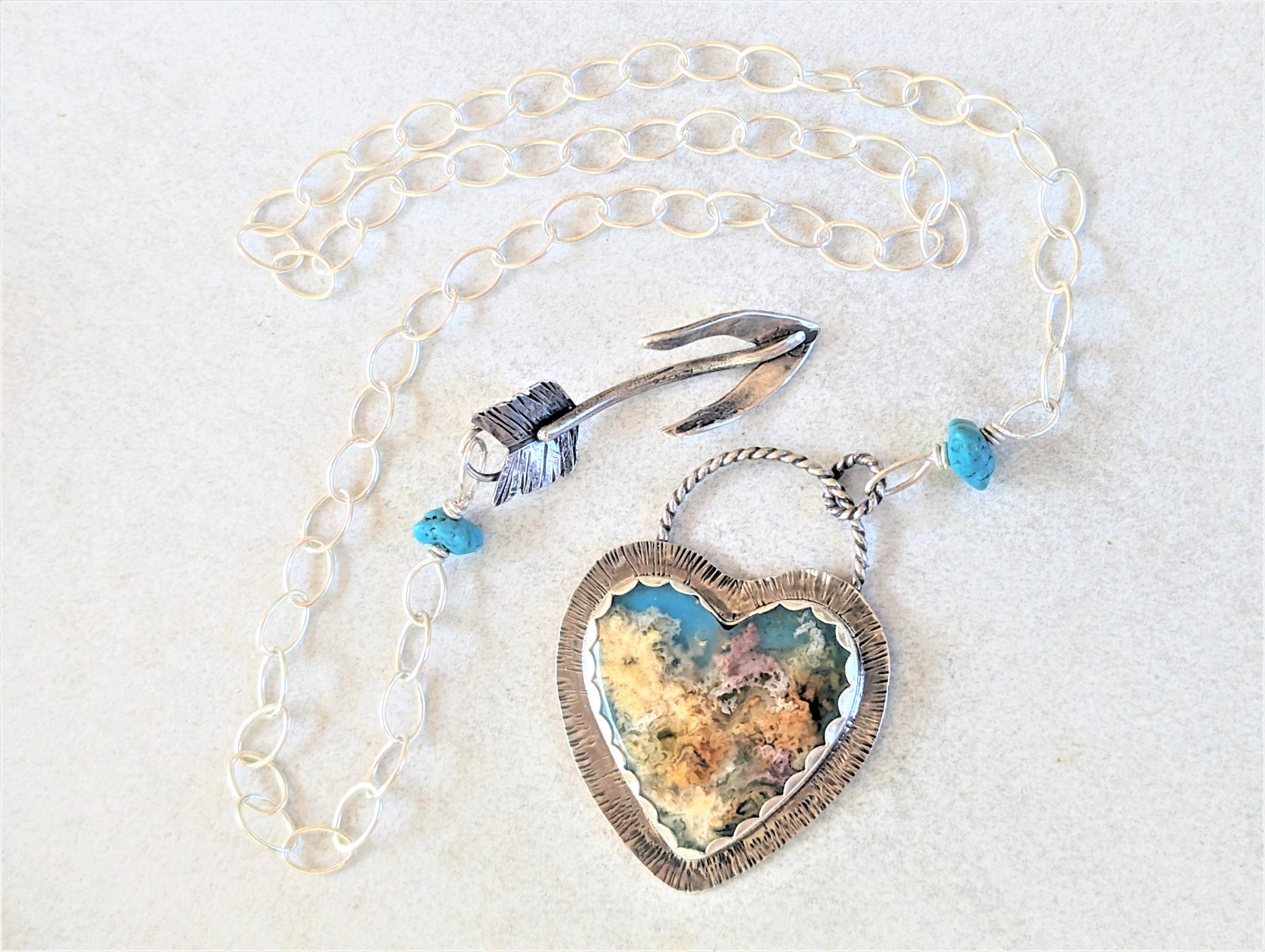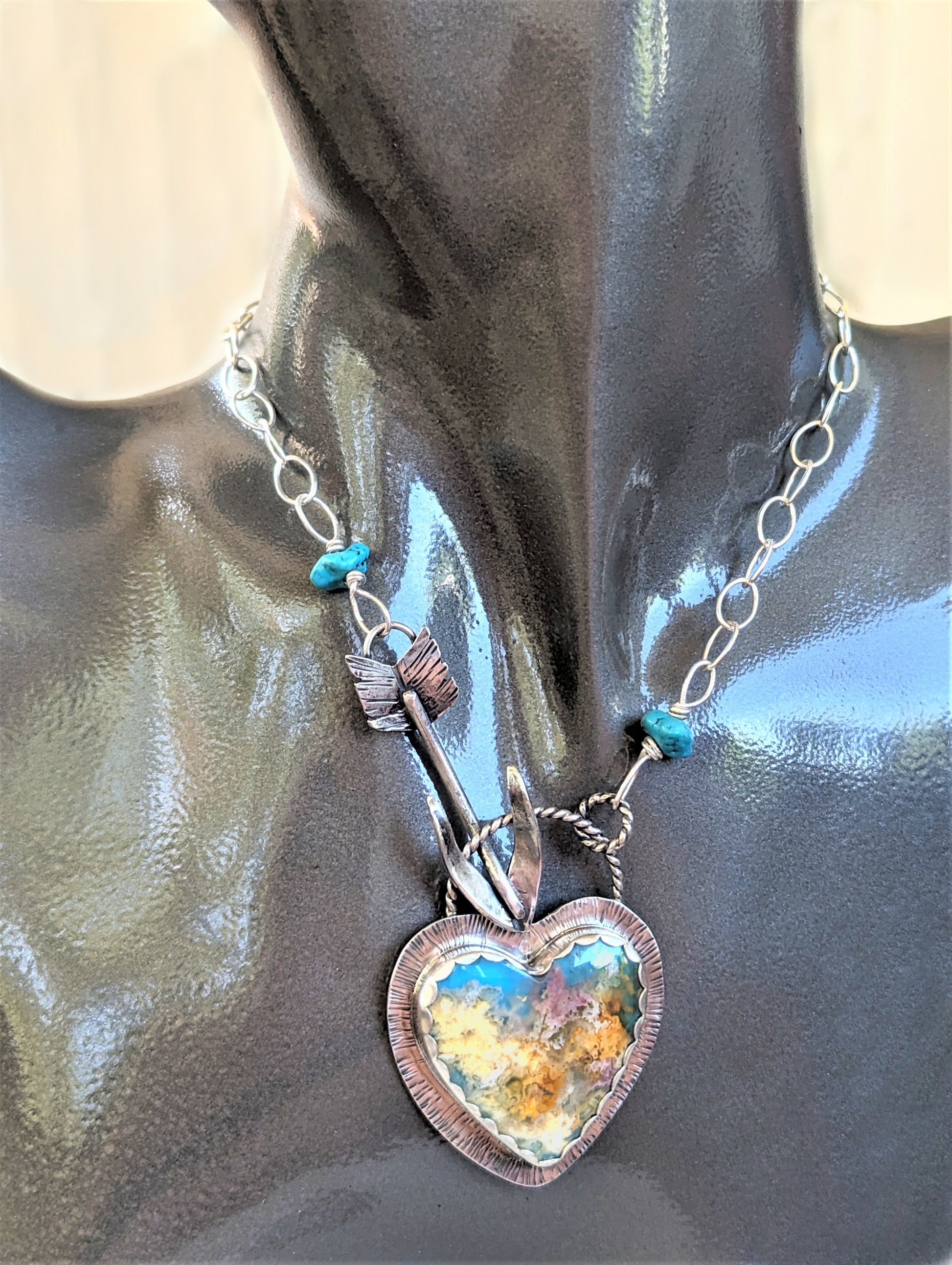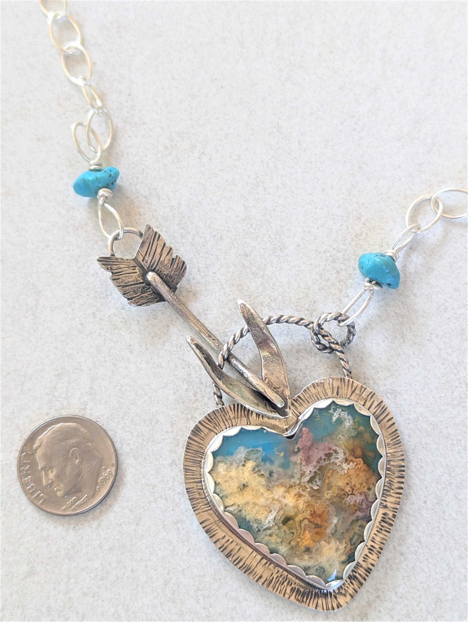 This pendant features a heart-shaped regency plume agate gemstone that has been carefully selected for its captivating patterns and colors. Plume agate is known for its delicate and intricate formations resembling living flora underwater, giving it a mesmerizing and ethereal quality. This piece has been backed with reconstituted turquoise for the amazing depth and color. The pendant is adorned with a handmade silver arrow clasp, which adds a touch of elegance and symbolism. The arrow clasp represents direction, aspiration, and the pursuit of one's goals and dreams. Or perhaps it's Cupid's message! The pendant hangs delicately from a silver chain, embellished with turquoise nuggets, allowing it to be worn close to the heart. It is a distinctive and meaningful piece of jewelry, suitable for both casual and formal occasions.