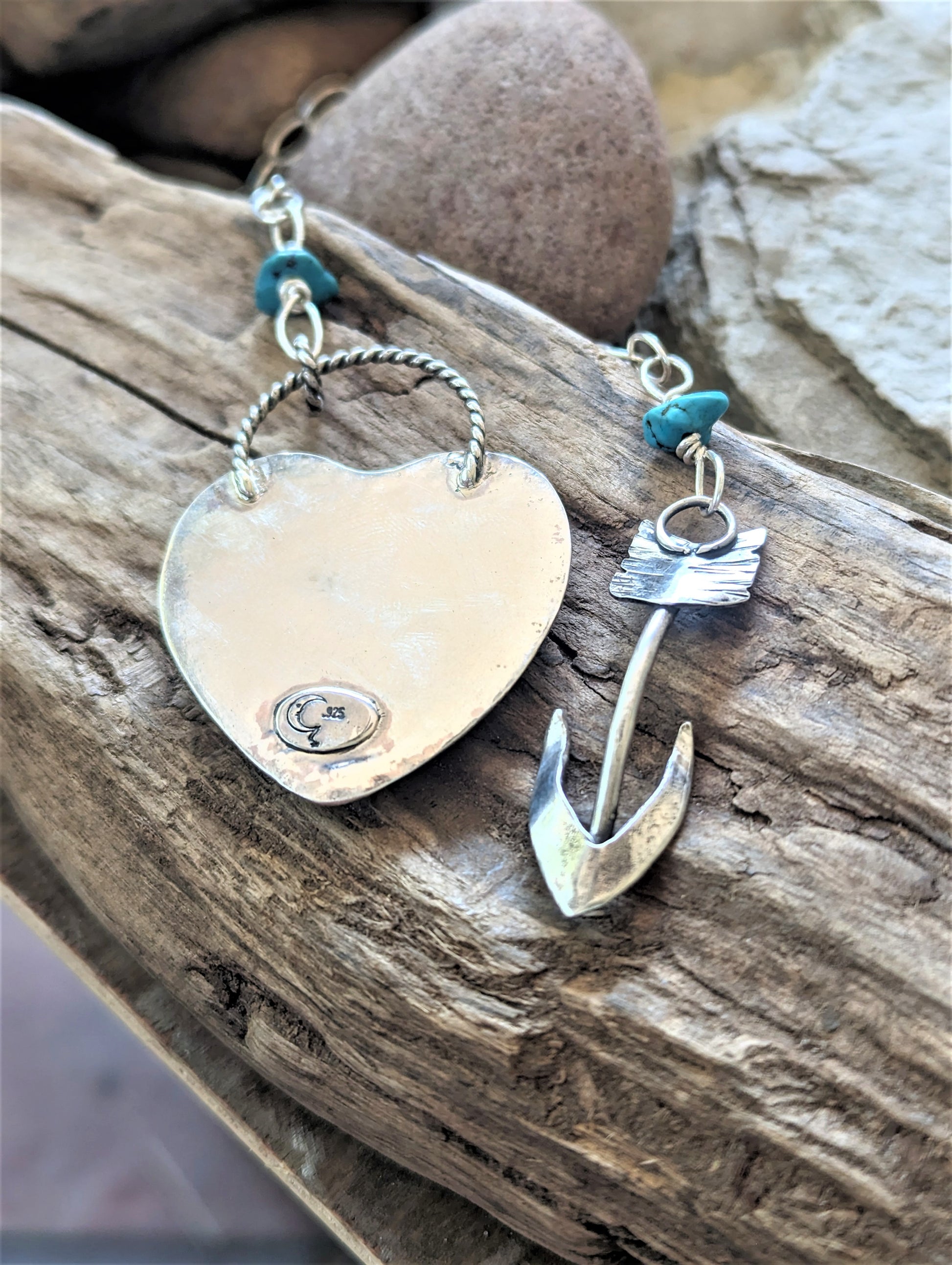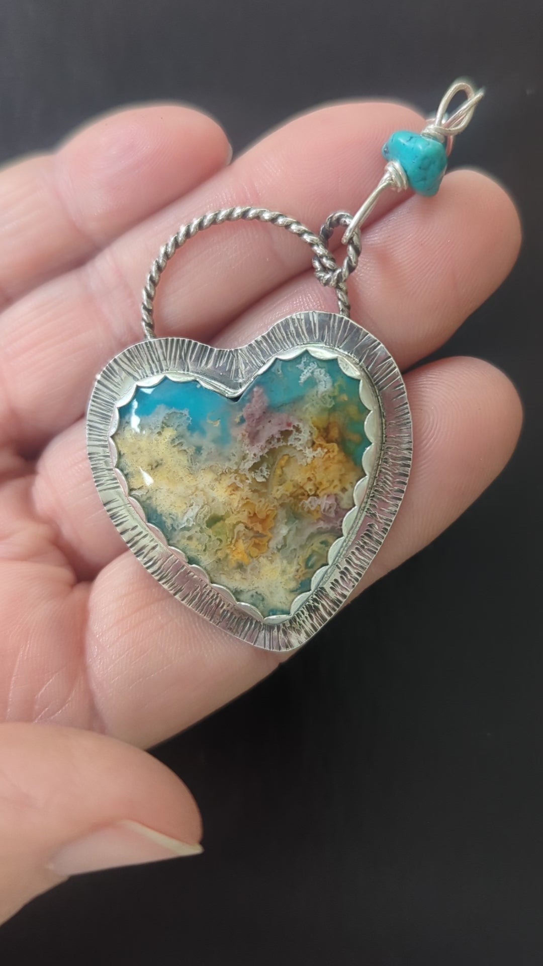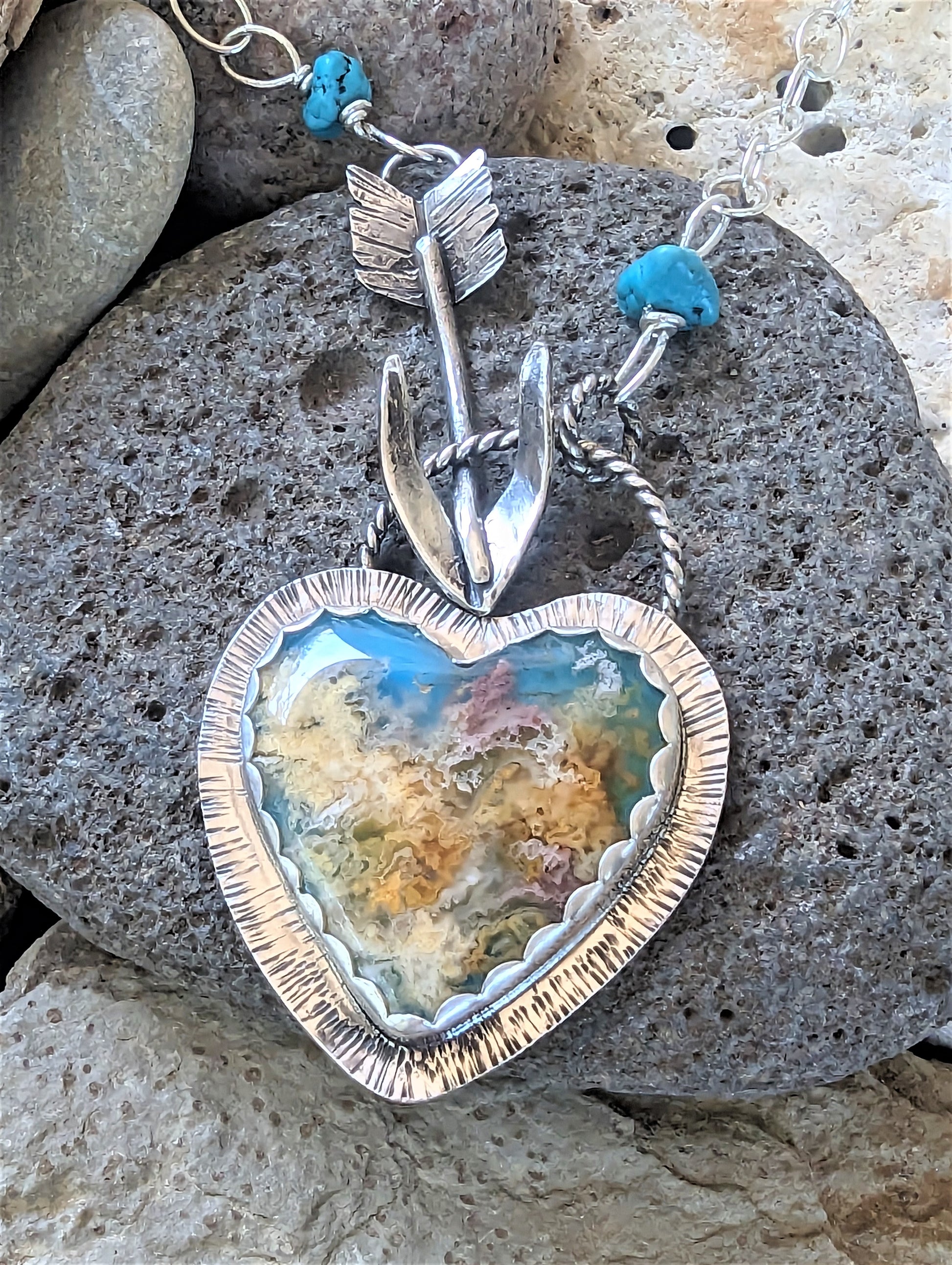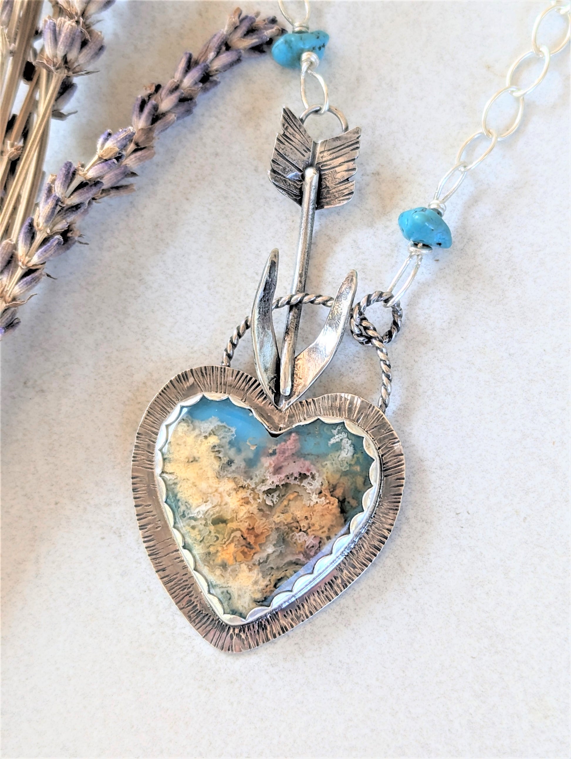 This pendant features a heart-shaped regency plume agate gemstone that has been carefully selected for its captivating patterns and colors. Plume agate is known for its delicate and intricate formations resembling living flora underwater, giving it a mesmerizing and ethereal quality. This piece has been backed with reconstituted turquoise for the amazing depth and color. The pendant is adorned with a handmade silver arrow clasp, which adds a touch of elegance and symbolism. The arrow clasp represents direction, aspiration, and the pursuit of one's goals and dreams. Or perhaps it's Cupid's message! The pendant hangs delicately from a silver chain, embellished with turquoise nuggets, allowing it to be worn close to the heart. It is a distinctive and meaningful piece of jewelry, suitable for both casual and formal occasions.