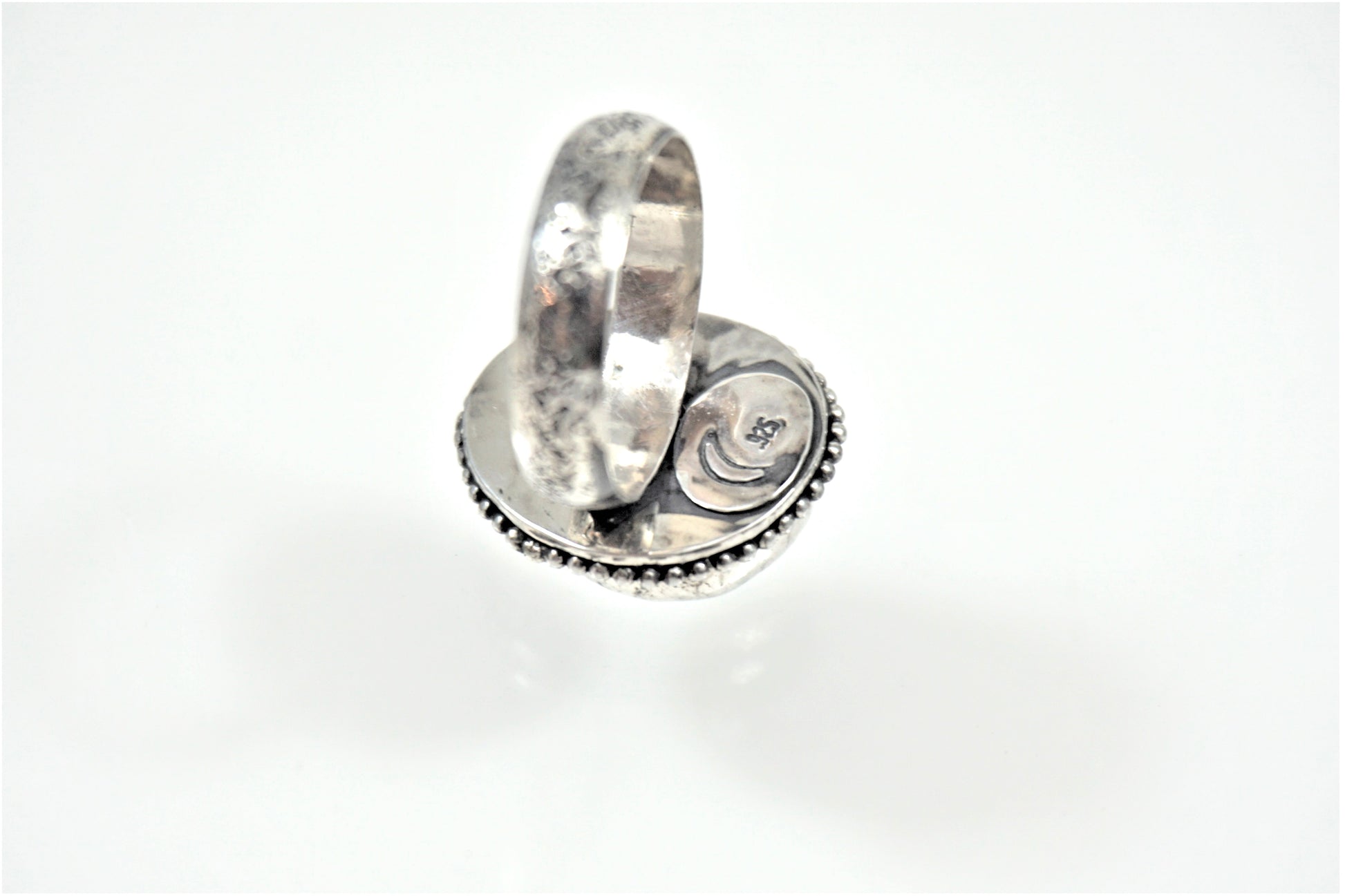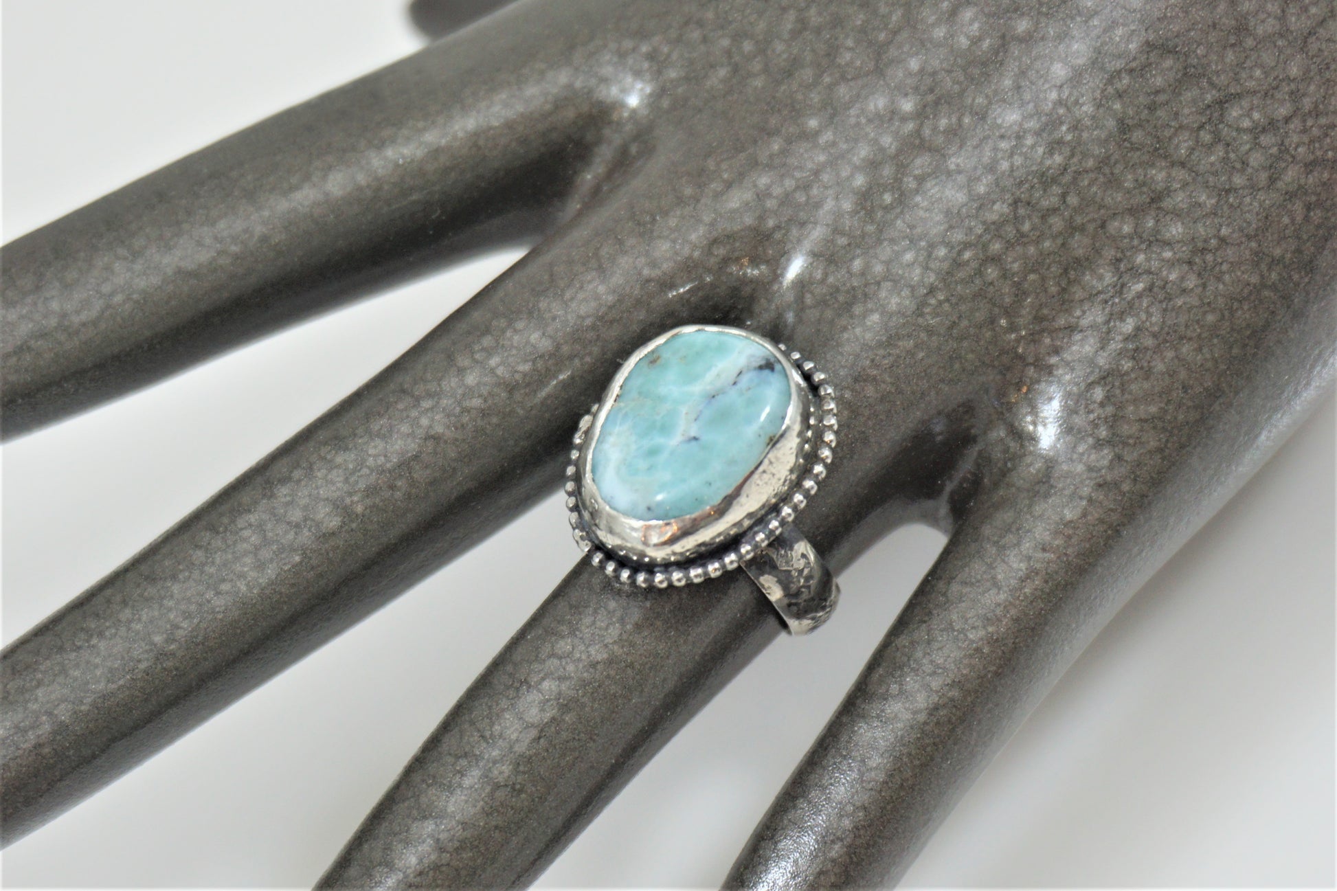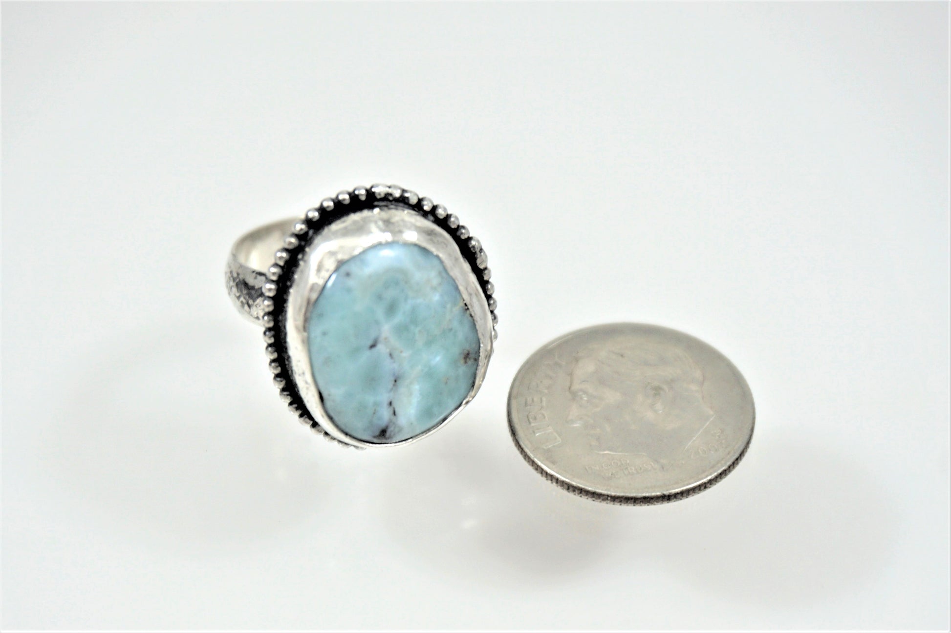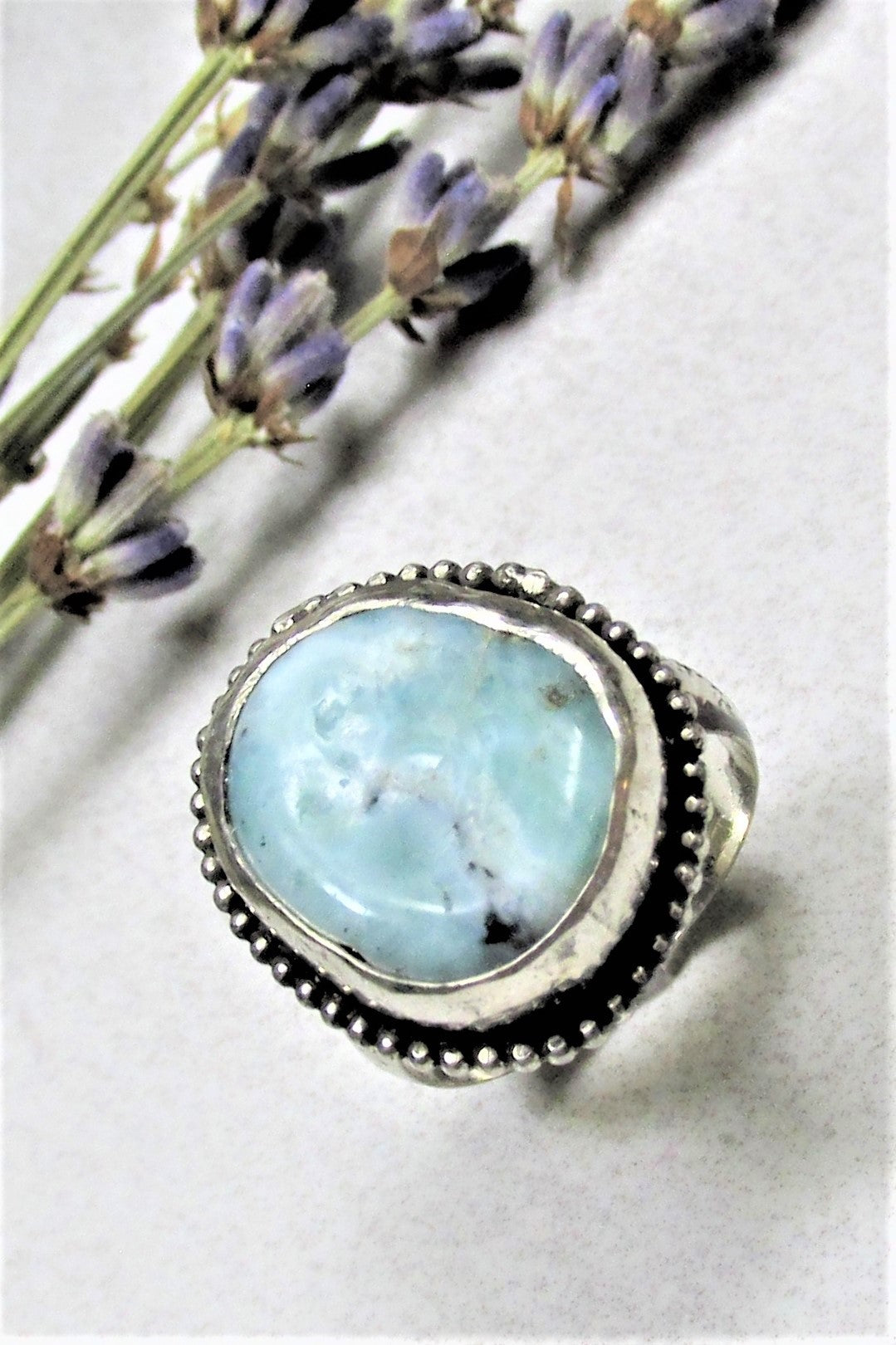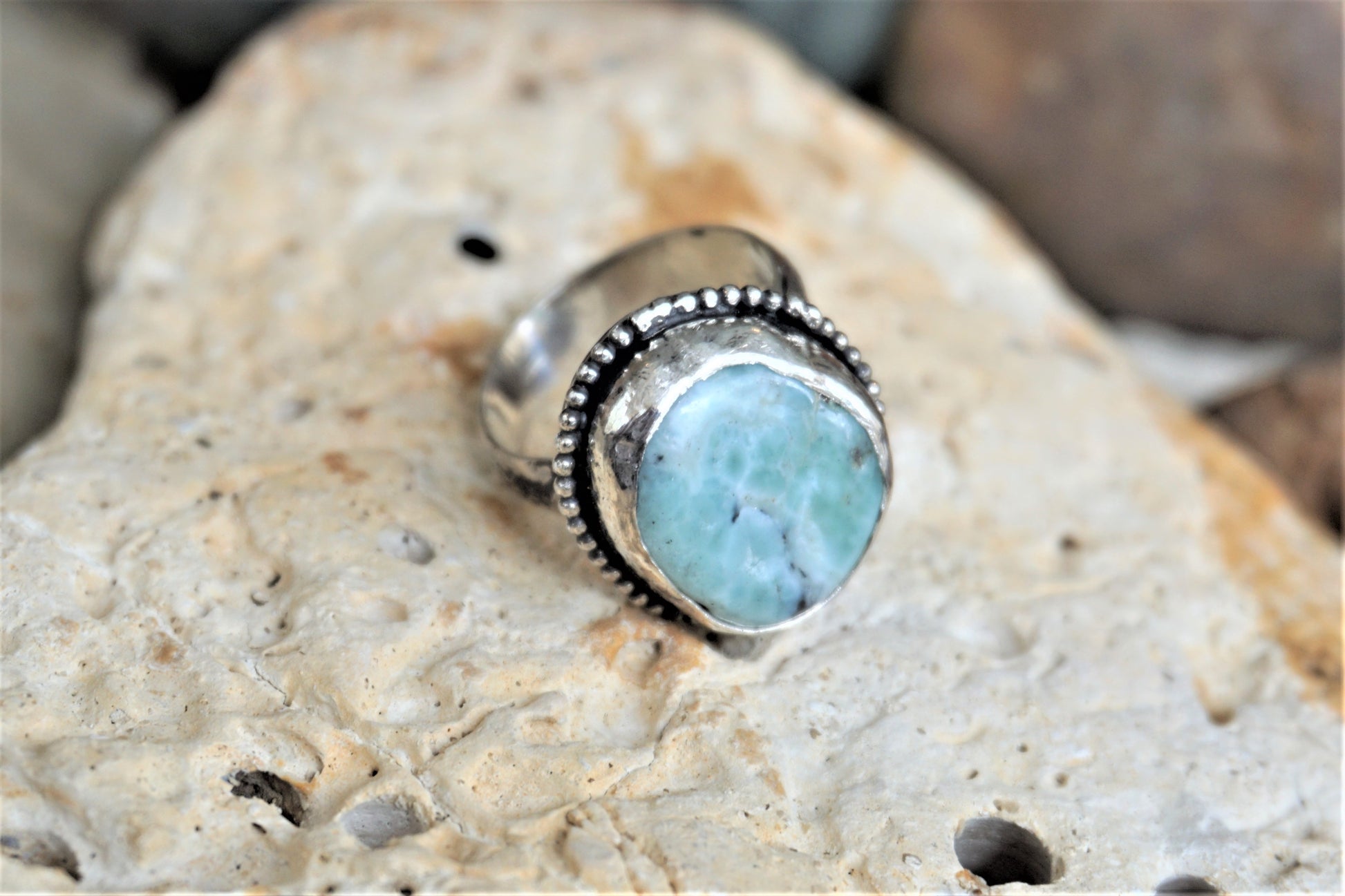 The unique ring is captivating blend of stylish elegance and rustic charm. It features a genuine larimar nugget, found only in the Dominican Republic, a stone known for its stunning sky-blue hues, reminiscent of the clear Caribbean waters of its home. The nugget has been left in its raw, organic shape, but polished to a high shine to enhance its natural beauty. The stone's swirling patterns resemble ocean waves, making it feel as though a piece of the sea has been captured within the ring. The setting of sleek, shiny silver and a ring of tiny balls lends an air of elegance that is offset by the random shape of the stone, and the weathered and textured form of the band. This ring exudes a rustic, earthy charm, perfect for those who appreciate nature-inspired designs and prefer a more laid-back genuine aesthetic.