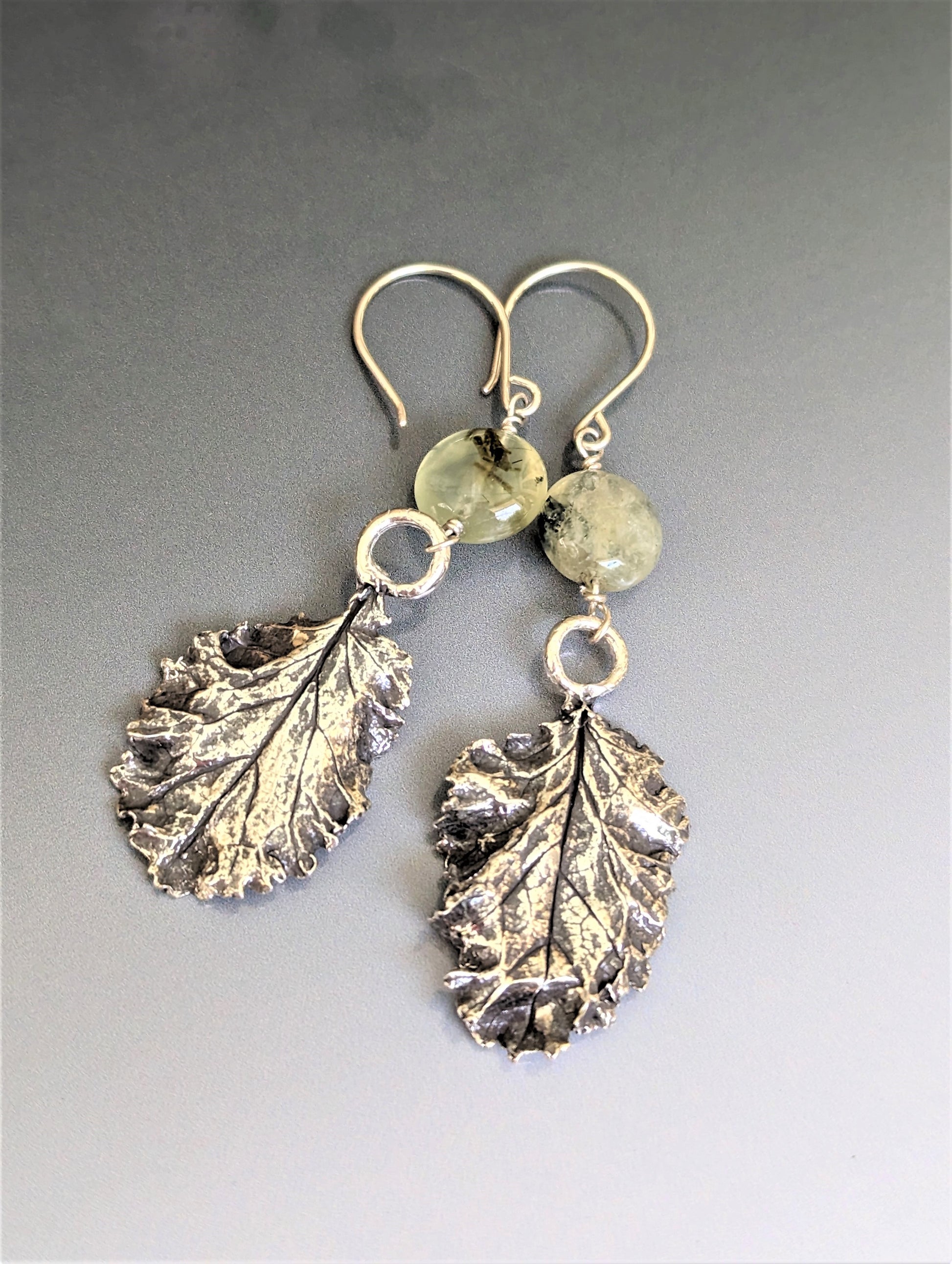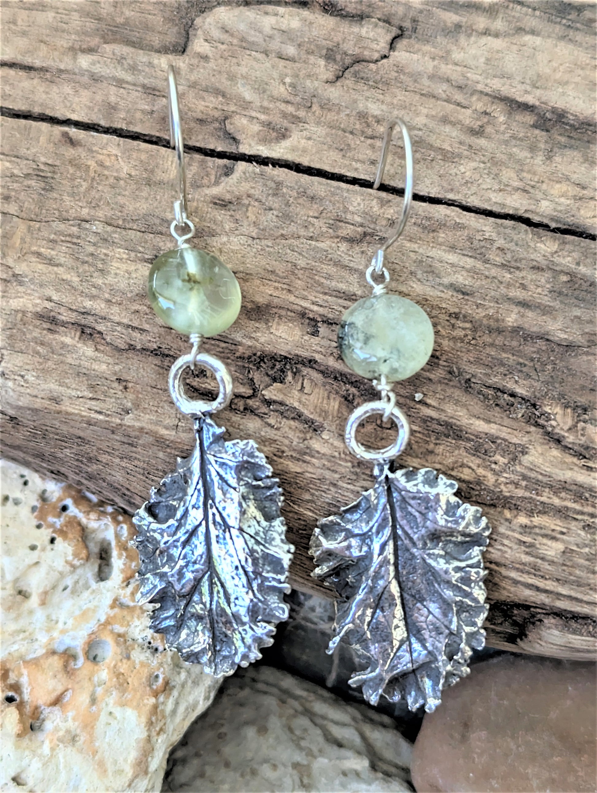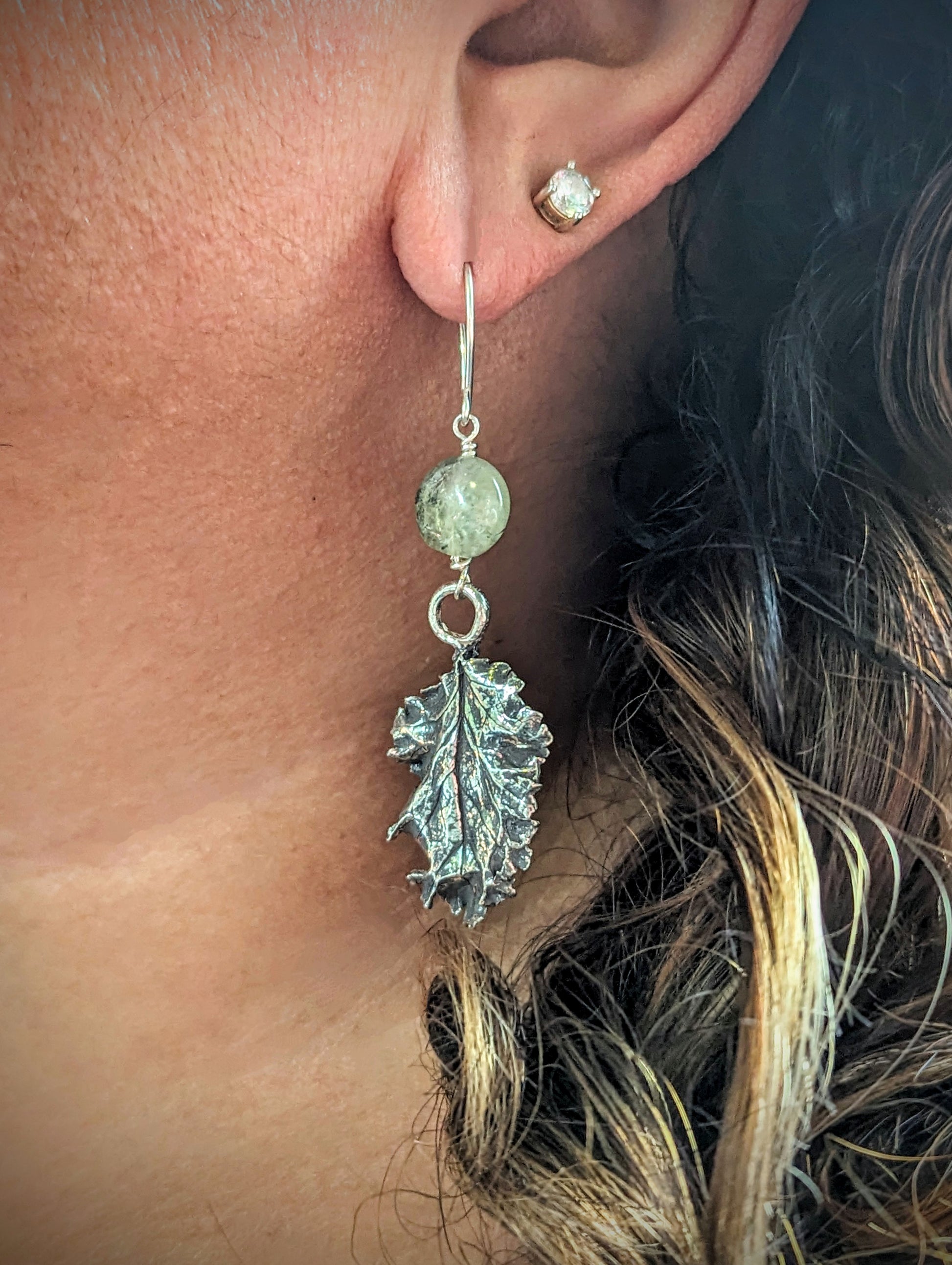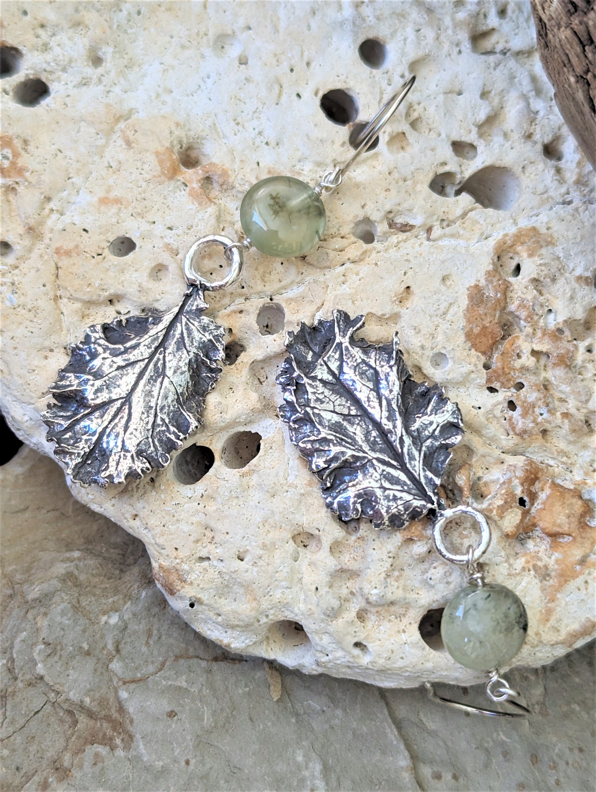 Unique artisan earrings made of real baby curly kale leaves with fine silver metal clay, dangling with orbs of watery green moss agate.