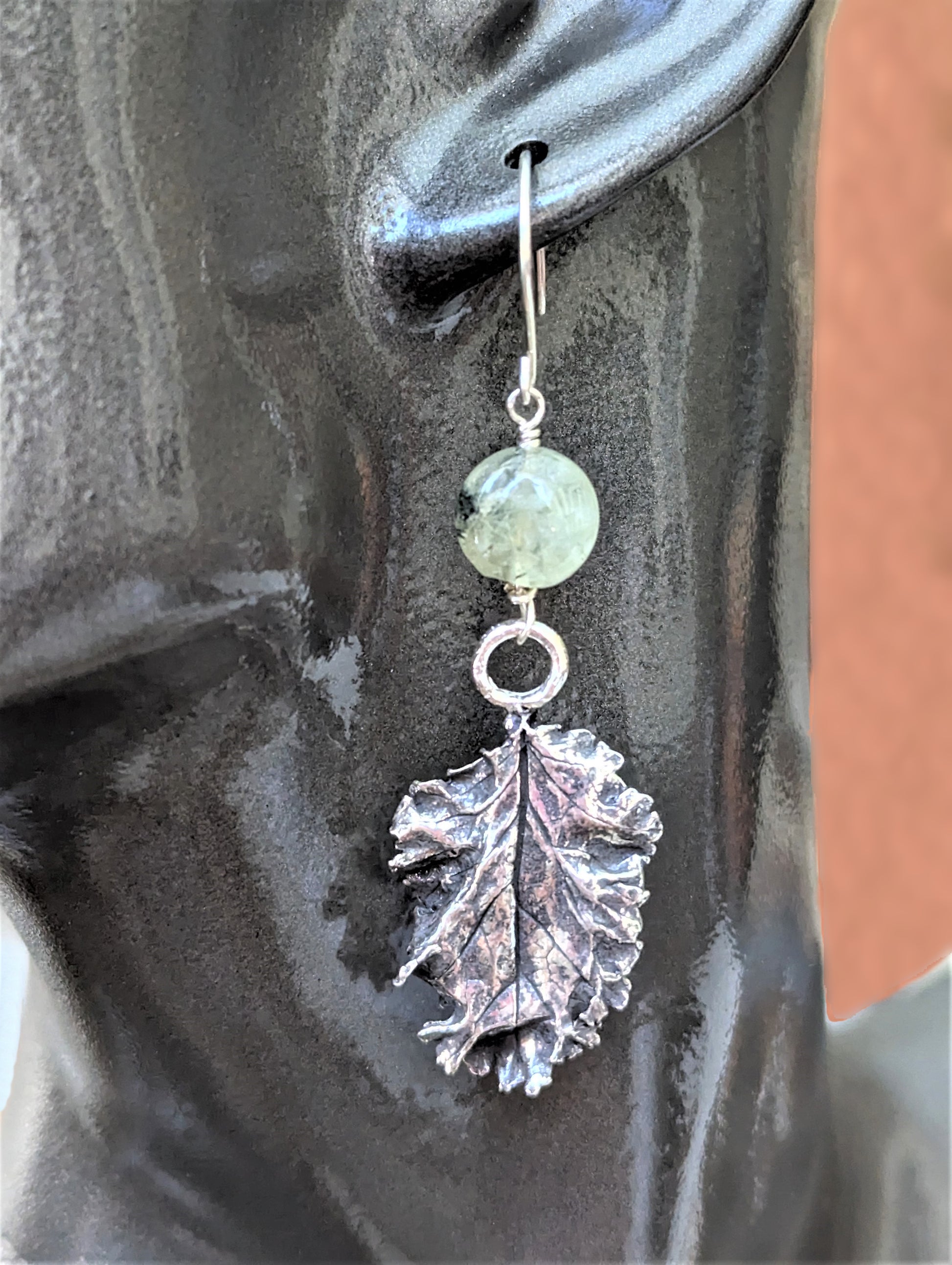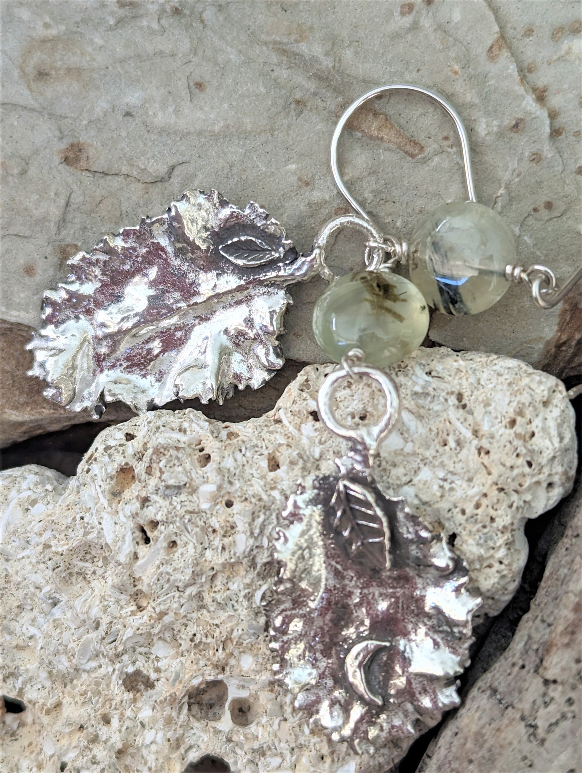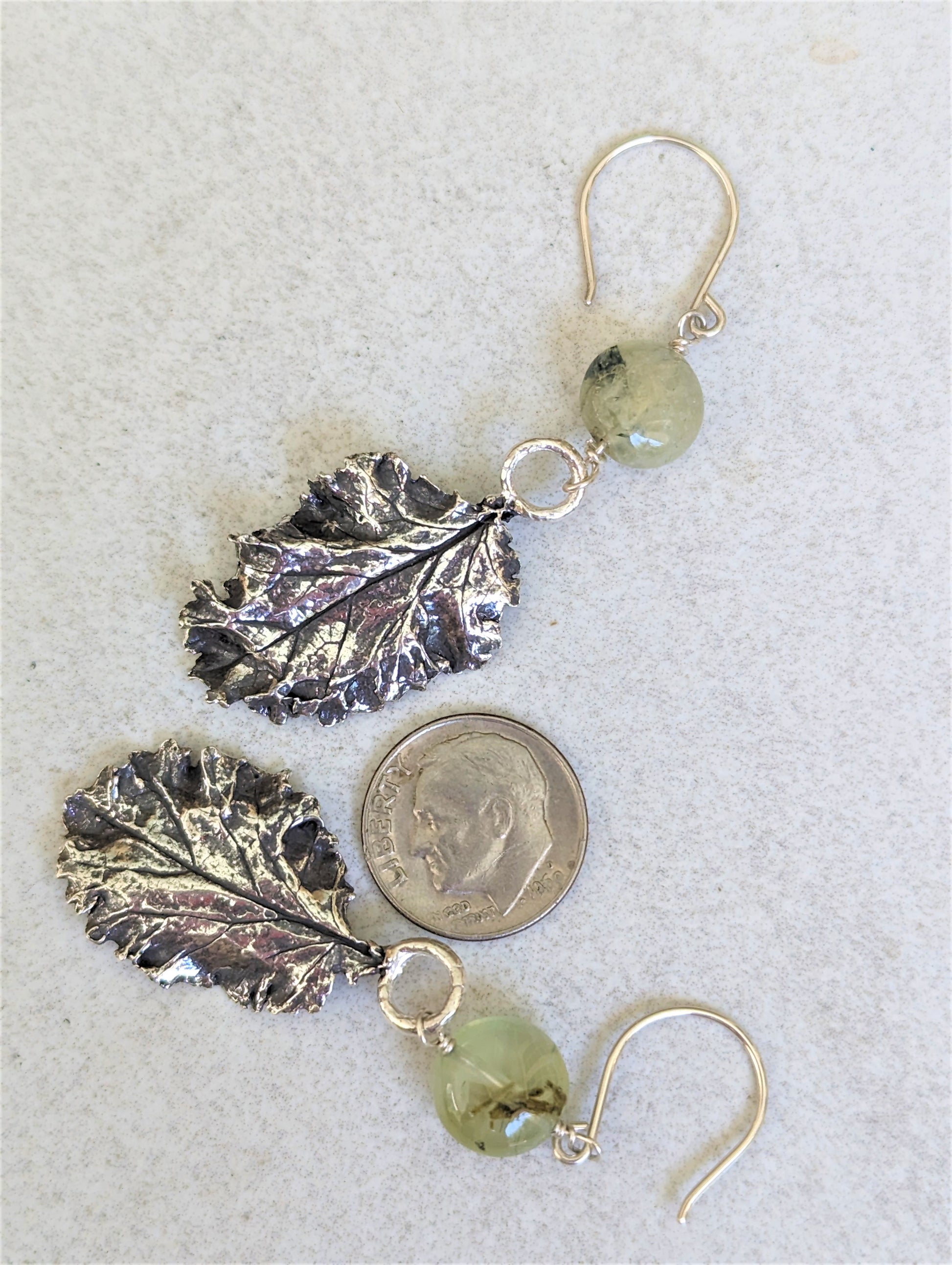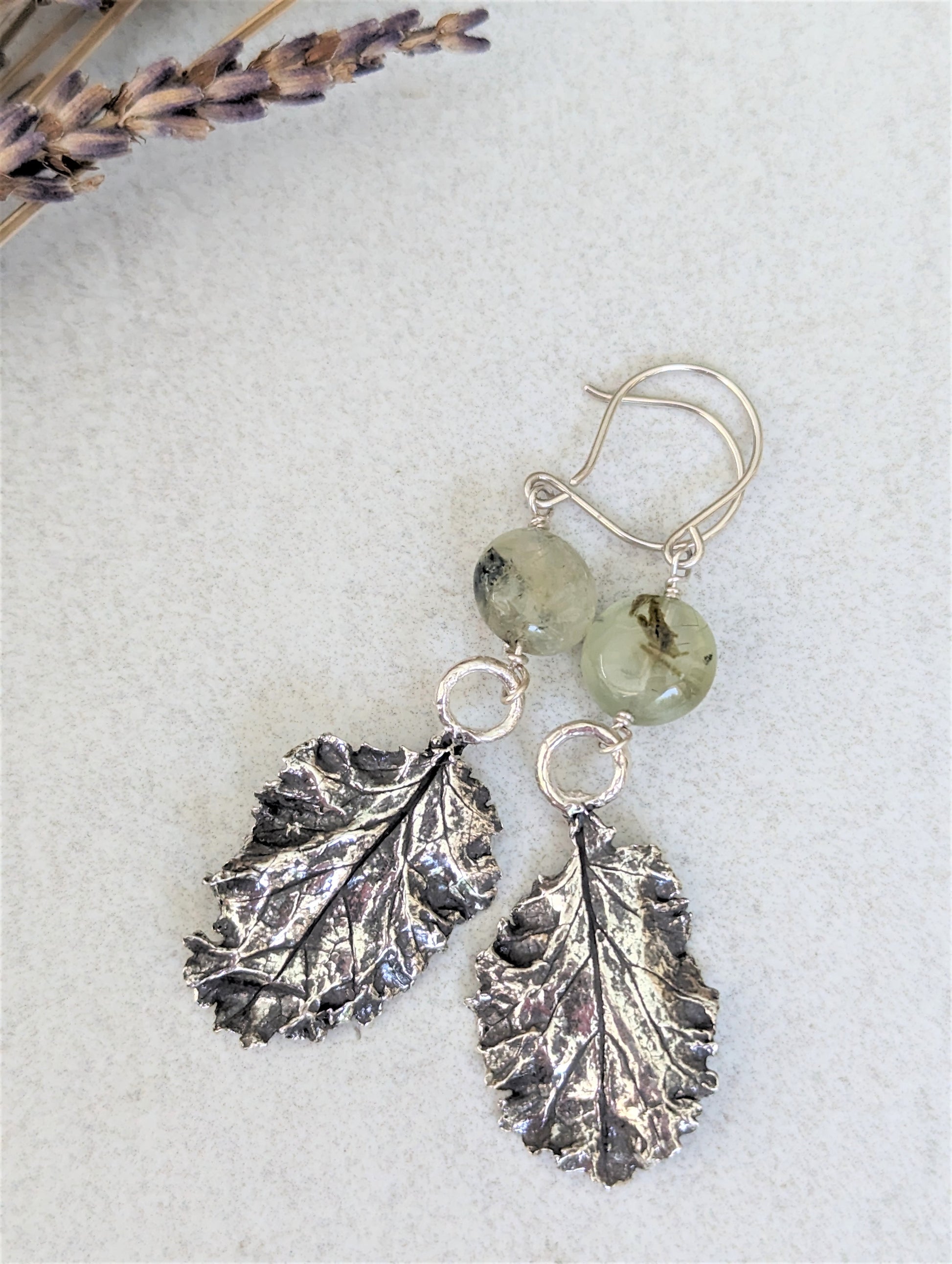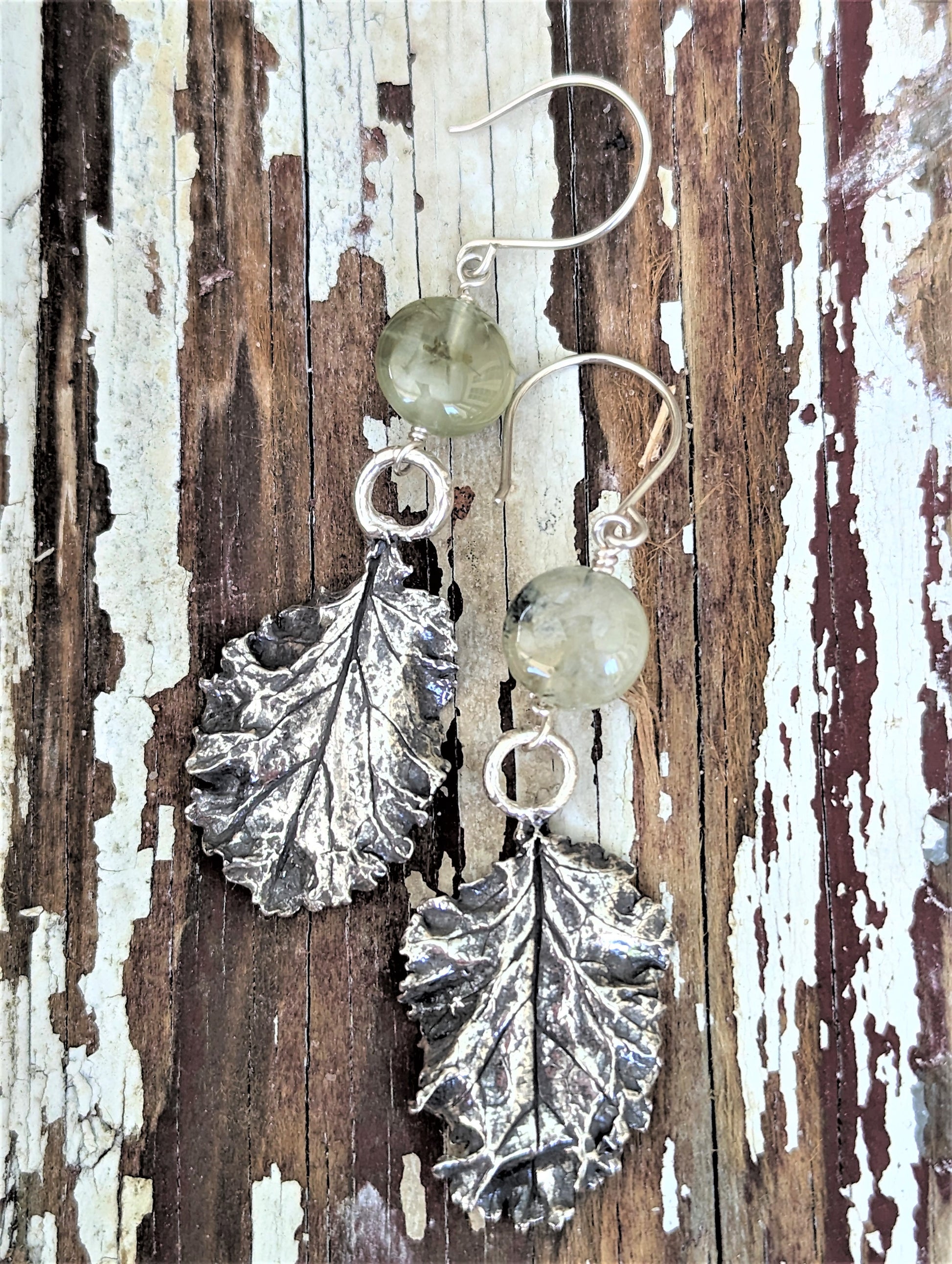 Unique artisan earrings made of real baby curly kale leaves with fine silver metal clay, dangling with orbs of watery green moss agate.