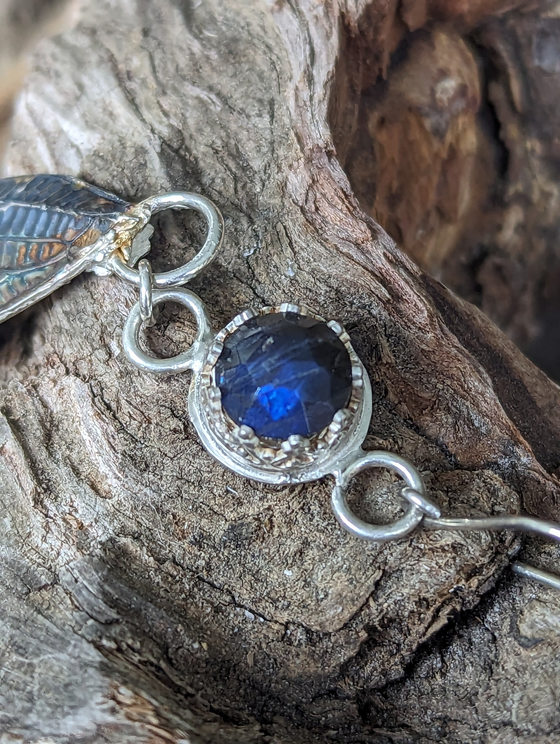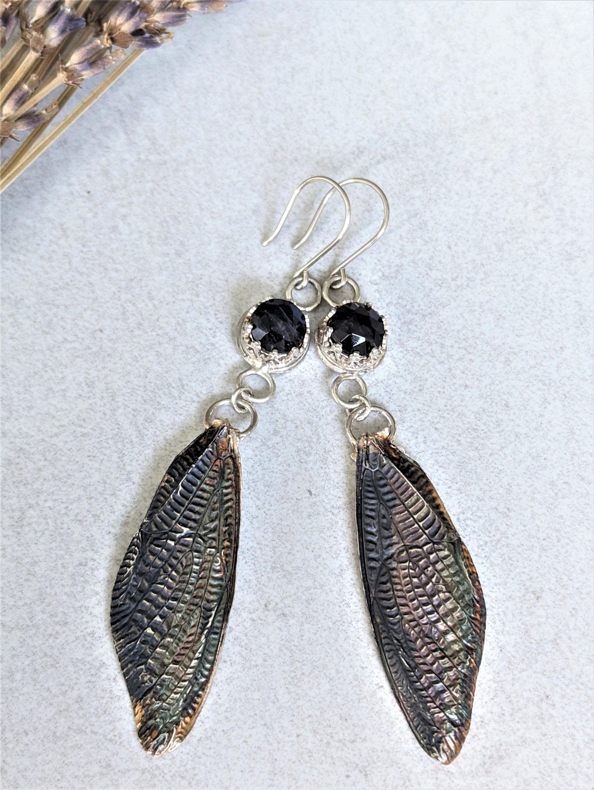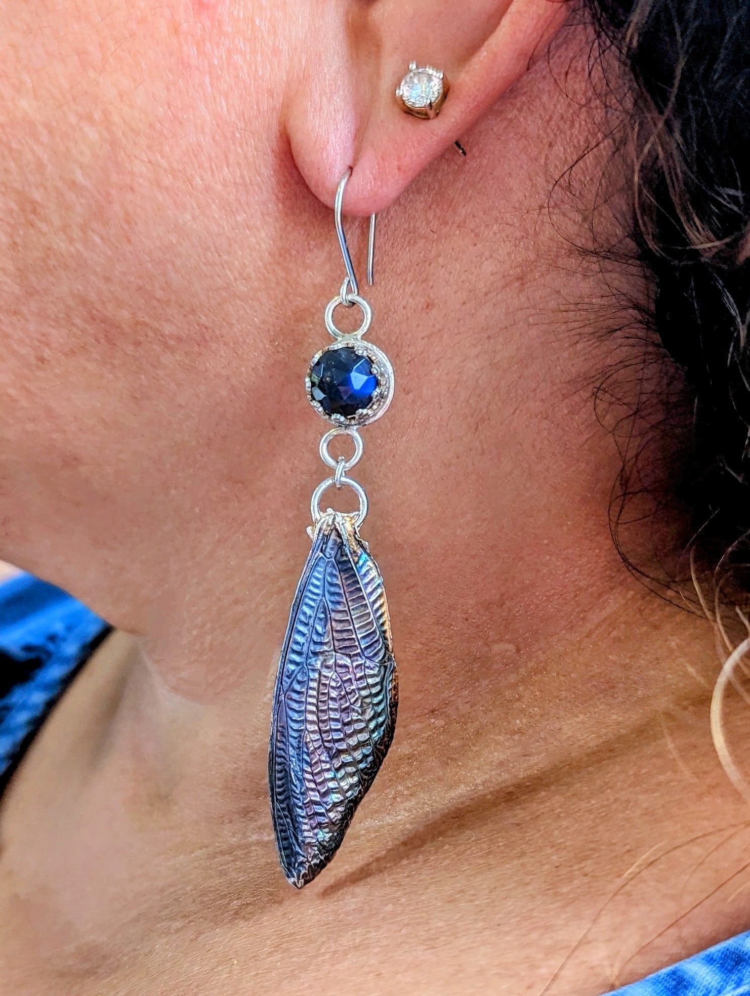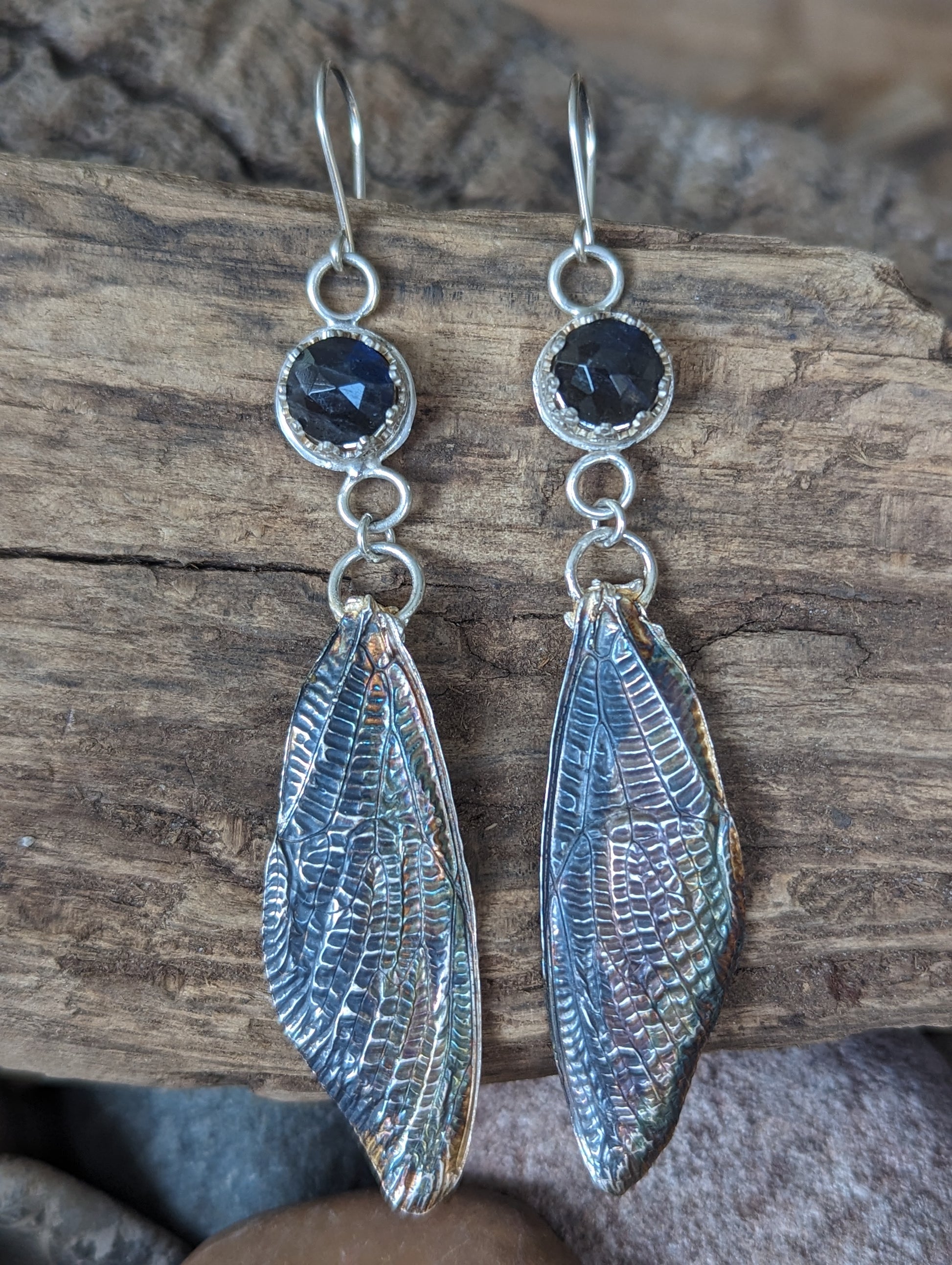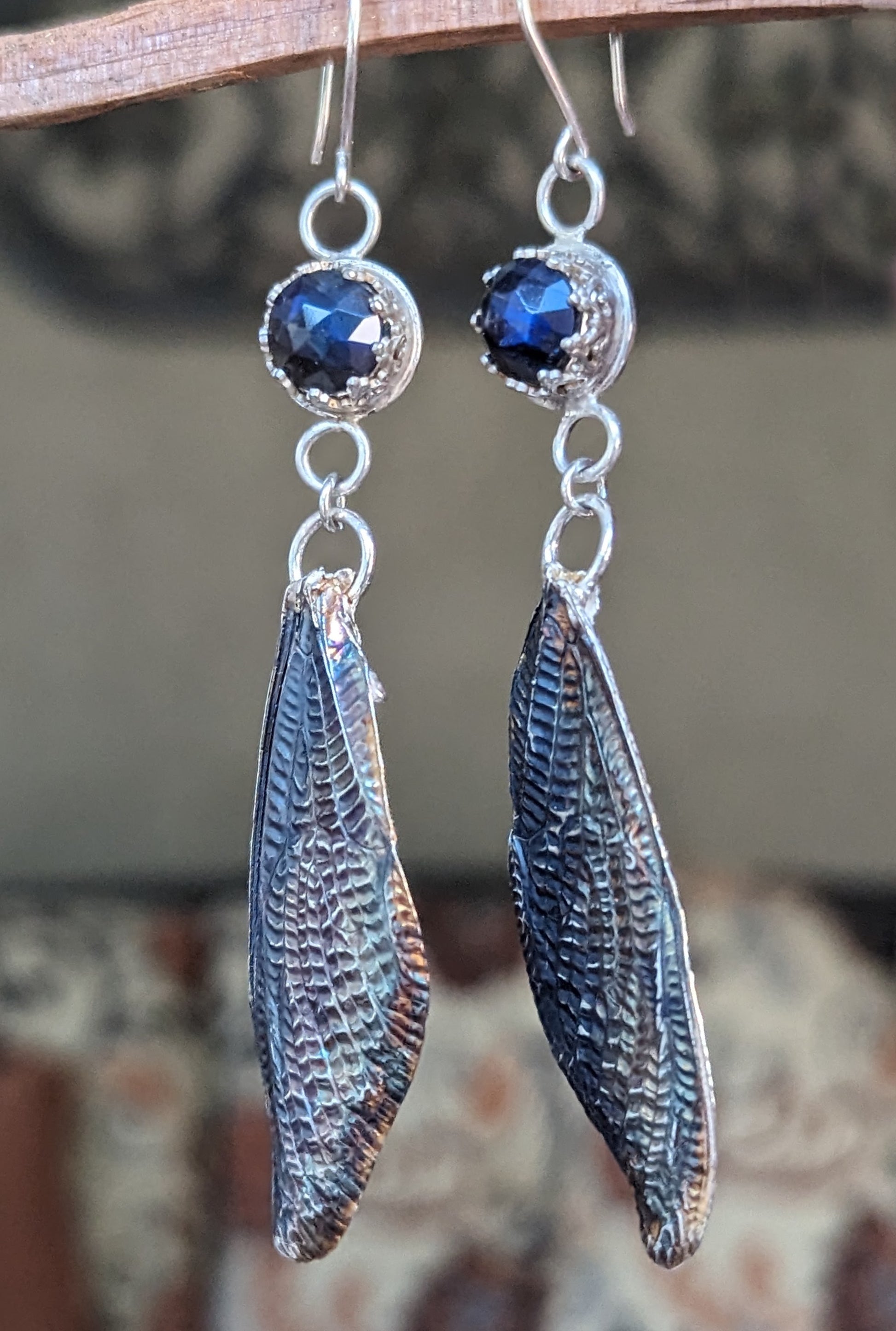 These earrings are a unique and captivating accessory that combines nature-inspired design with the beauty of gemstones. Carefully sourced real cicada wings were painstakingly hand-painted with multiple layers of fine silver metal clay, which when fired in a kiln left solid silver replicas of the wings in their natural detail. You've probably been treated to the beautiful (if loud!) song of the cicadas, but have you ever actually seen one? They come in many sizes, shapes and colors, and their wings are an enchanting masterpiece of intricate veining and delicate translucency. These silver wings have been given a dark opalescent patina to highlight the detail and emulate the natural colors. The large wings have been given added impact by hanging from stunning deep blue labradorite gemstones. Labradorite is renowned for its mesmerizing play of colors, known as labradorescence. The faceted cut enhances the gemstone's brilliance, creating a dazzling display of iridescent blue. These earrings are not only a beautiful fashion accessory but also a conversation piece, celebrating the intricate wonders of nature and skilled artistry. Wearing them allows you to express your appreciation for the natural world while showcasing your unique sense of style.