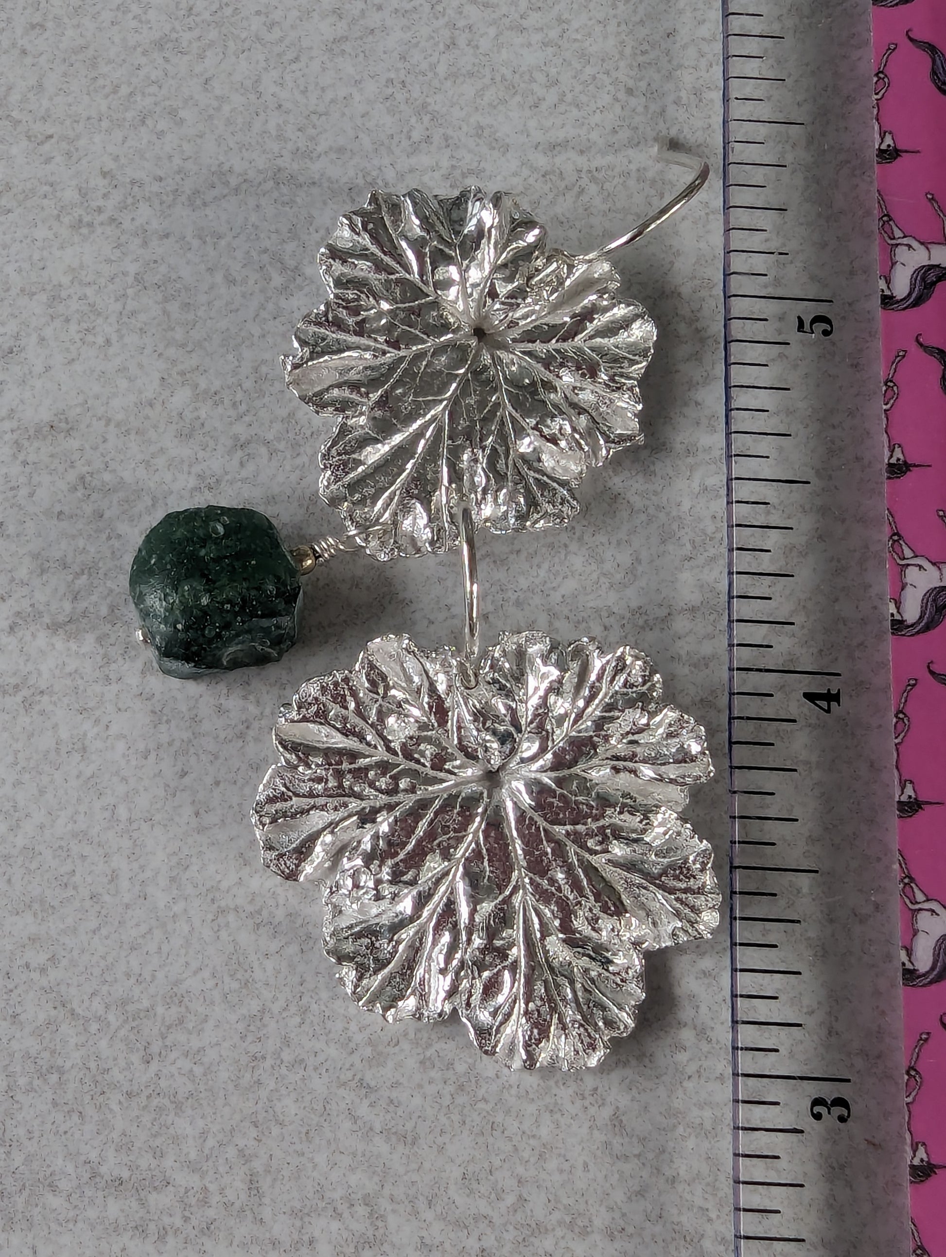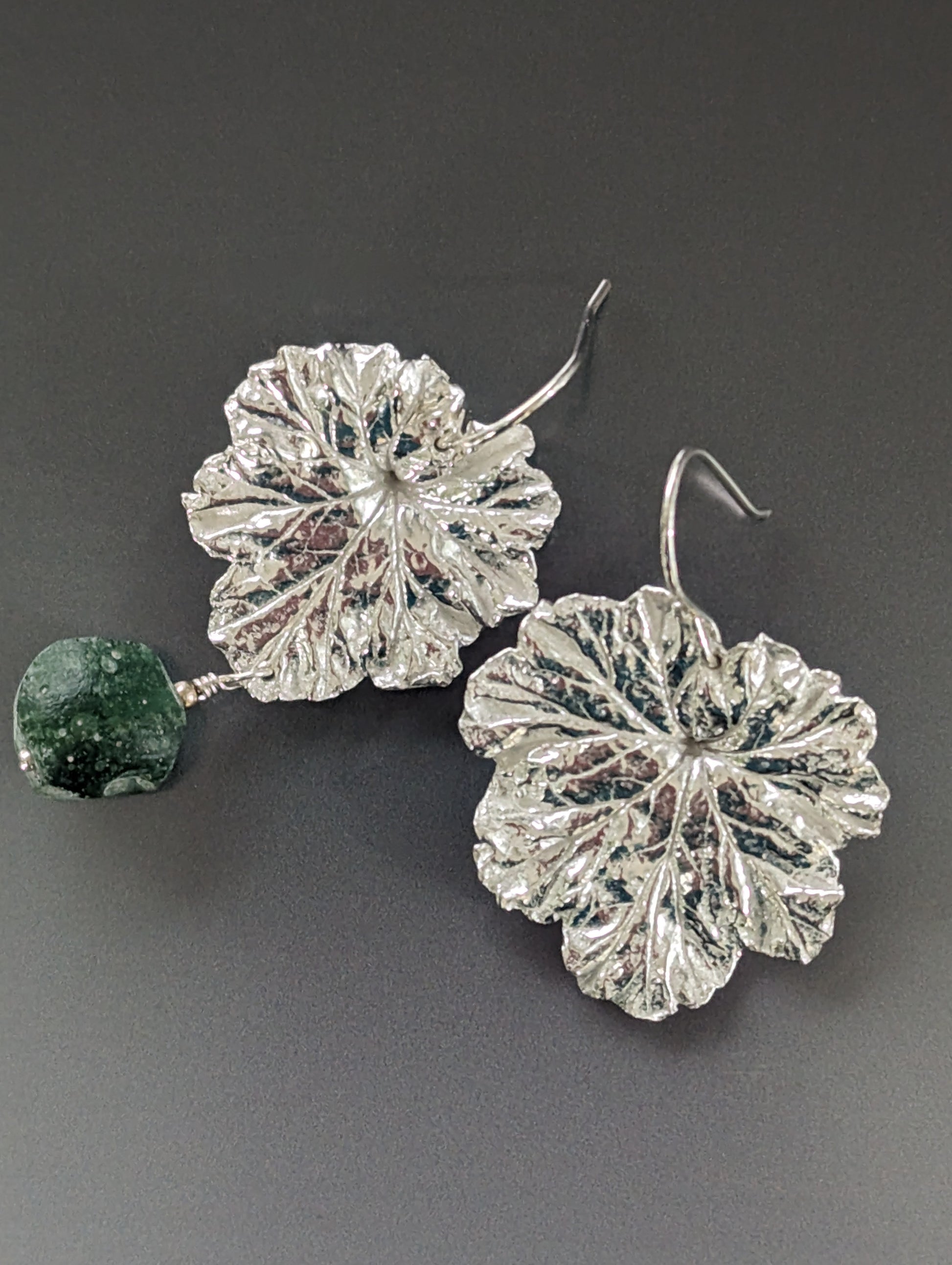 Silver Geranium Leaf Earrings with Green Roman Glass