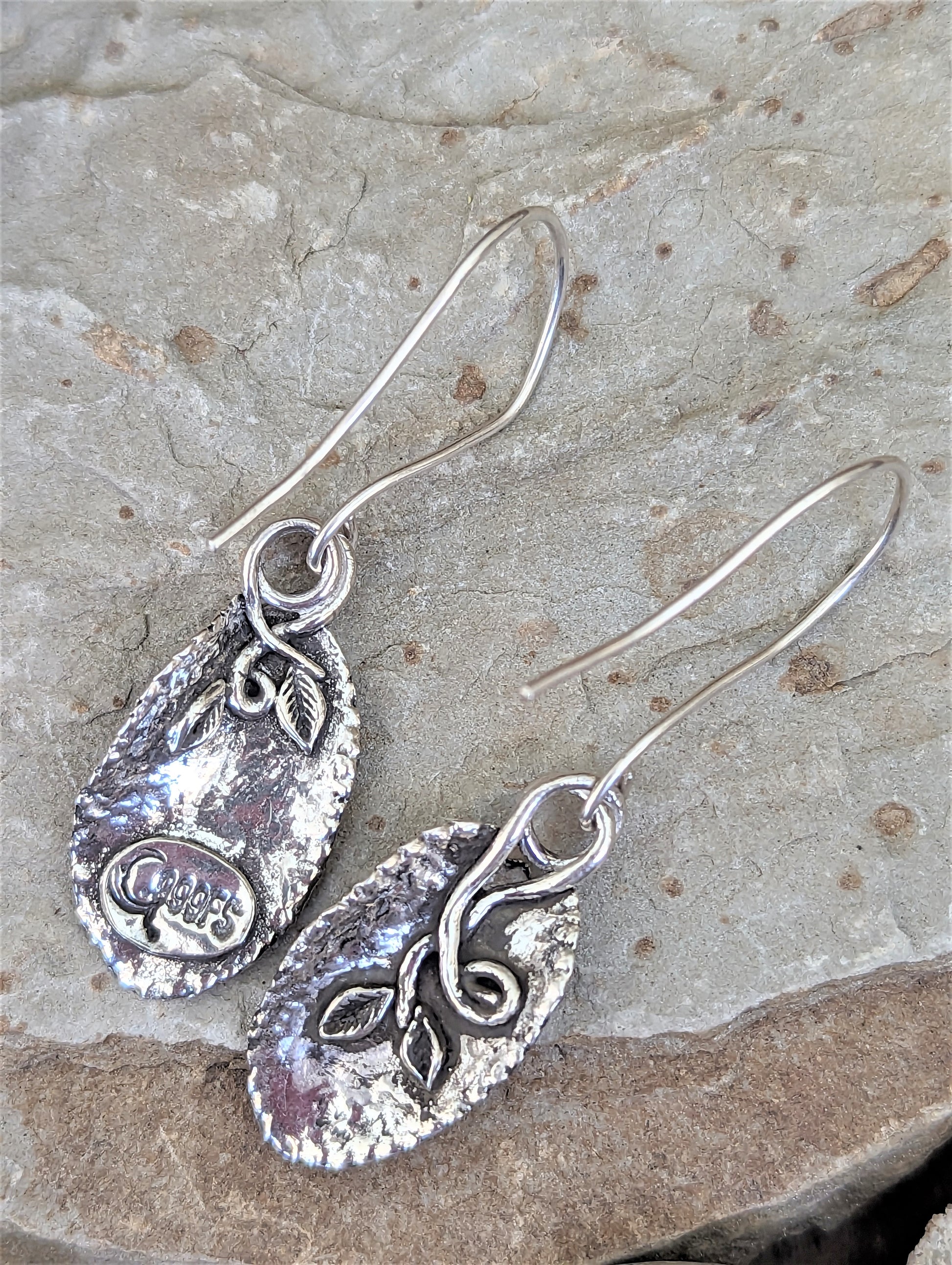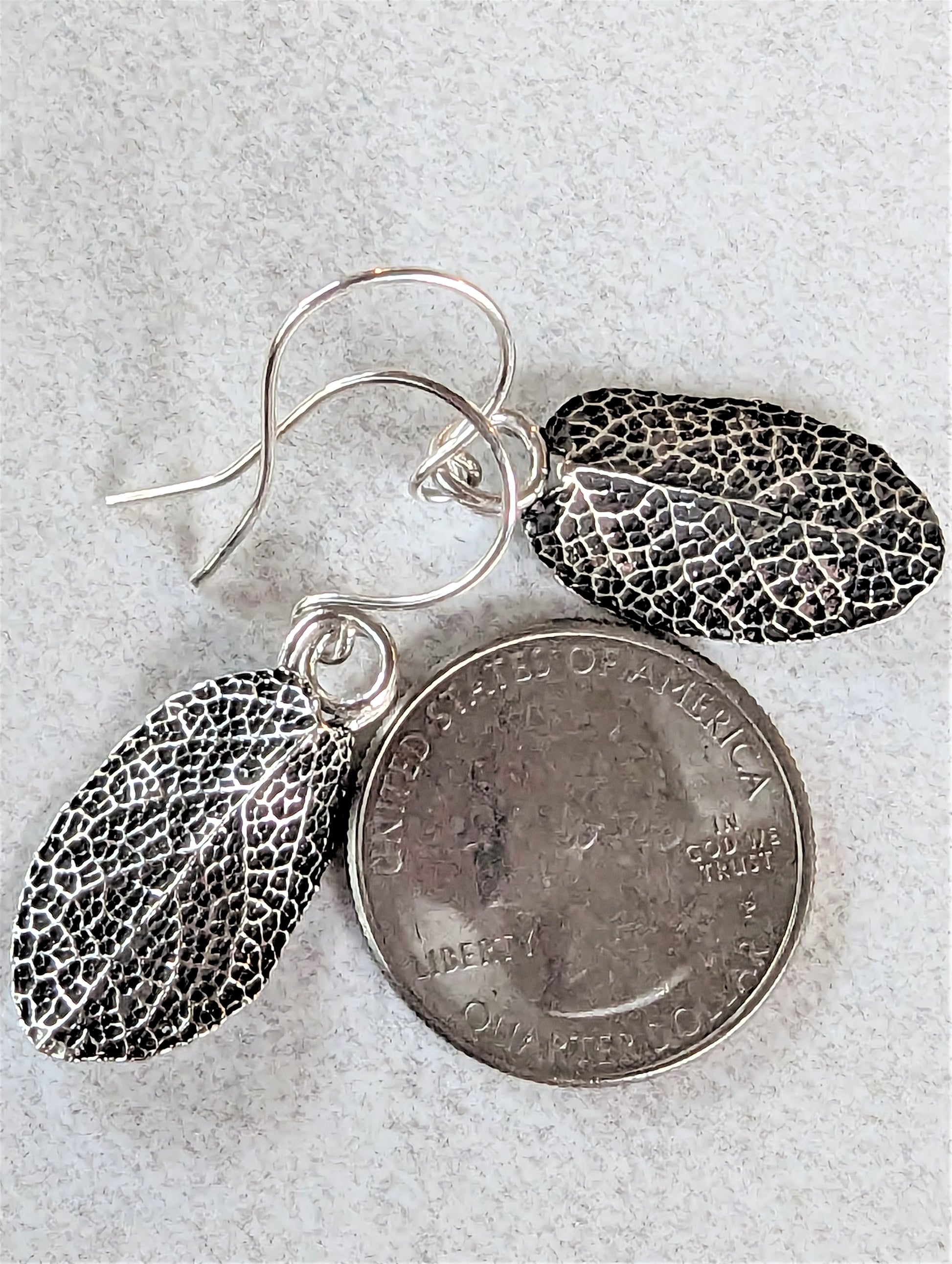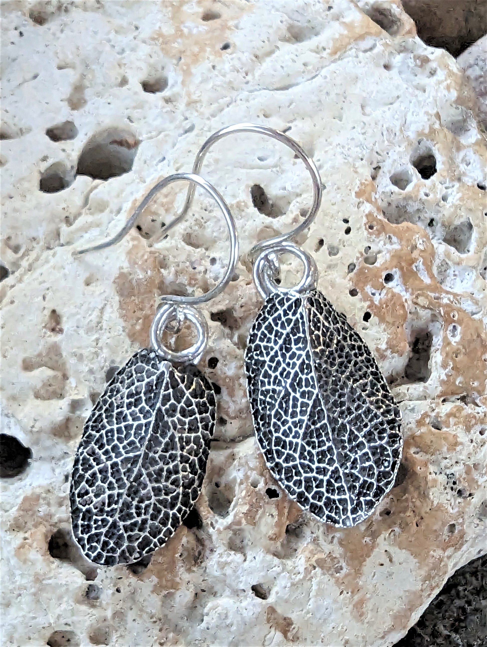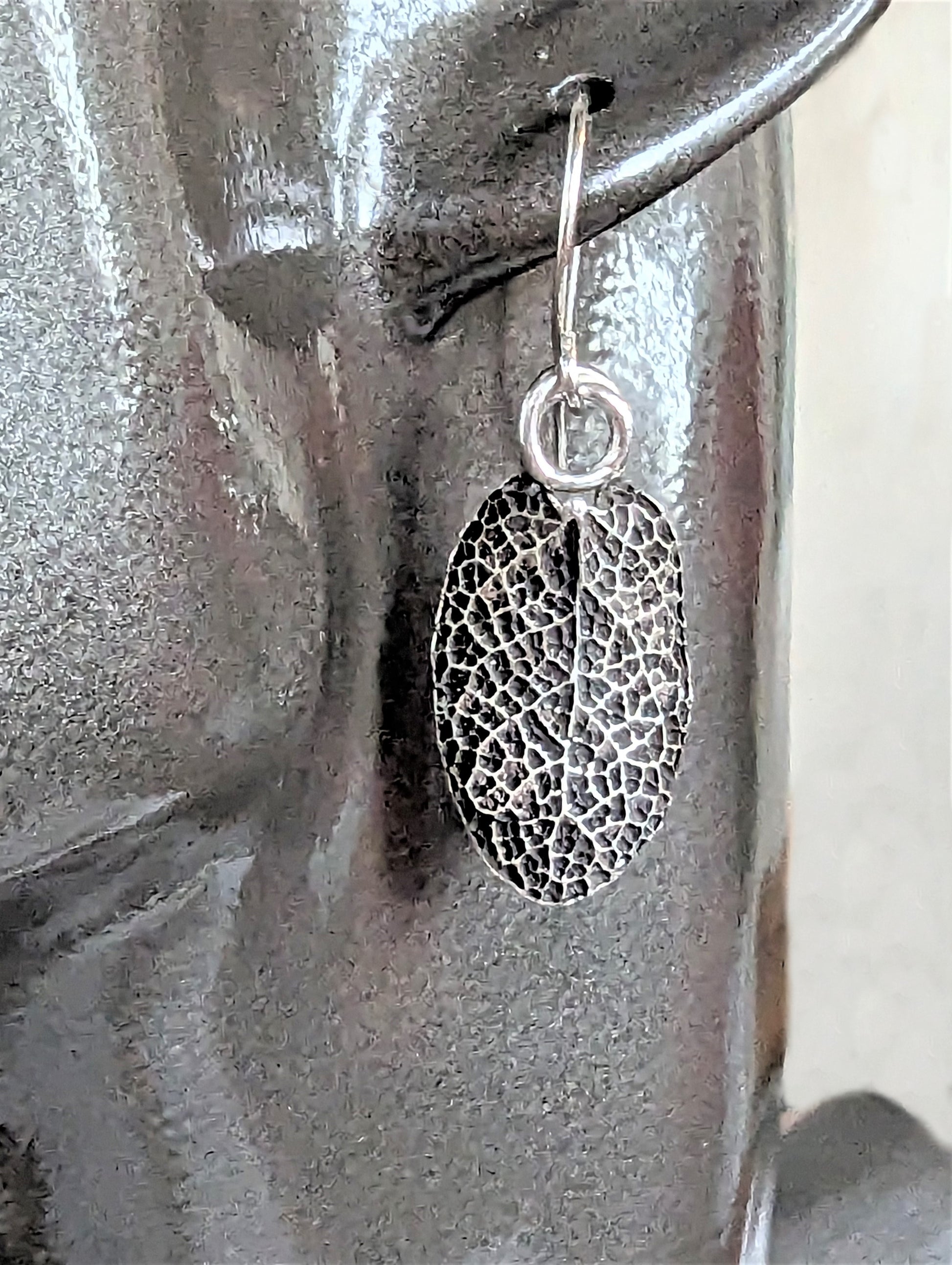 These are fun and truly unique earrings. I picked young sage leaves from the herb garden in my yard, then painstakingly painted many (many!) coats of thinned fine silver metal clay onto them. The clay, like a thick paint, settles into all of the tiny nooks and crannies of the leaves. Once dried, the clay is fired, and the leaf burns away leaving an exact replica in fine silver! No two will ever be alike. I have given them a light patina to bring out the incredible texture of the leaves. On the backs are handmade vines and leaves, a secret treasure just for you. The earwires are handmade of sterling silver. These eco-friendly lovelies are truly a celebration of nature and craftsmanship combined, and are a beautiful and sustainable accessory option for the fashion conscious.