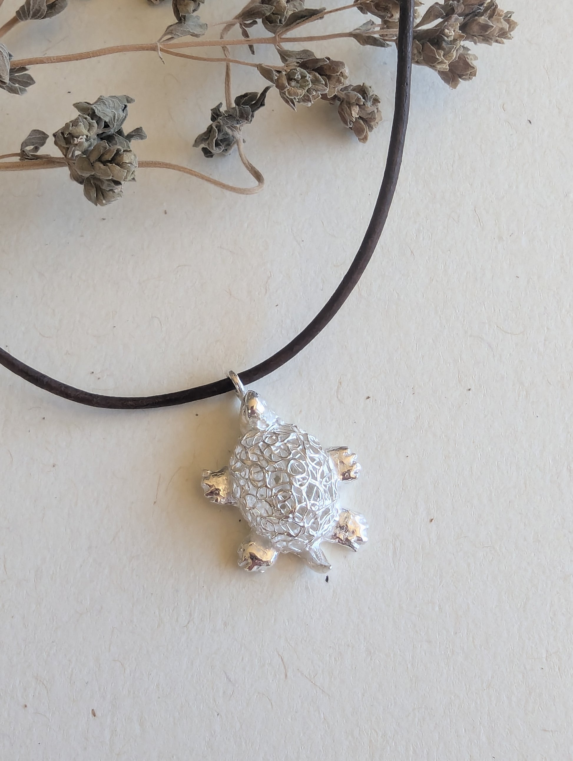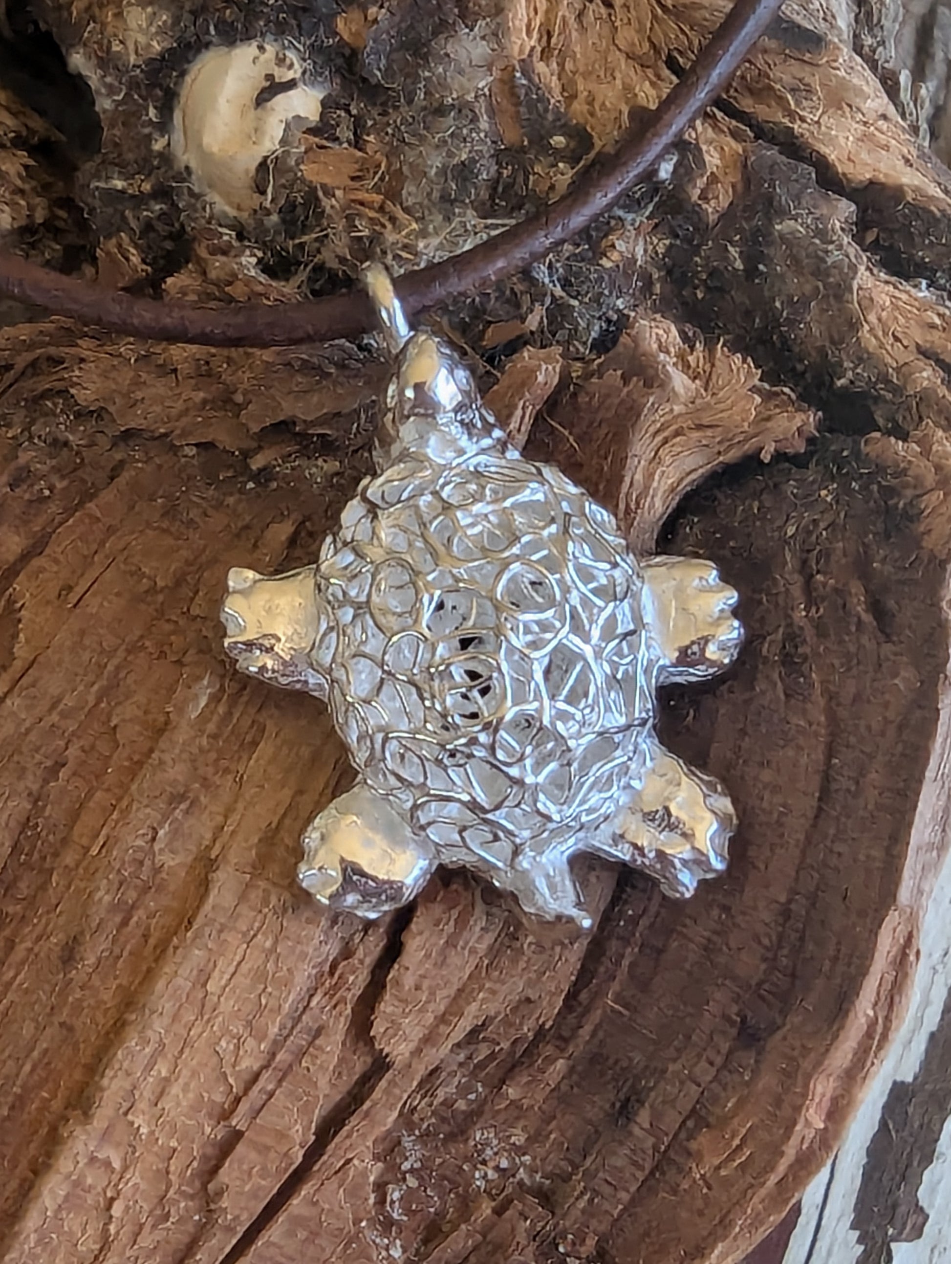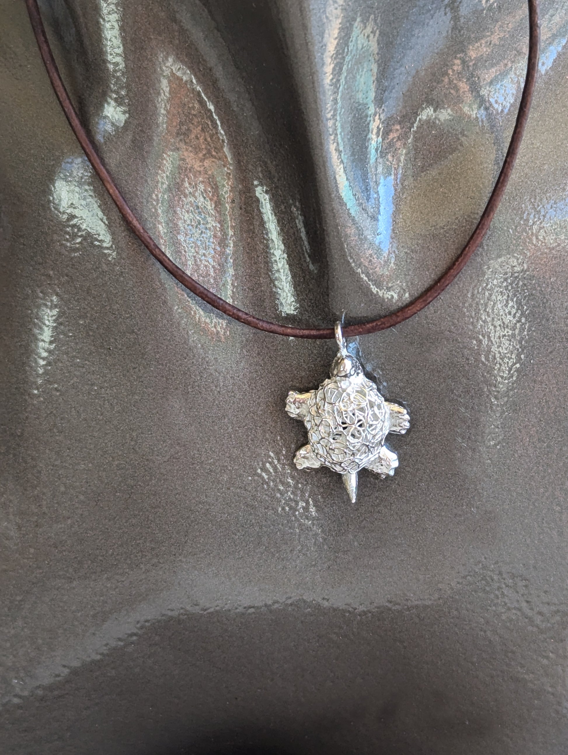 This charming, handcrafted turtle pendant is made from fine silver metal clay, showcasing exquisite artistry in a petite design. Measuring under 3/4" in length, the pendant captures the essence of elegance in its small size. The turtle's shell is a delicate hollow filigree, intricately formed to create an airy, lacy pattern that highlights the pendant’s handmade quality. The fine silver finish gives the piece a luminous sheen, enhancing its intricate details. Perfect as a subtle yet captivating accessory, this pendant is a testament to skilled craftsmanship and a love for nature-inspired designs.