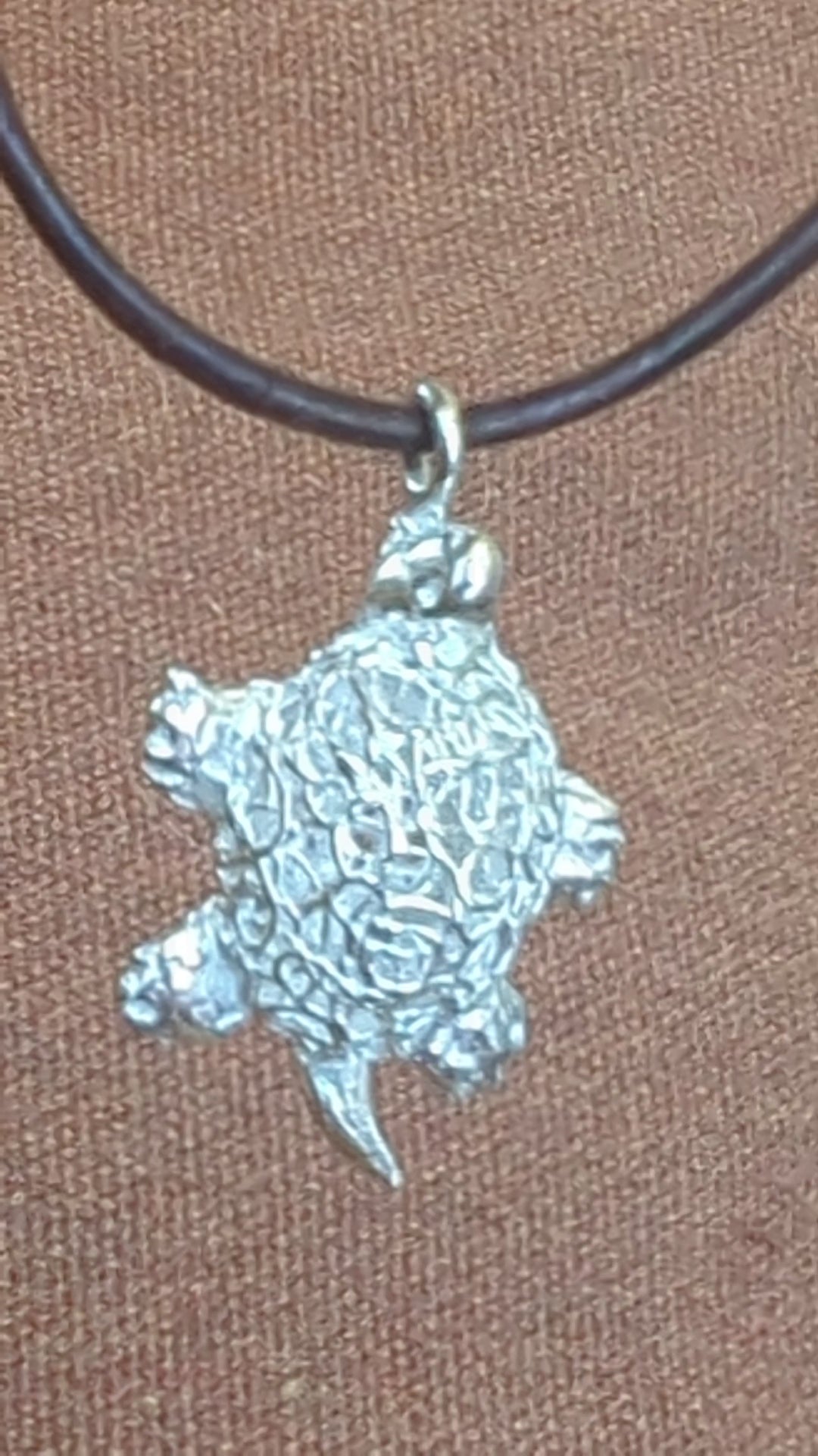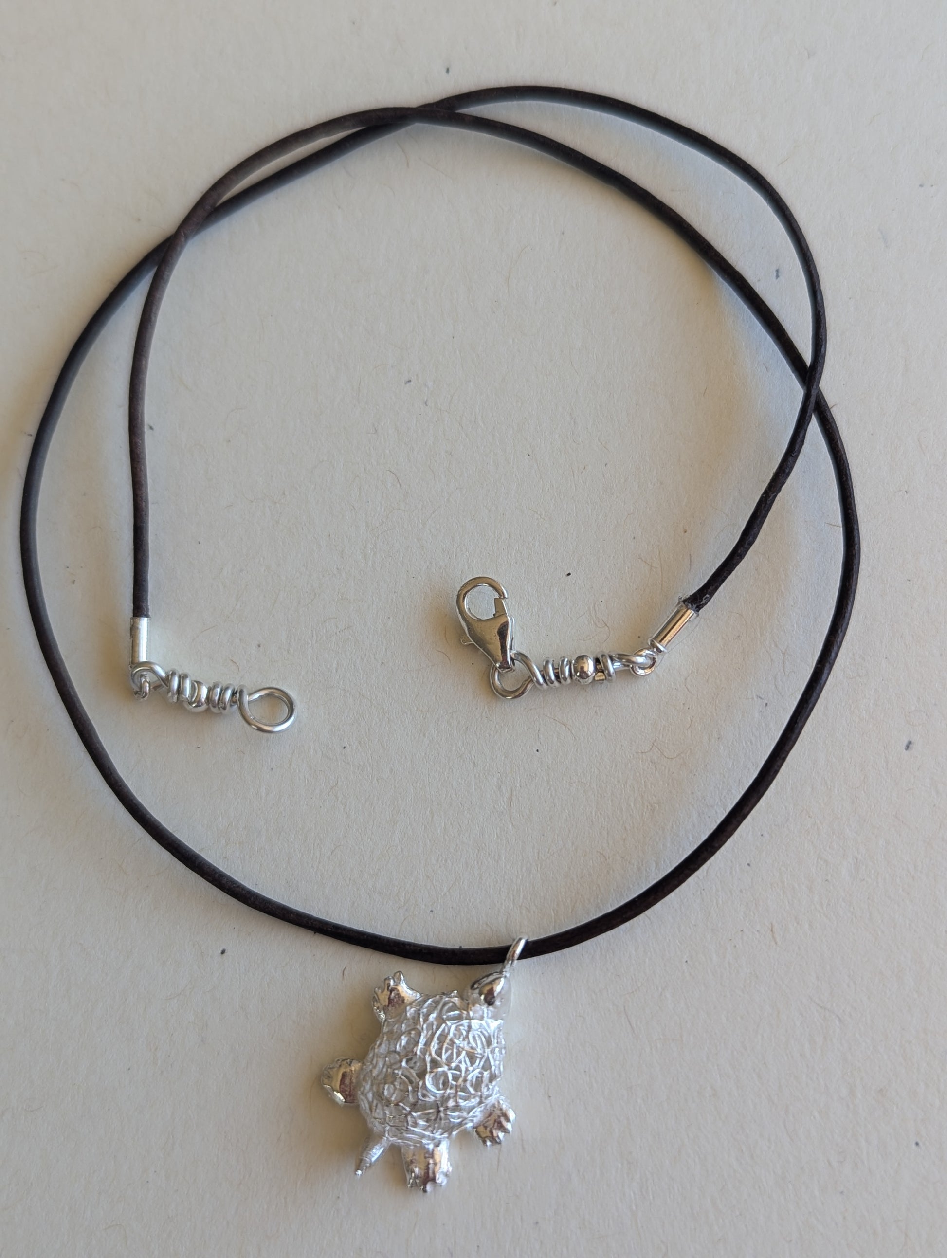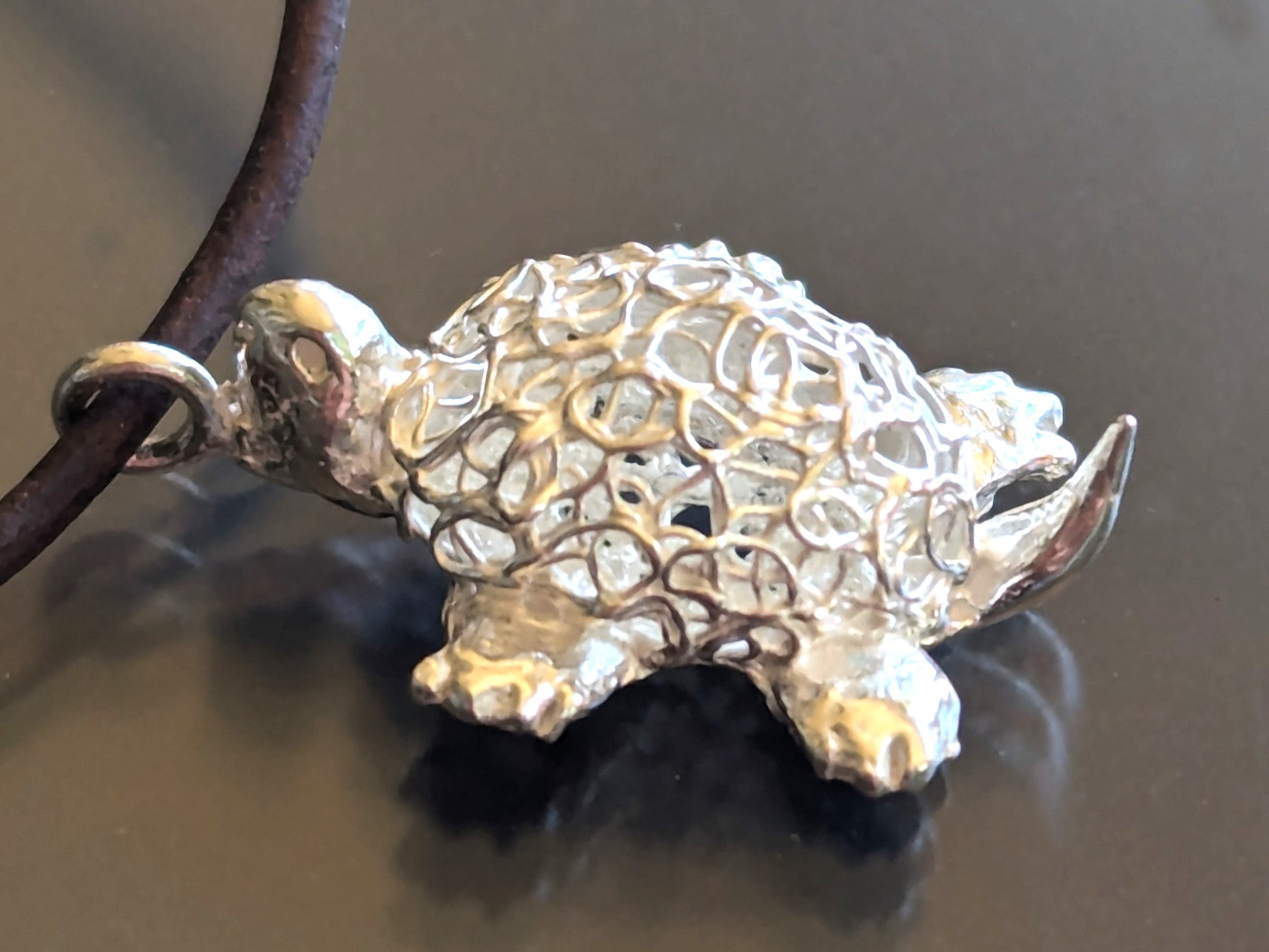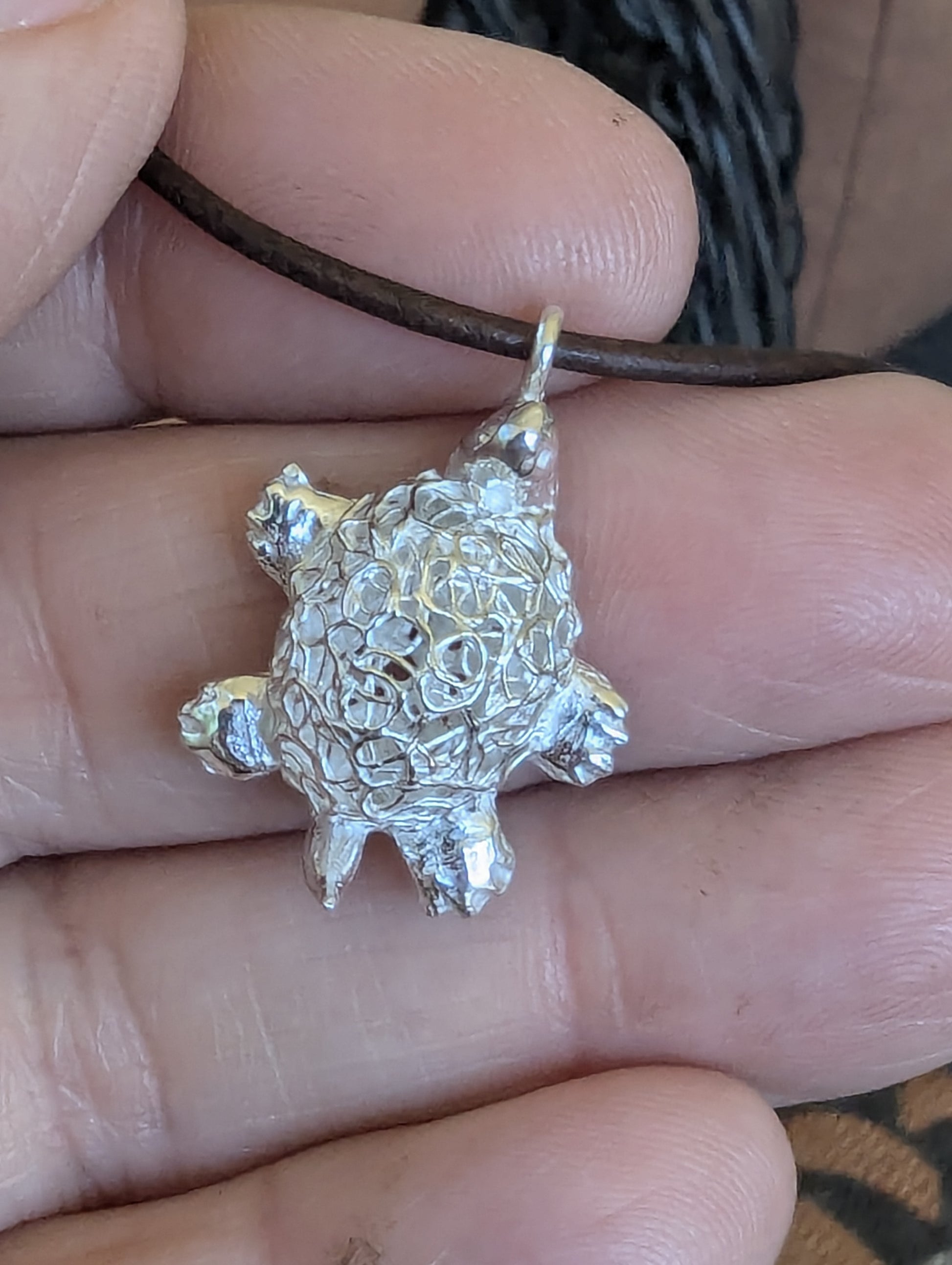 This charming, handcrafted turtle pendant is made from fine silver metal clay, showcasing exquisite artistry in a petite design. Measuring under 3/4" in length, the pendant captures the essence of elegance in its small size. The turtle's shell is a delicate hollow filigree, intricately formed to create an airy, lacy pattern that highlights the pendant’s handmade quality. The fine silver finish gives the piece a luminous sheen, enhancing its intricate details. Perfect as a subtle yet captivating accessory, this pendant is a testament to skilled craftsmanship and a love for nature-inspired designs.