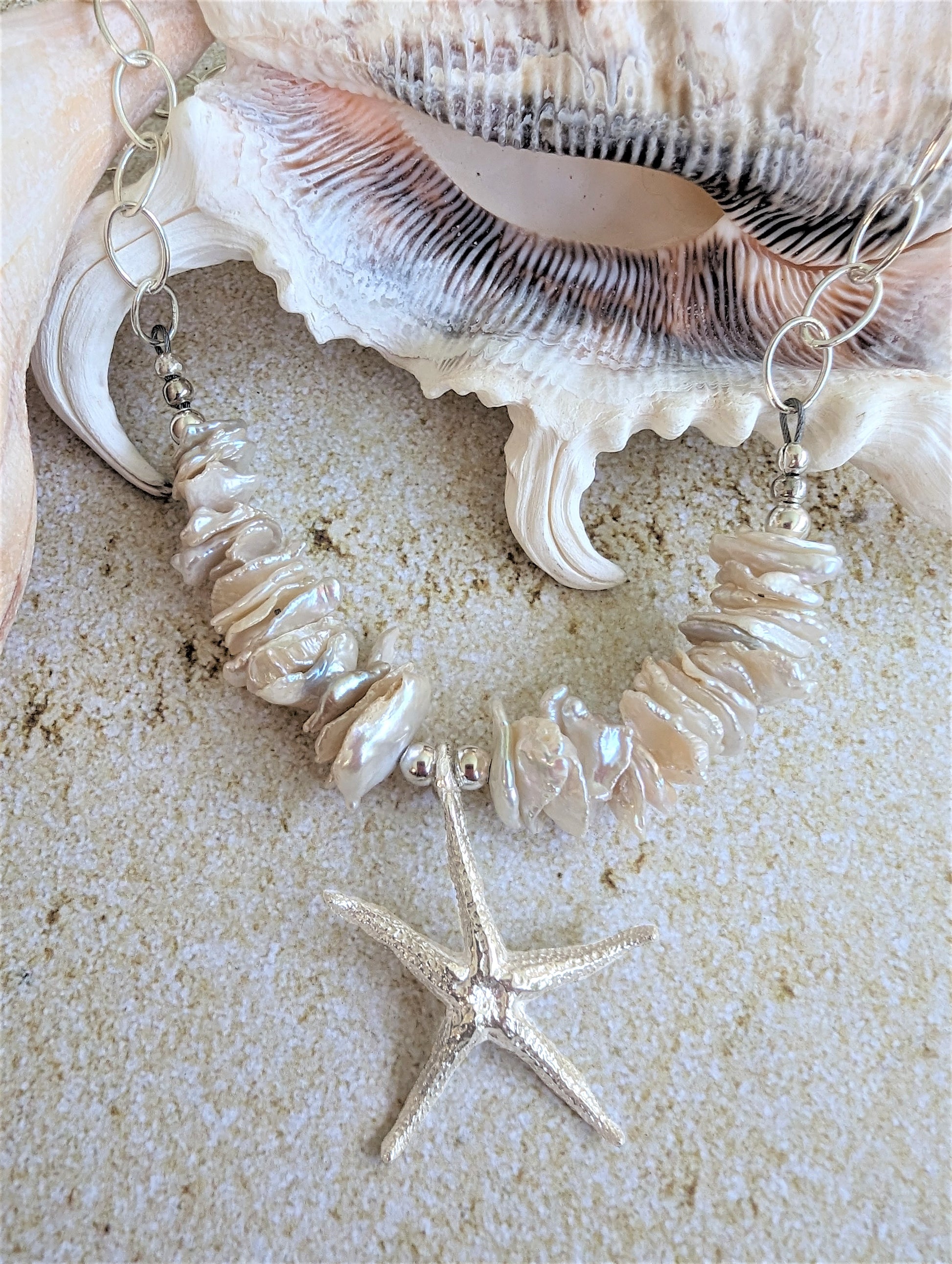Silver Star Fish Pendant on Flake Pearl and Silver Chain Necklace, Bohemian Artisan Eco-Friendly Beach Jewelry