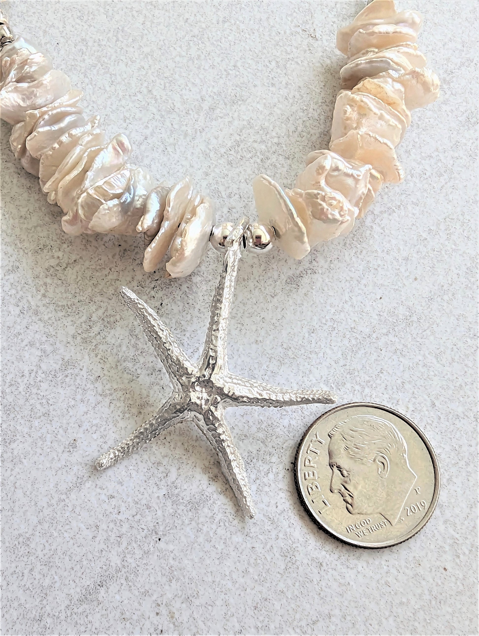 A beautiful starfish pendant, handcrafted of eco-friendly fine silver metal clay from a mold of a real starfish, hangs from a string of unique creamy flake pearls and sterling silver chain.