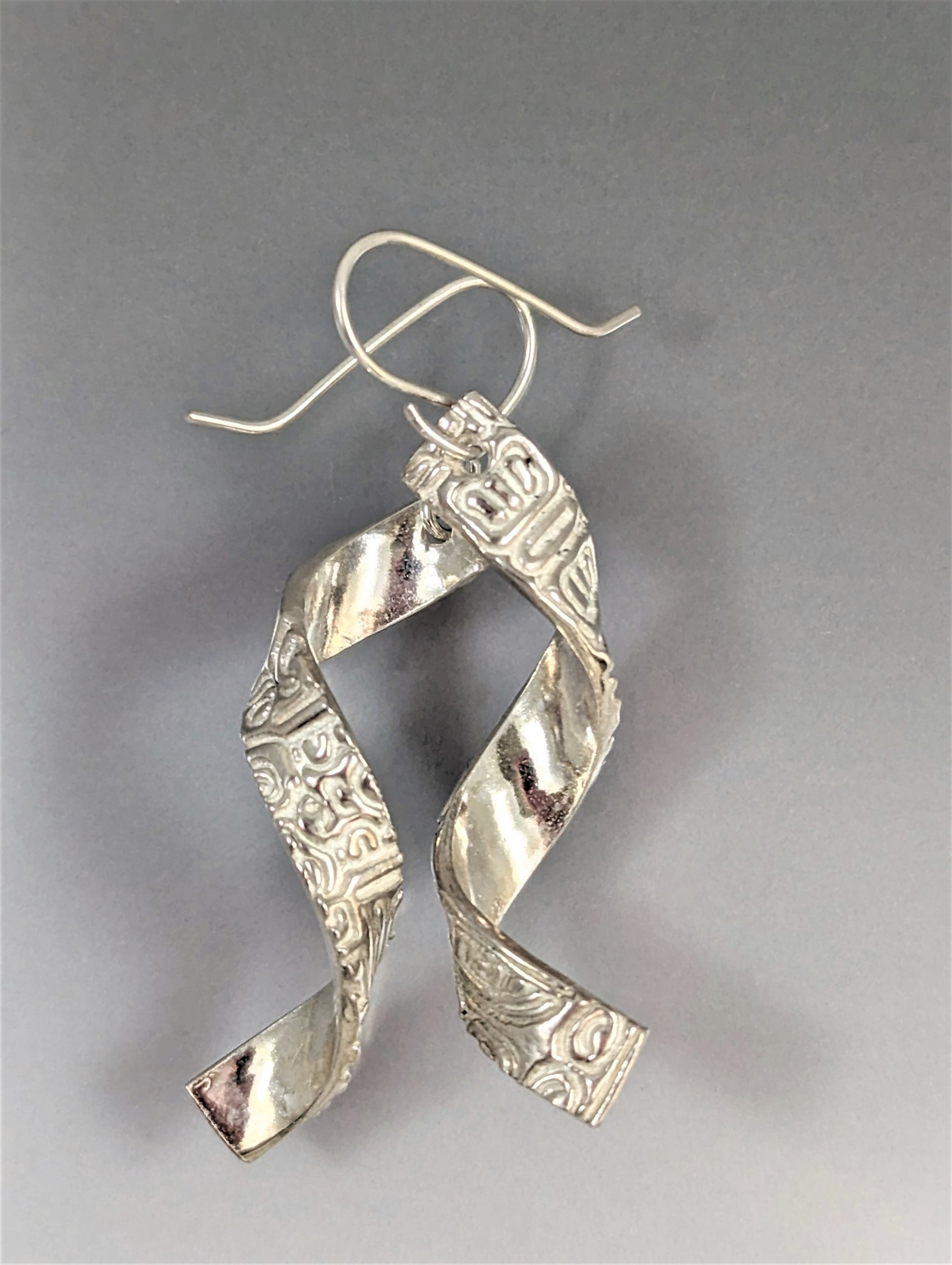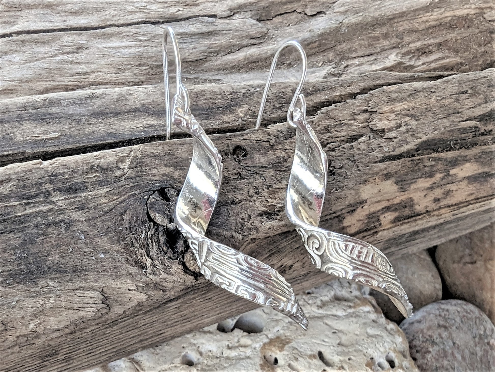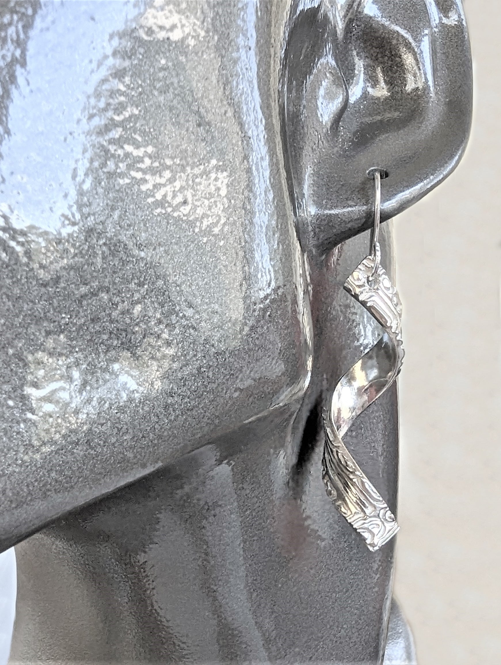 These earrings are a stylish and elegant accessory that add a touch of sophistication to any outfit. They feature a long, dangling design with a unique twist pattern, smooth and shiney on one side, textured and sparkly on the other, that adds visual interest and dimension to the overall look. The twisting motion creates an illusion of movement and adds a dynamic element to the earrings, making them more visually intriguing. The bright fine silver metal complements various skin tones and pairs well with both casual and formal attire.