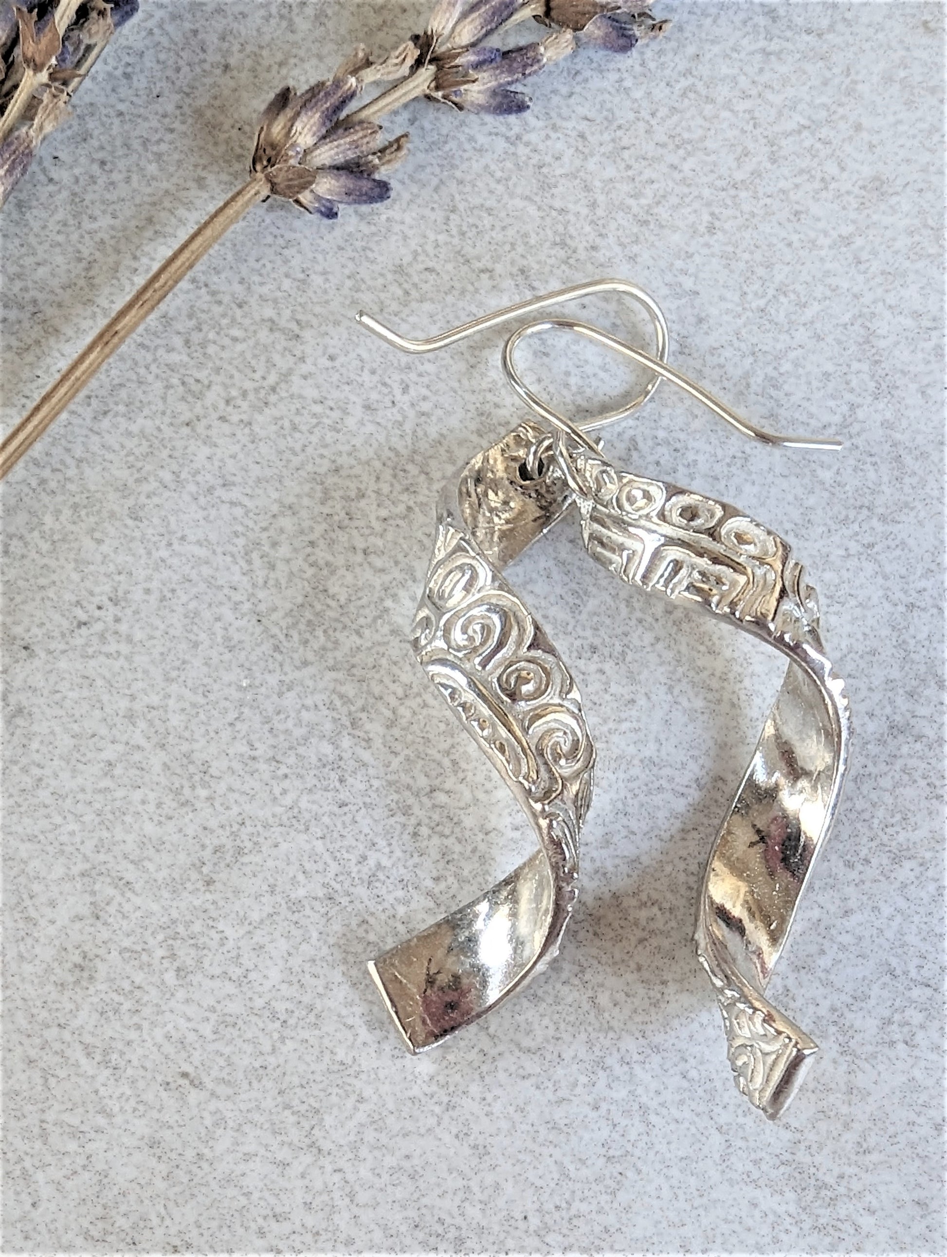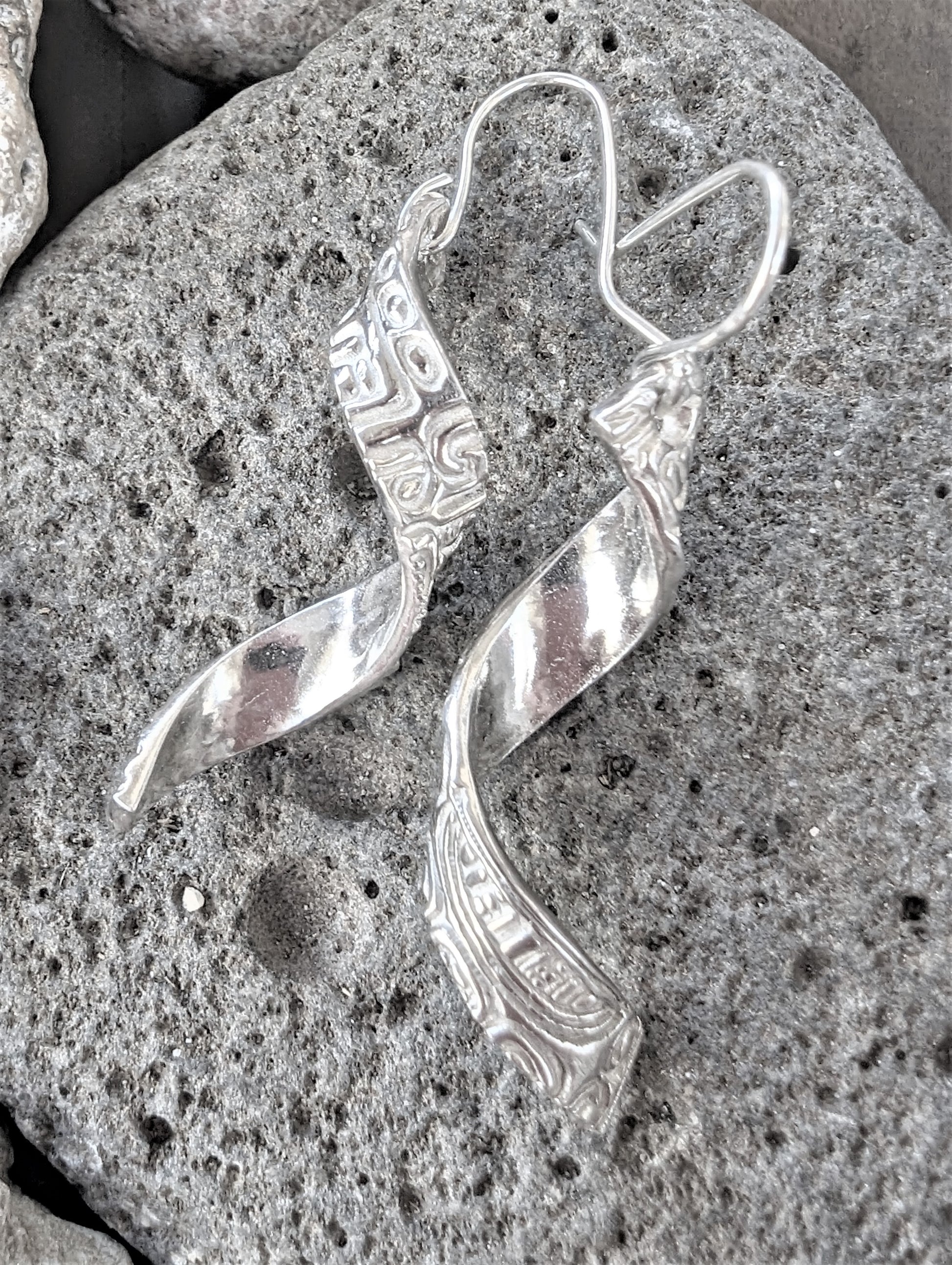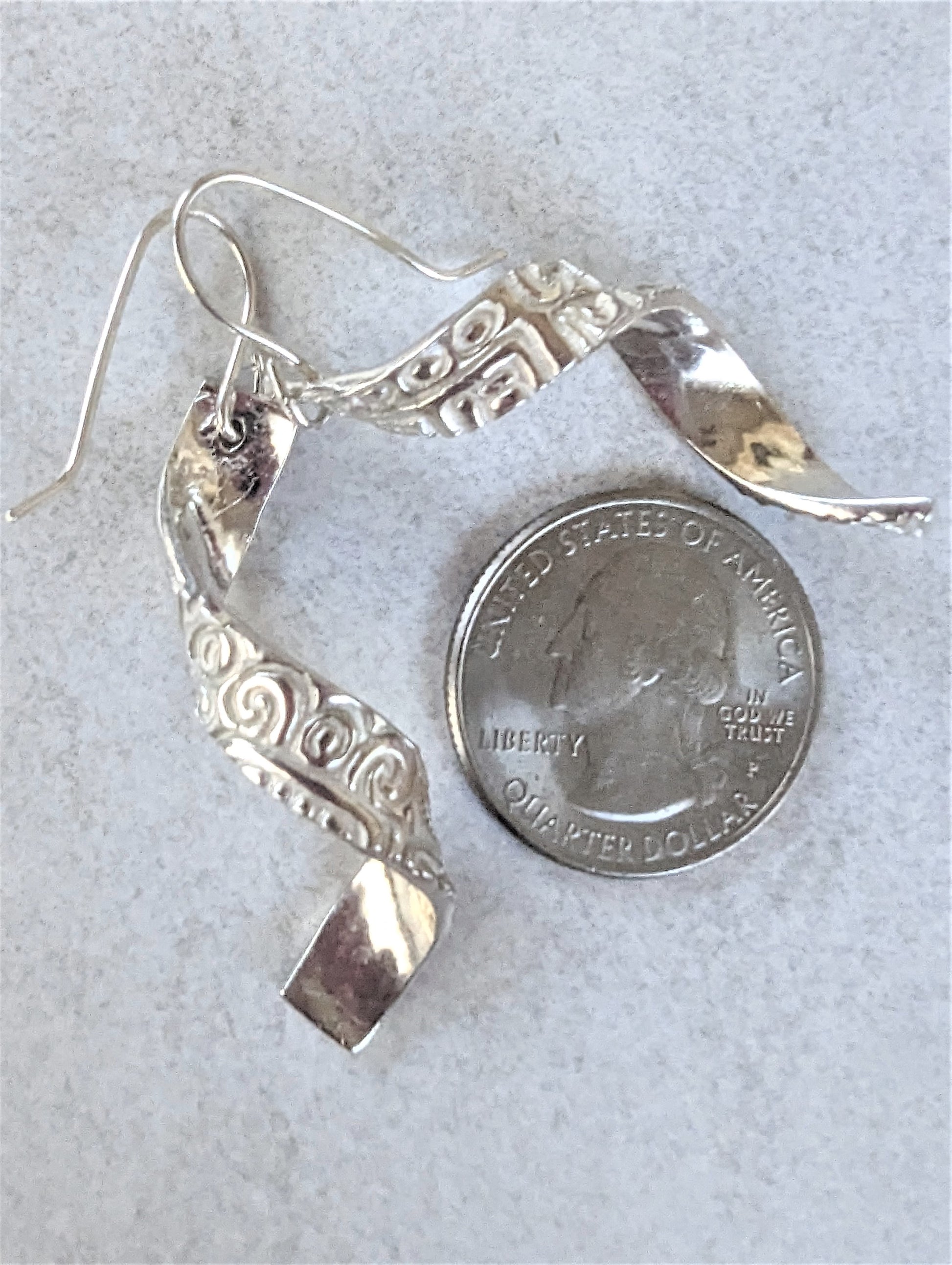 These earrings are a stylish and elegant accessory that add a touch of sophistication to any outfit. They feature a long, dangling design with a unique twist pattern, smooth and shiney on one side, textured and sparkly on the other, that adds visual interest and dimension to the overall look. The twisting motion creates an illusion of movement and adds a dynamic element to the earrings, making them more visually intriguing. The bright fine silver metal complements various skin tones and pairs well with both casual and formal attire.