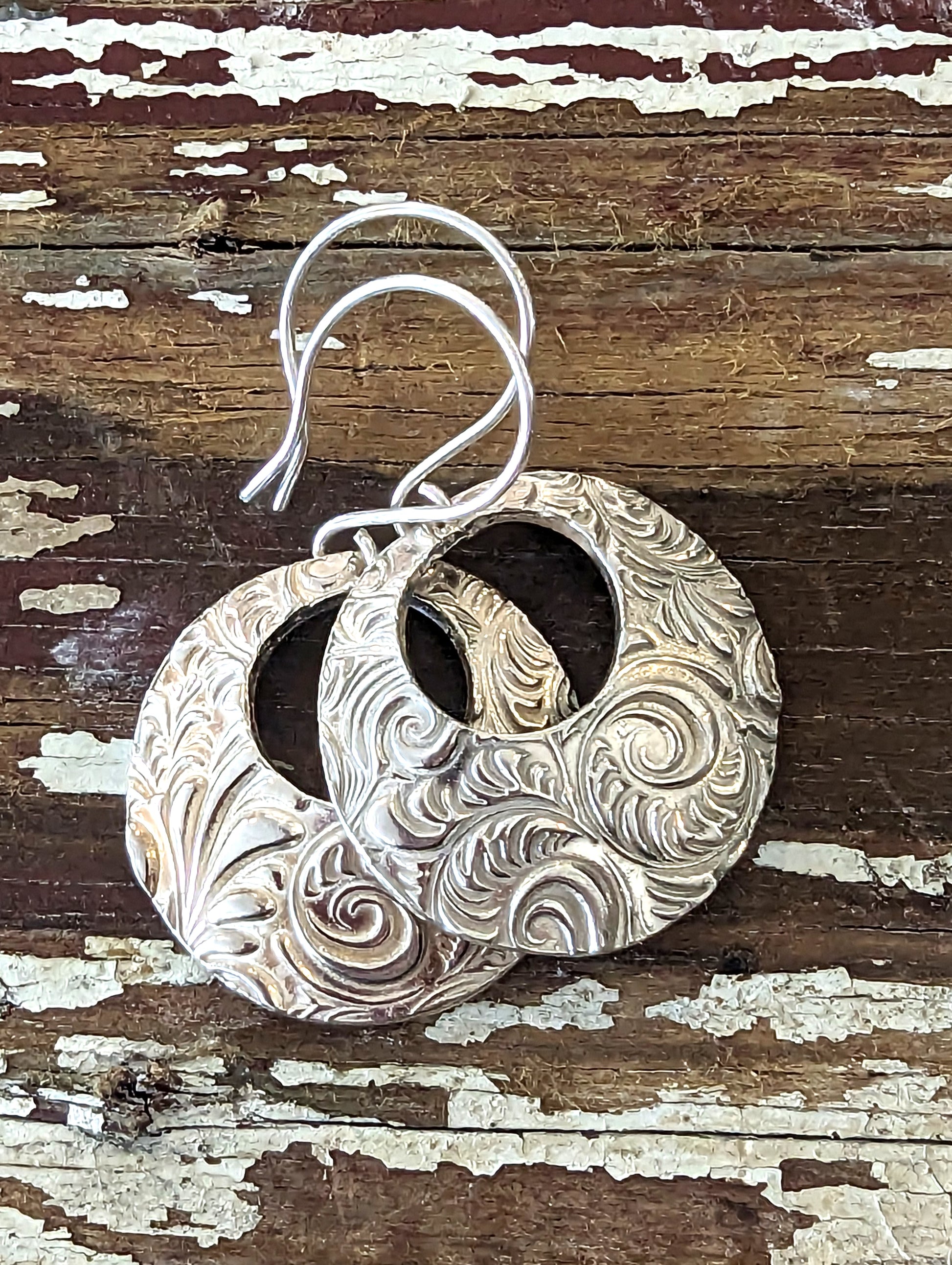 These exquisite dangle earrings capture the essence of timeless elegance. Each earring showcases a softly domed circle, shimmering with the pristine luster of fine silver. The gentle curvature of the circle adds a touch of fluidity and grace, ensuring they catch the light with every subtle movement. The intricate flourish texture adorning the surface with delicate swirls and ornate patterns is reminiscent of vintage filigree designs. Handmade of fine silver metal clay, their lightweight construction ensures comfort, allowing you to adorn yourself with elegance for any occasion. Whether paired with a sophisticated evening ensemble or adding a touch of sparkle to your everyday attire, these earrings are a unique piece of wearable art and are sure to be a conversation starter.