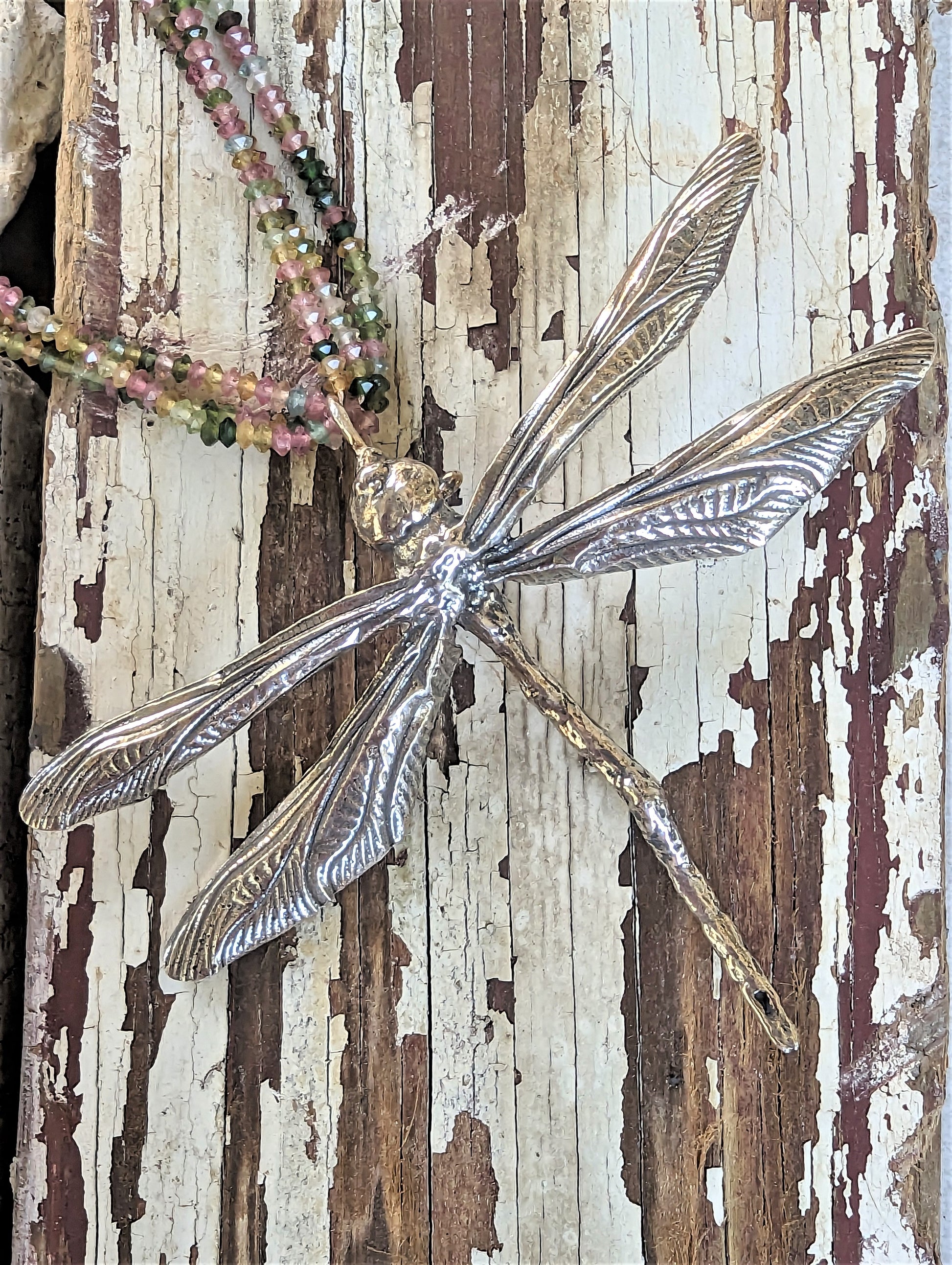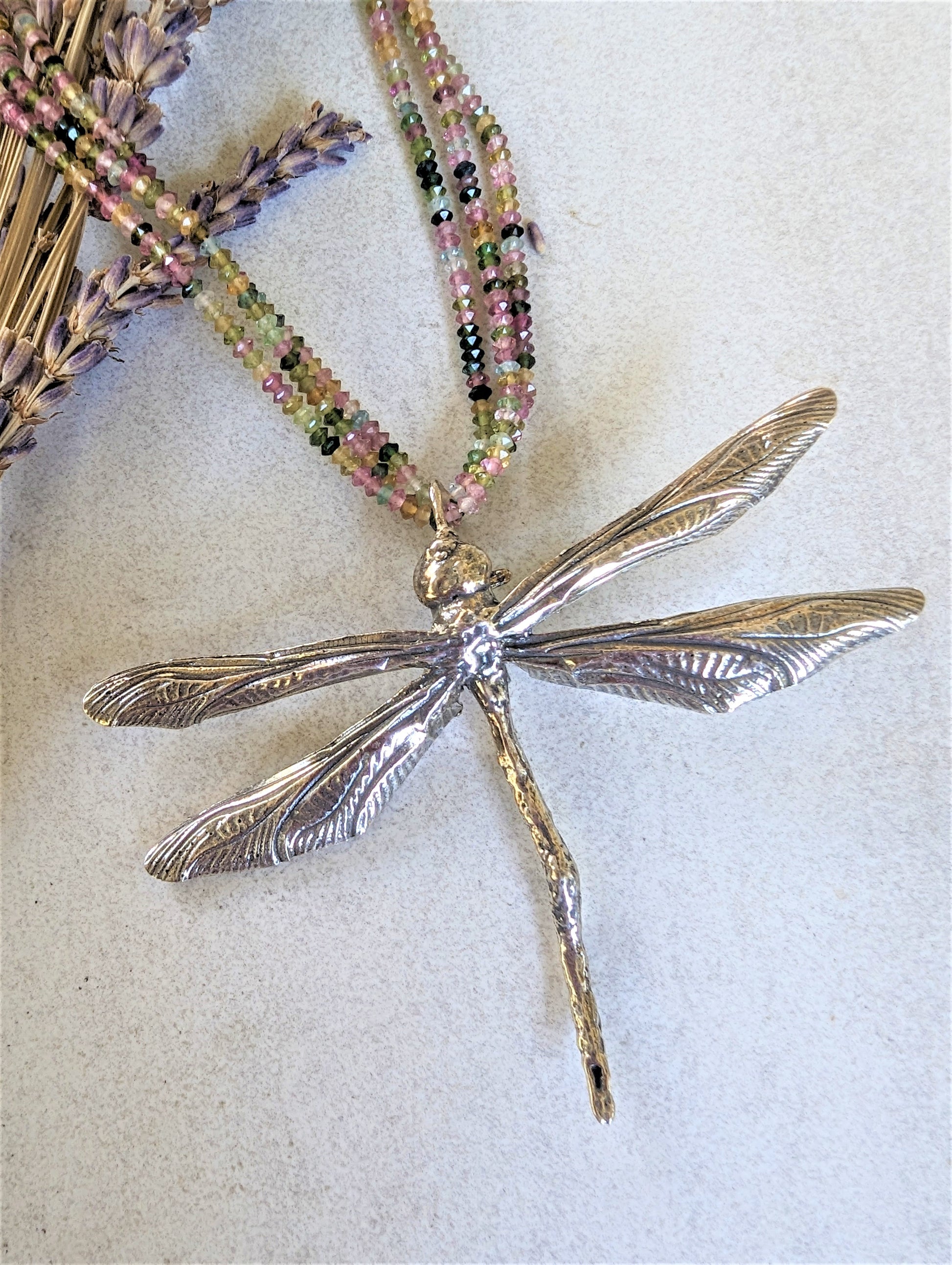 This necklace features a stunning pendant of a large silver dragonfly. The pendant was crafted by meticulously painting an actual dragonfly (already peacefully deceased!) with multiple layers of fine silver metal clay. The clay and insect were later fired in a kiln during which the organic material burned away leaving a silver replica. The pendant showcases the intricate details of the delicate wings, slender body, and graceful curves of this enchanting insect, capturing the essence of a dragonfly in flight, frozen in time, exuding a sense of movement and life. Searching for wildflowers, the dragonfly has alighted on a field of colorful rainbow tourmaline, a triple strand of tiny faceted beads that sparkle in a dazzling array of hues. The necklace is finished with a sterling silver chain and handmade sterling hook. The hook can actually be used through any link in the chain to adjust the length of the necklace if desired. This is a truly enchanting accessory that will undoubtedly draw admiration and spark conversations wherever it is worn.