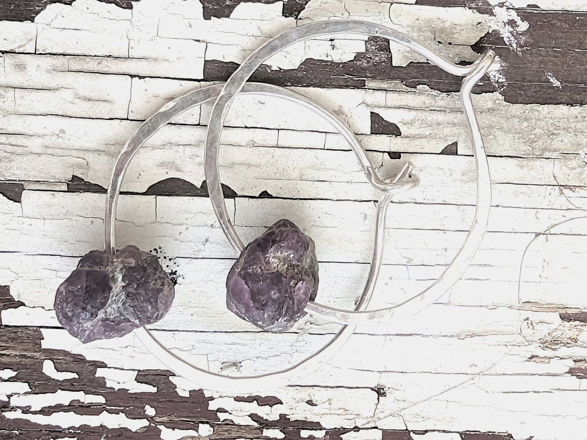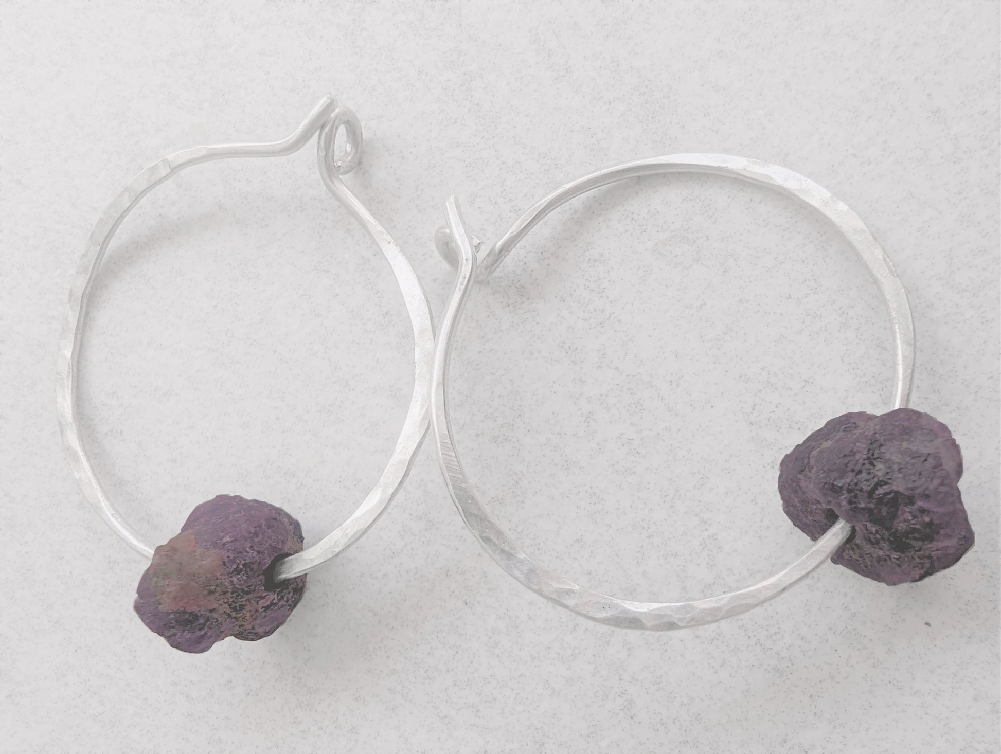 Simply elegant. Or are they elegantly simple? These earrings exude a unique blend of rustic elegance and contemporary style. Hand crafted hoops of sterling silver have a subtle hammered texture that adds a touch of organic charm and reflects light in intriguing ways. The irregularities created by the hammering process contribute to the earrings' artisanal character. Hanging at the heart of each hoop rests a raw ruby nugget. The ruby's deep red hue, often associated with passion and vitality, contrasts beautifully against the shining silver. The raw and uncut nature of the ruby nugget enhances its natural allure, showcasing the gemstone in its most authentic form and creating an alluring tactile experience. The combination of the hammered silver and the raw ruby nugget establishes a captivating juxtaposition between the refined and the raw, the polished and the primal, telling a story of nature's raw beauty combined with human creativity.