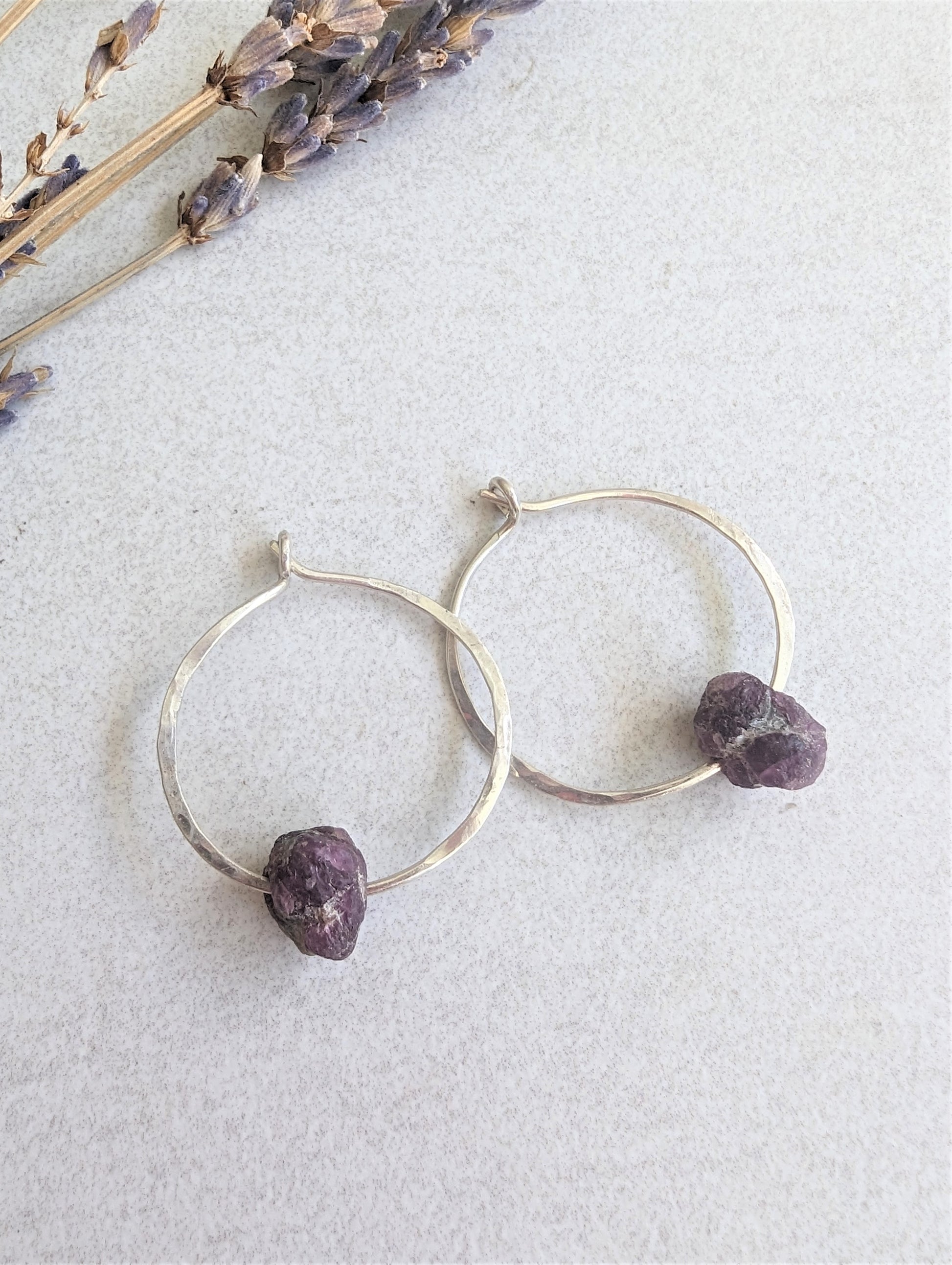 Simple handmade hammered sterling silver hoop earrings sport dark raw ruby nuggets.