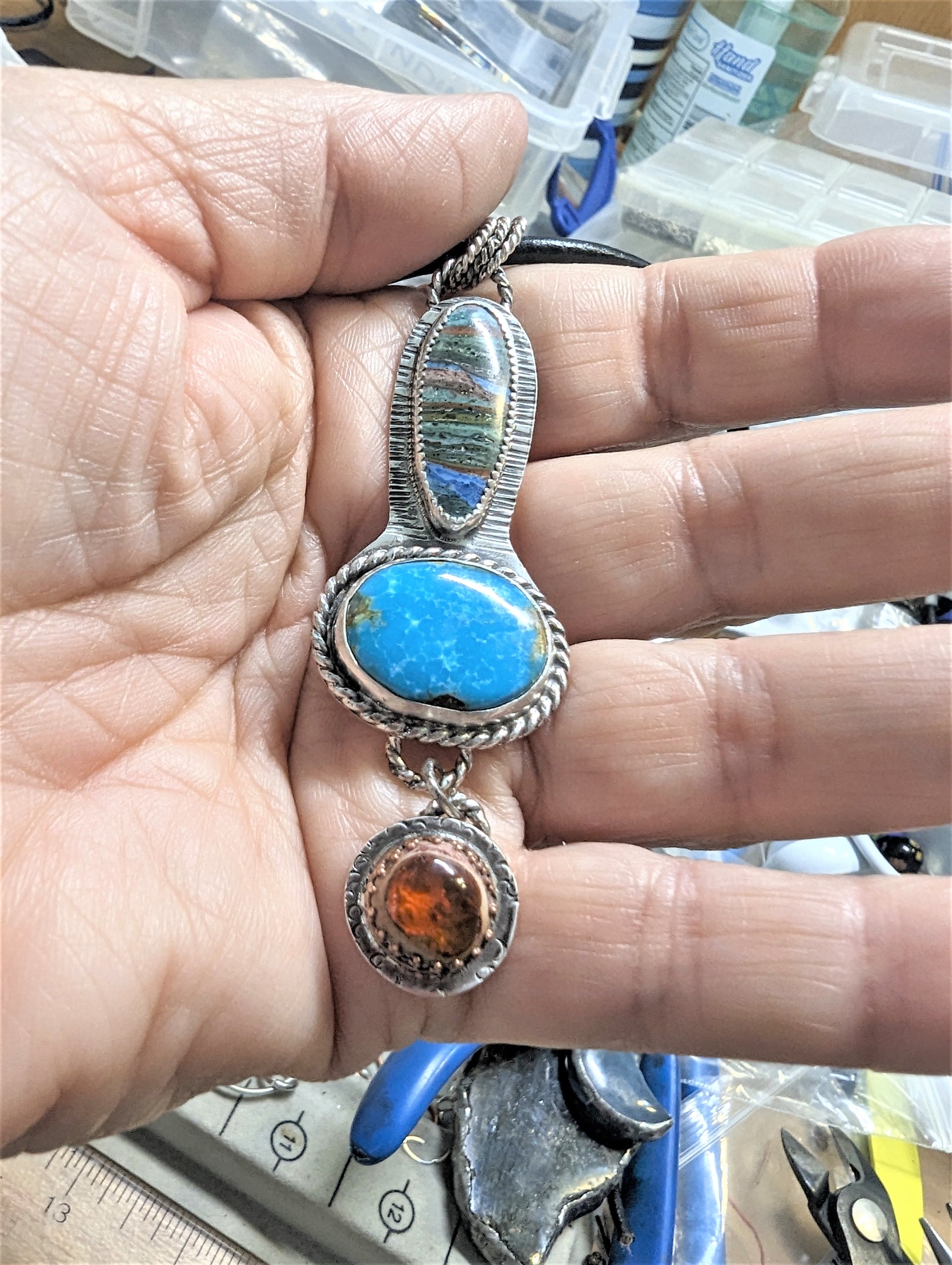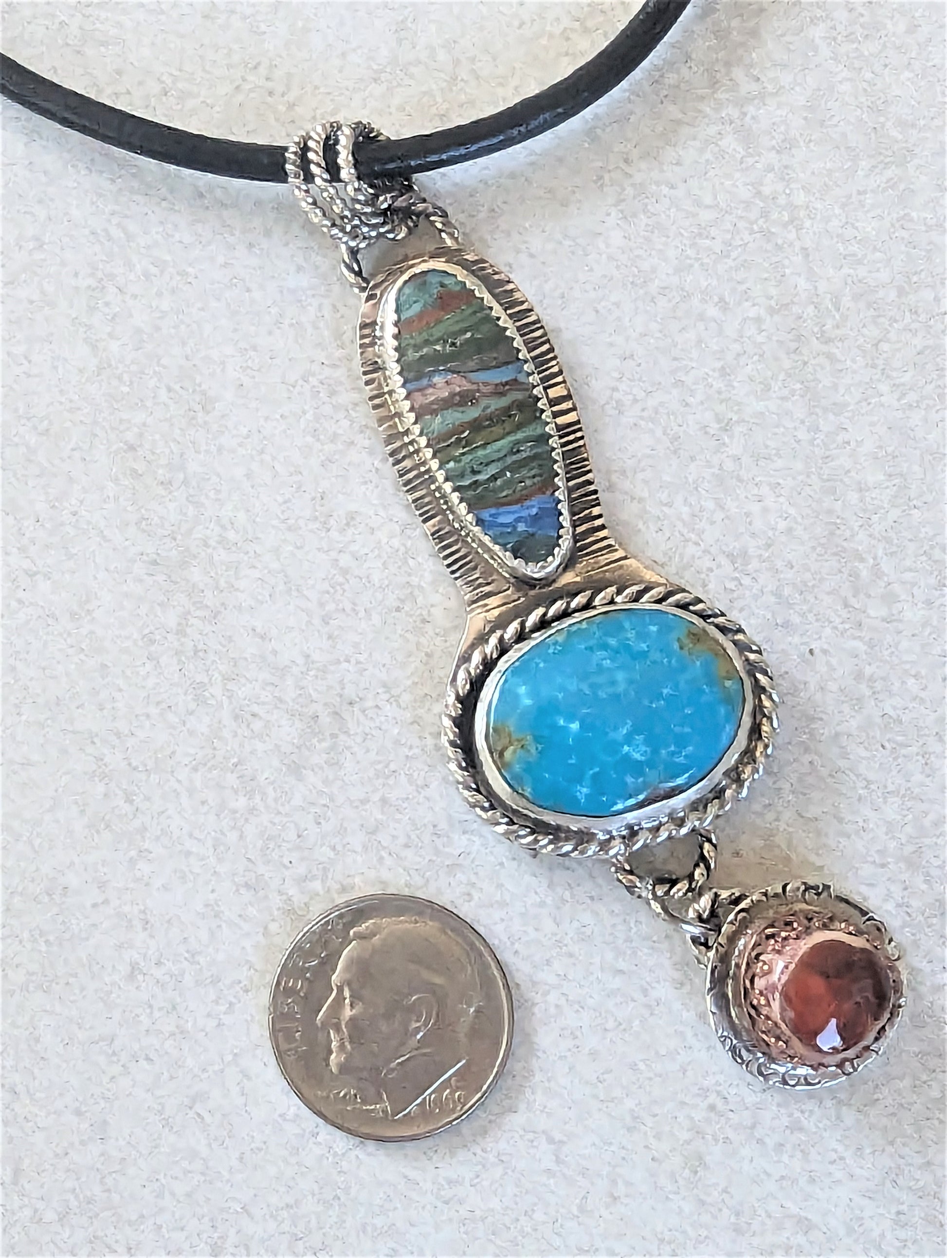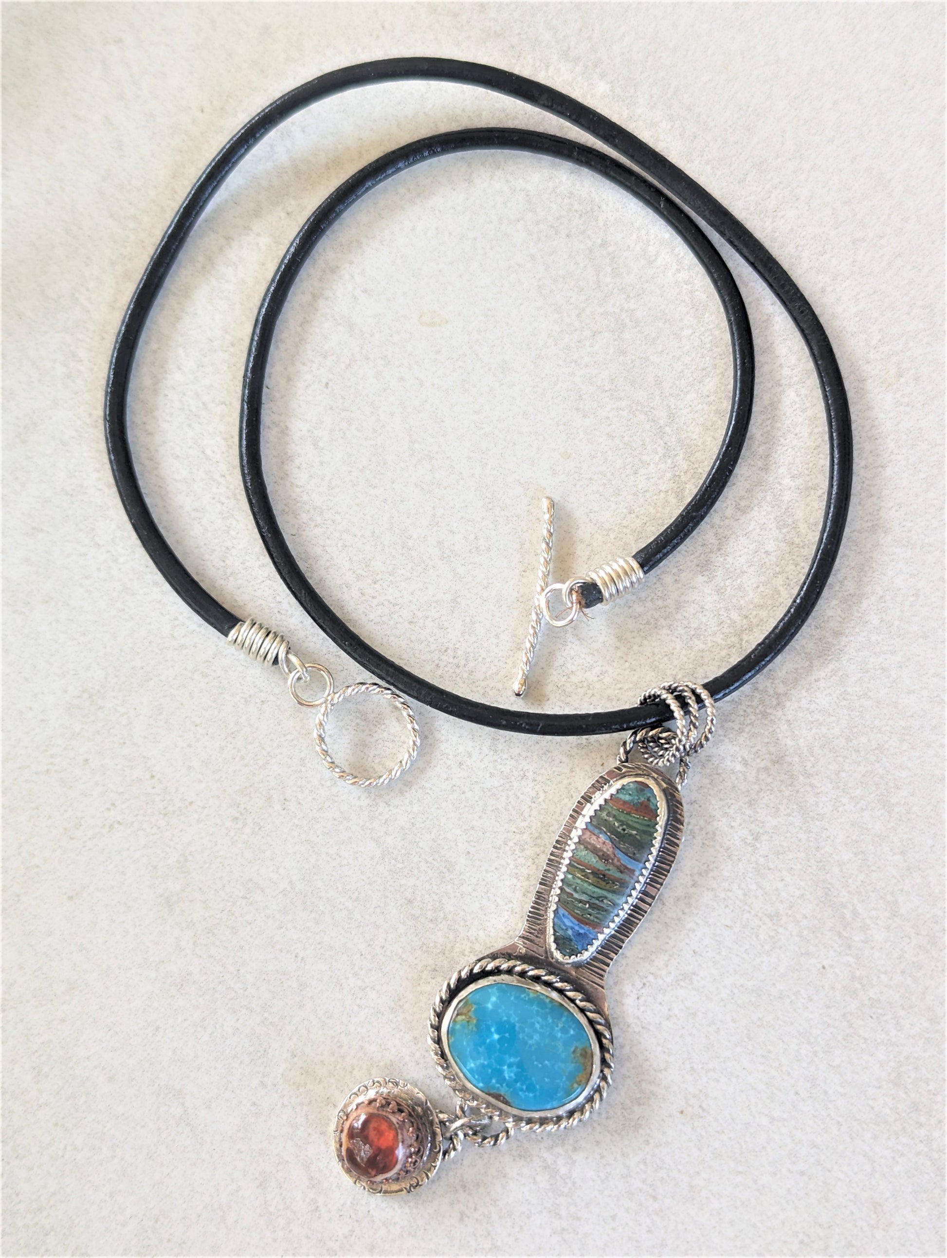 Striking Turquoise, Rainbow Calsilica and Mexican Fire Opal in Sterling Silver Pendant Necklace, Southwest Style Bohemian Artisan Gemstone Necklace