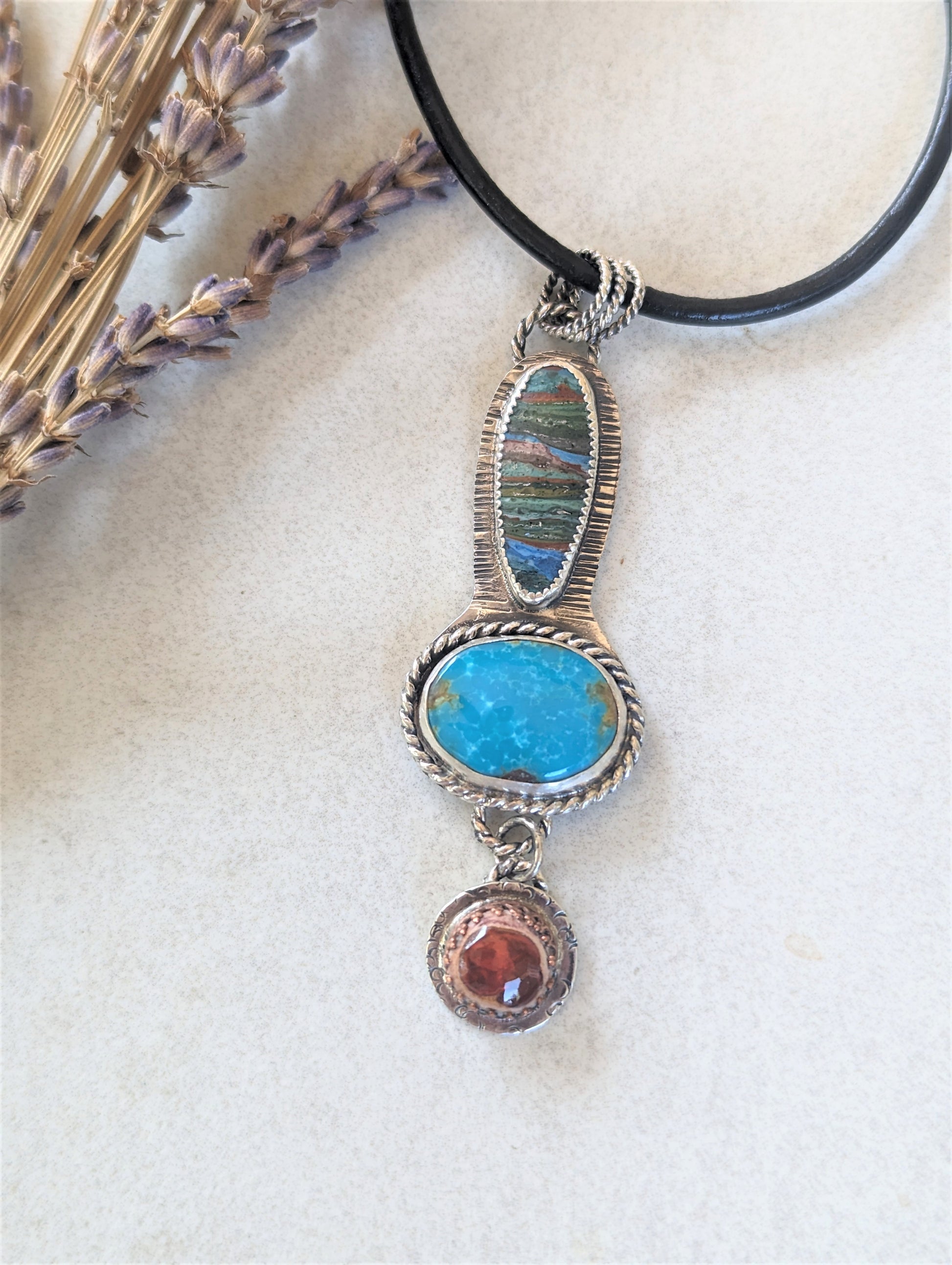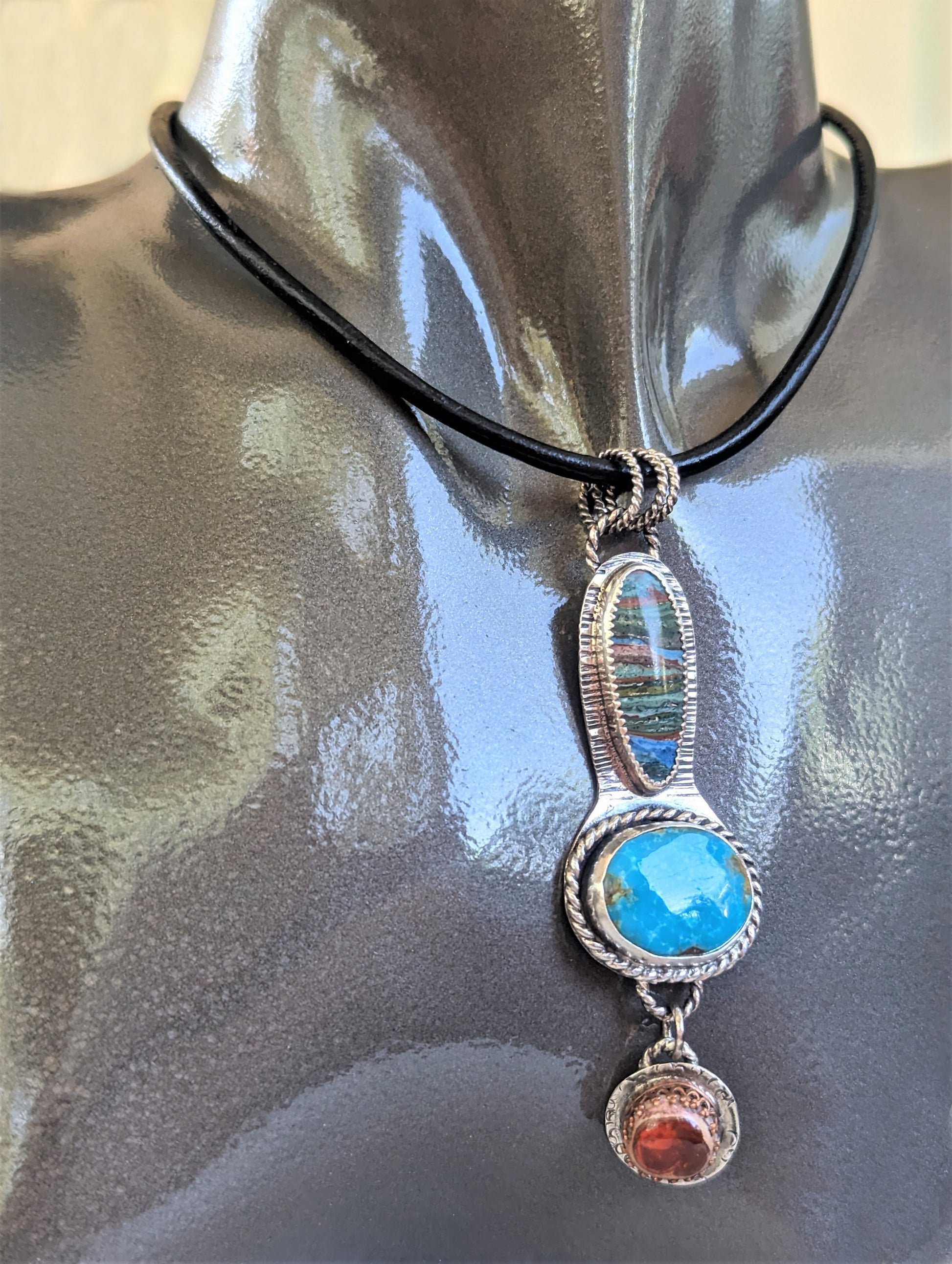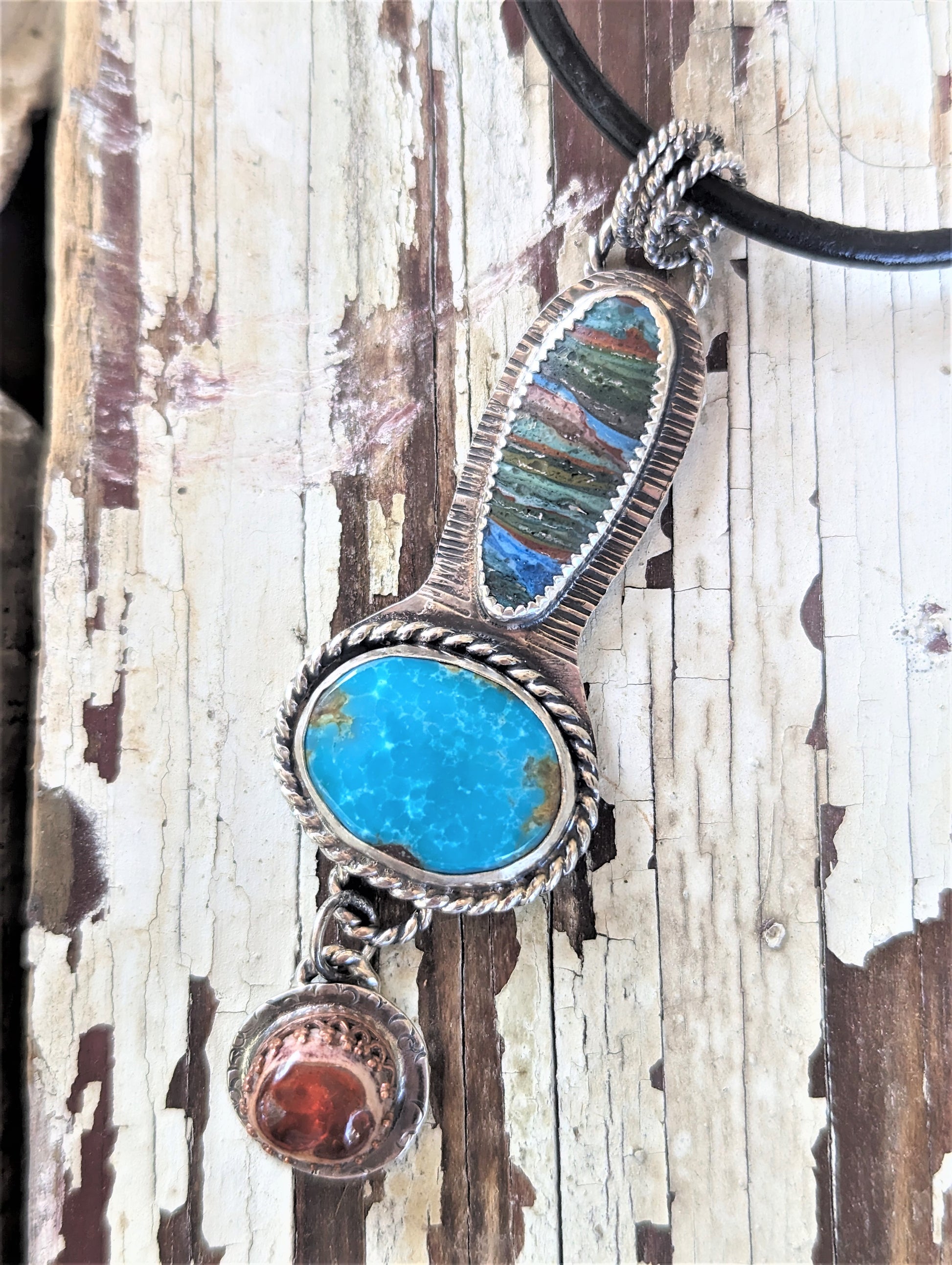 This pendant makes quite a statement with three unique and colorful gemstones hand set in sterling silver reminiscent of the Southwest style. The pendant features the mysterious rainbow calsilica, with its layers of earthy colors, a gloriously blue turquoise, and dangling below is a Mexican fire opal which will randomly catch the light with a bright orange flash.