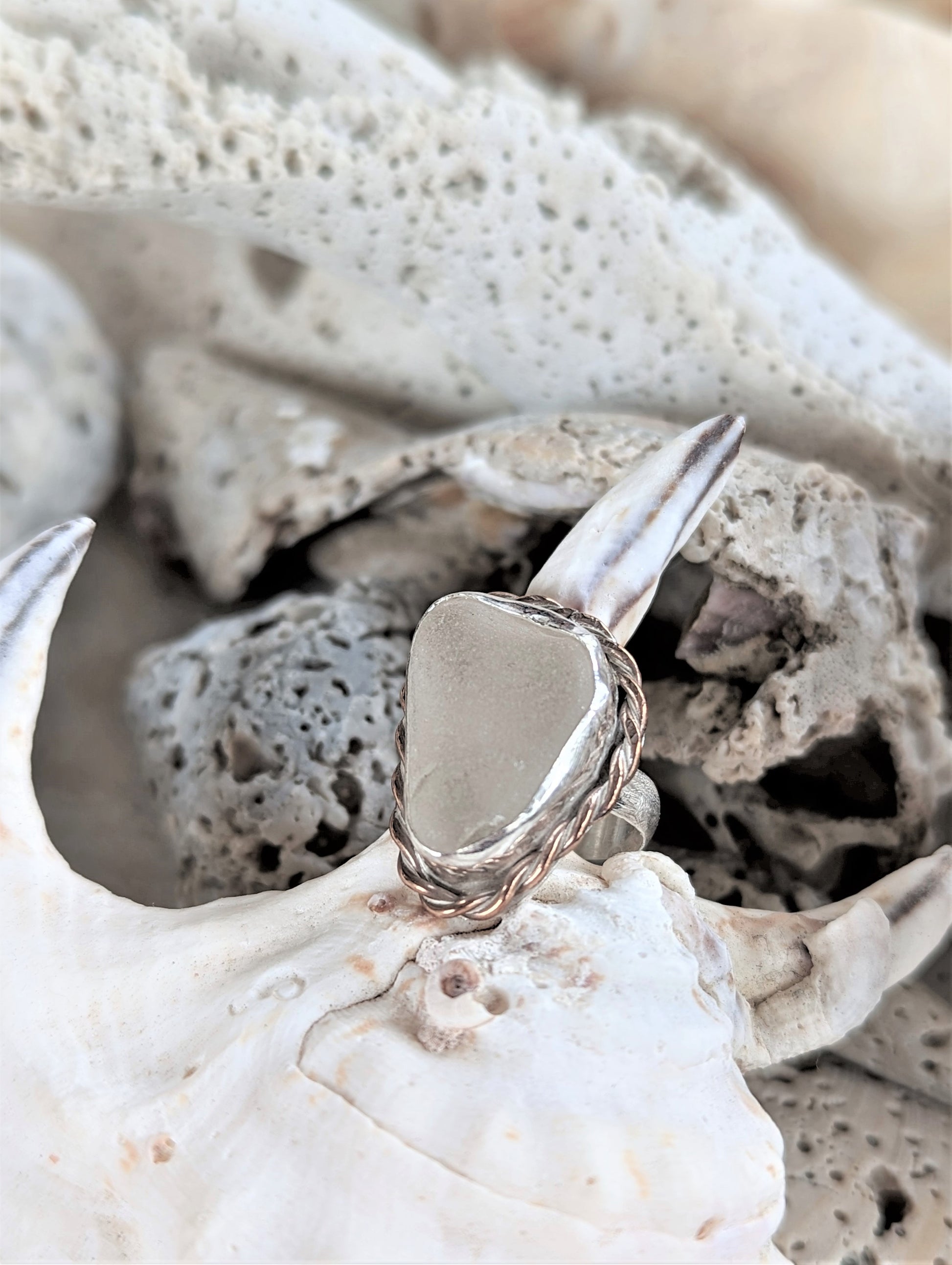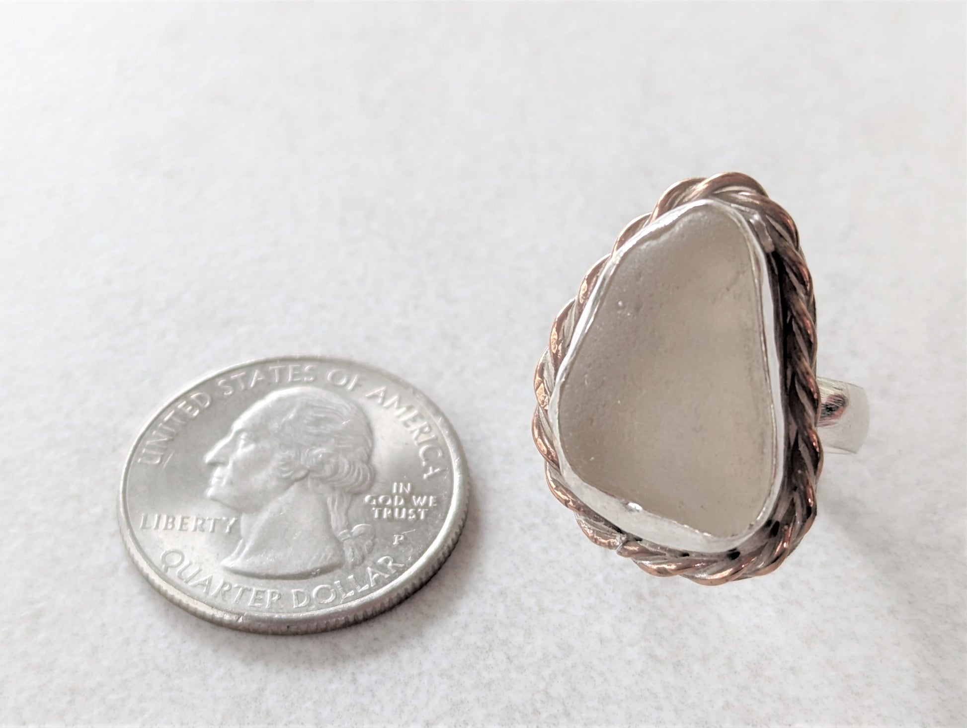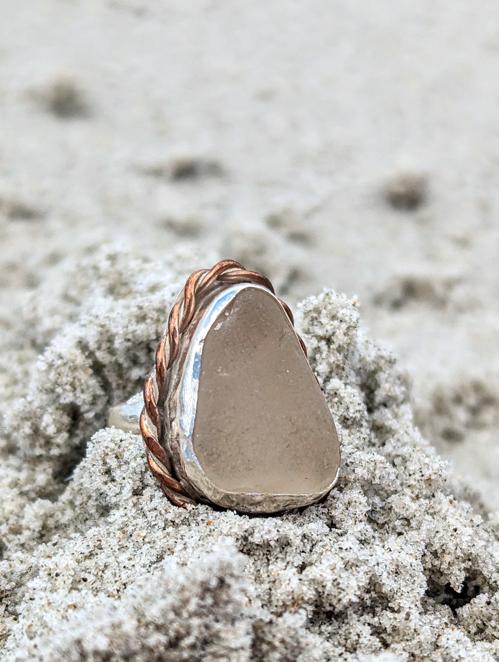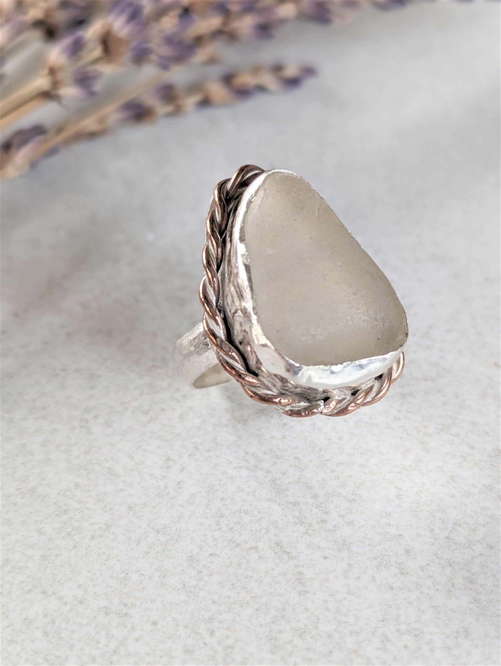 Beach glass is glass that has been weathered and tumbled by the ocean, resulting in a beautifully frosted and rounded appearance. This is a piece of clear glass that has a nearly white appearance from the frosted surface. But it is translucent to the silver back, sometimes appearing dark, possible taking on a slight color from its surroundings, sometime glowing bright white from reflected light. This piece is accented with a twist of warm copper wire, adding warmth and contrast to the overall design. Copper, with its rich reddish-brown tones, brings a rustic and earthy element to the ring. This is an exquisite piece of jewelry that effortlessly combines natural beauty and artistic craftsmanship. It evokes a sense of tranquility and captures the essence of the ocean. This ring is a unique and striking accessory that can enhance any outfit and keeps a connection to the natural world.