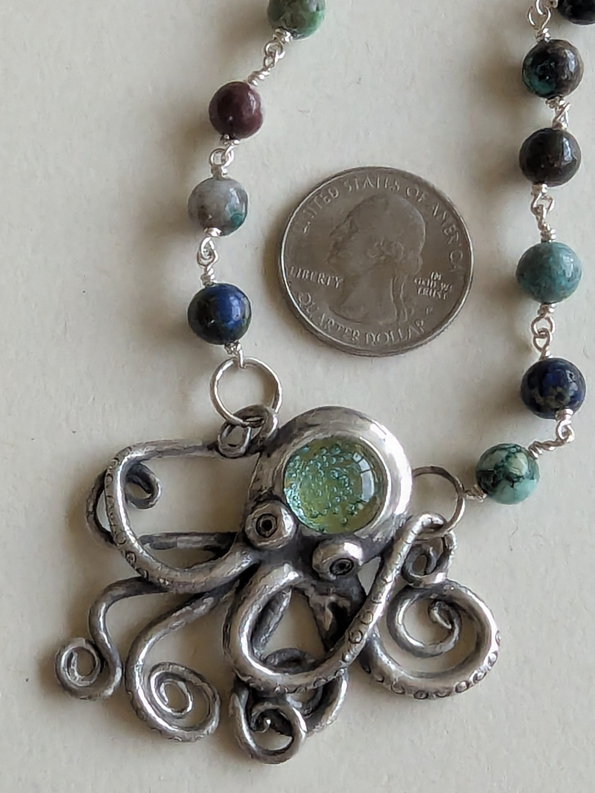 This one-of-a-kind necklace celebrates the mysterious beauty of the sea with a captivating octopus pendant as its centerpiece. Meticulously handcrafted from eco-friendly fine silver precious metal clay, the 2-inch pendant reveals the creature’s sinuous tentacles curling in lifelike motion, textured to reflect the play of light across the silver’s surface. At the heart of the design rests a luminous dichroic glass cabochon, carefully chosen for its Caribbean colors and playful bubbles, which serves as the octopus’s head.