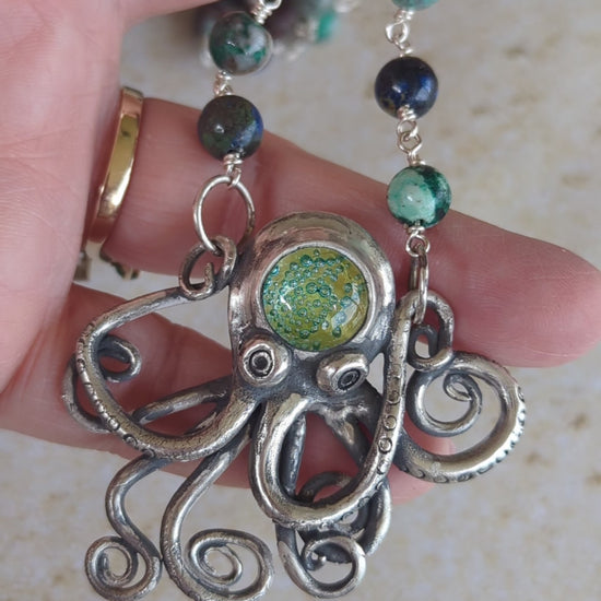 Suspended from an 18-inch sterling silver chain, the pendant is complemented by a series of hand-strung green opal beads, whose natural patterns and subtle color variations echo the hues of tide pools and shoreline treasures. The chain itself is handcrafted, each link shaped and joined with care to create a piece that is as sturdy as it is elegant. Together, the silver, glass, and opal form a composition that feels both mythical and organic—an homage to the ocean’s artistry, full of movement, mystery, and wonder.