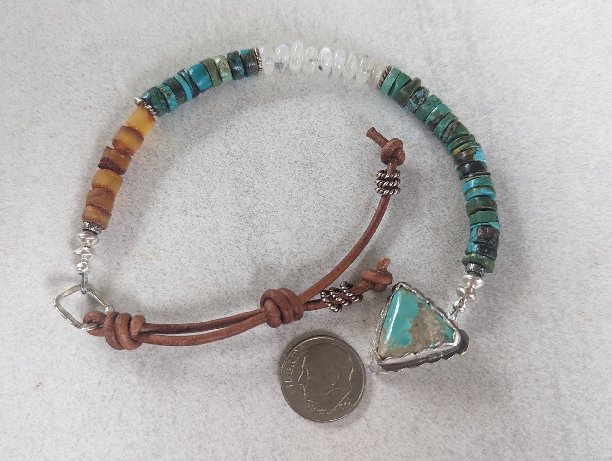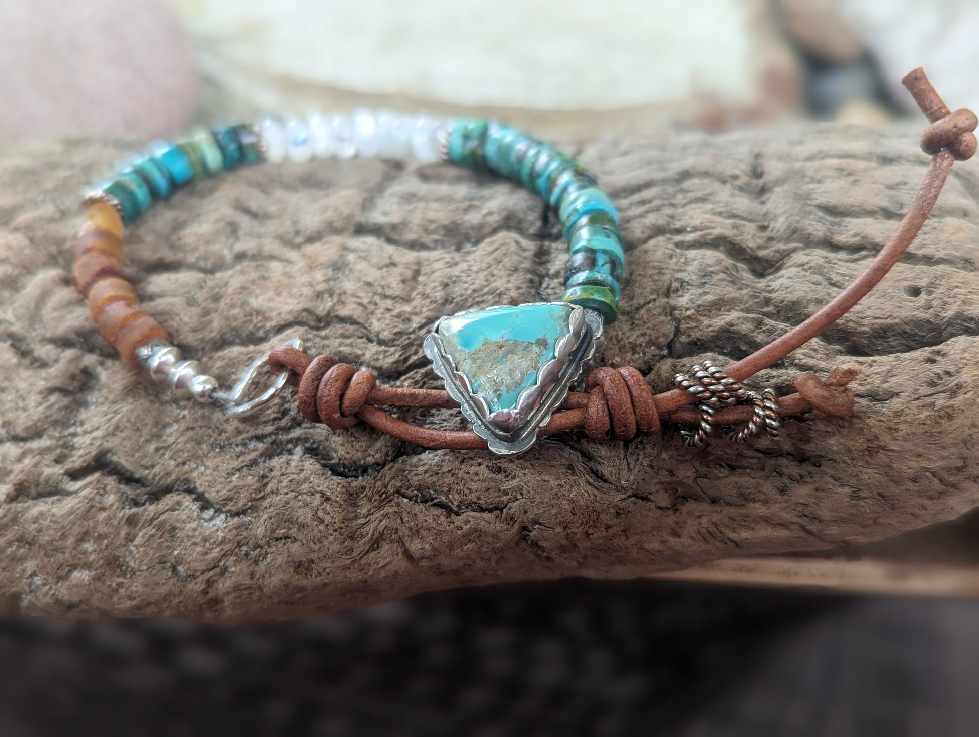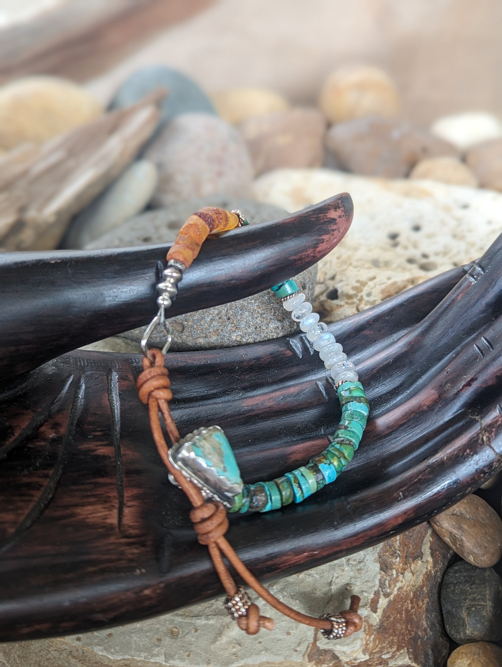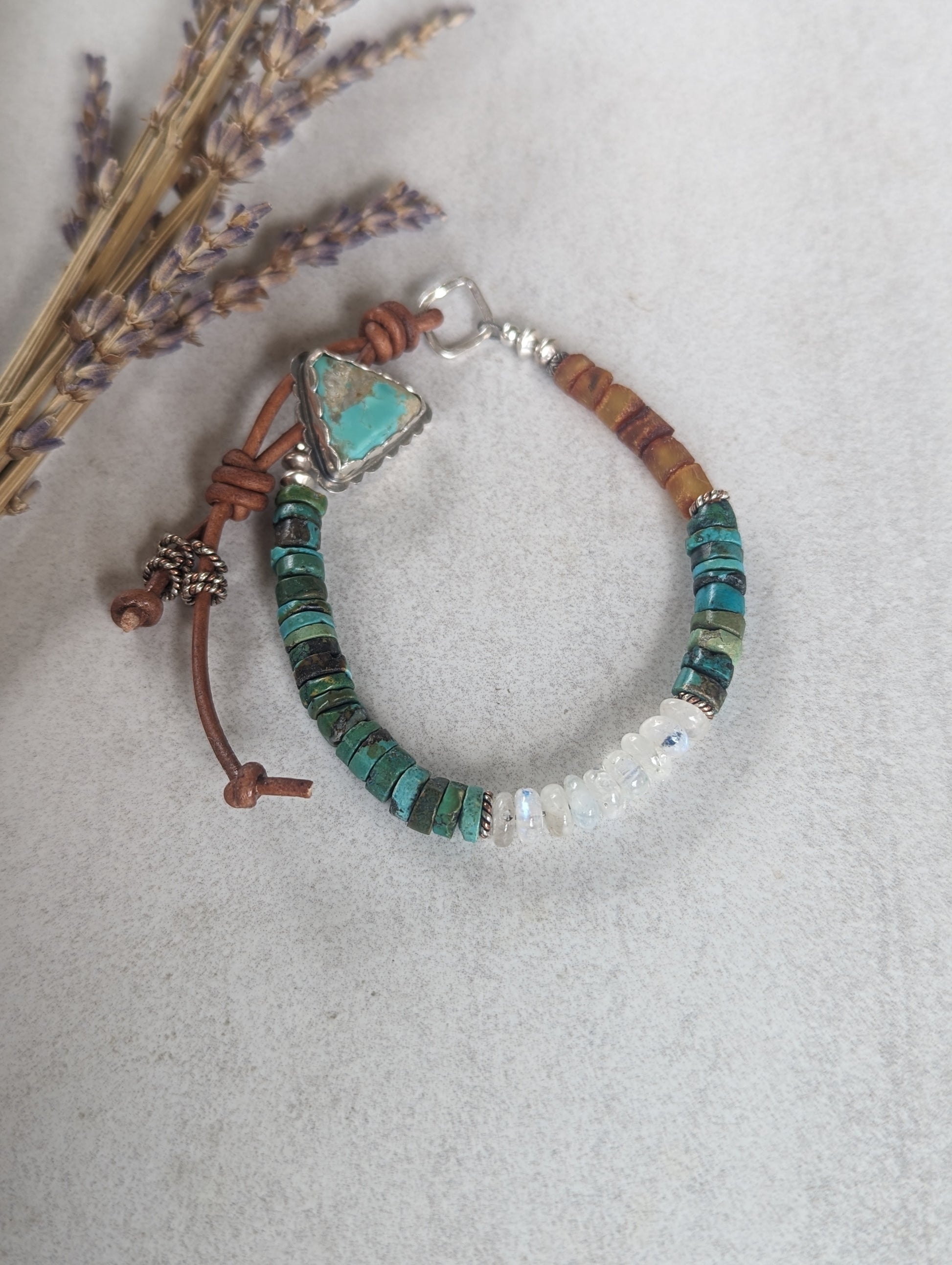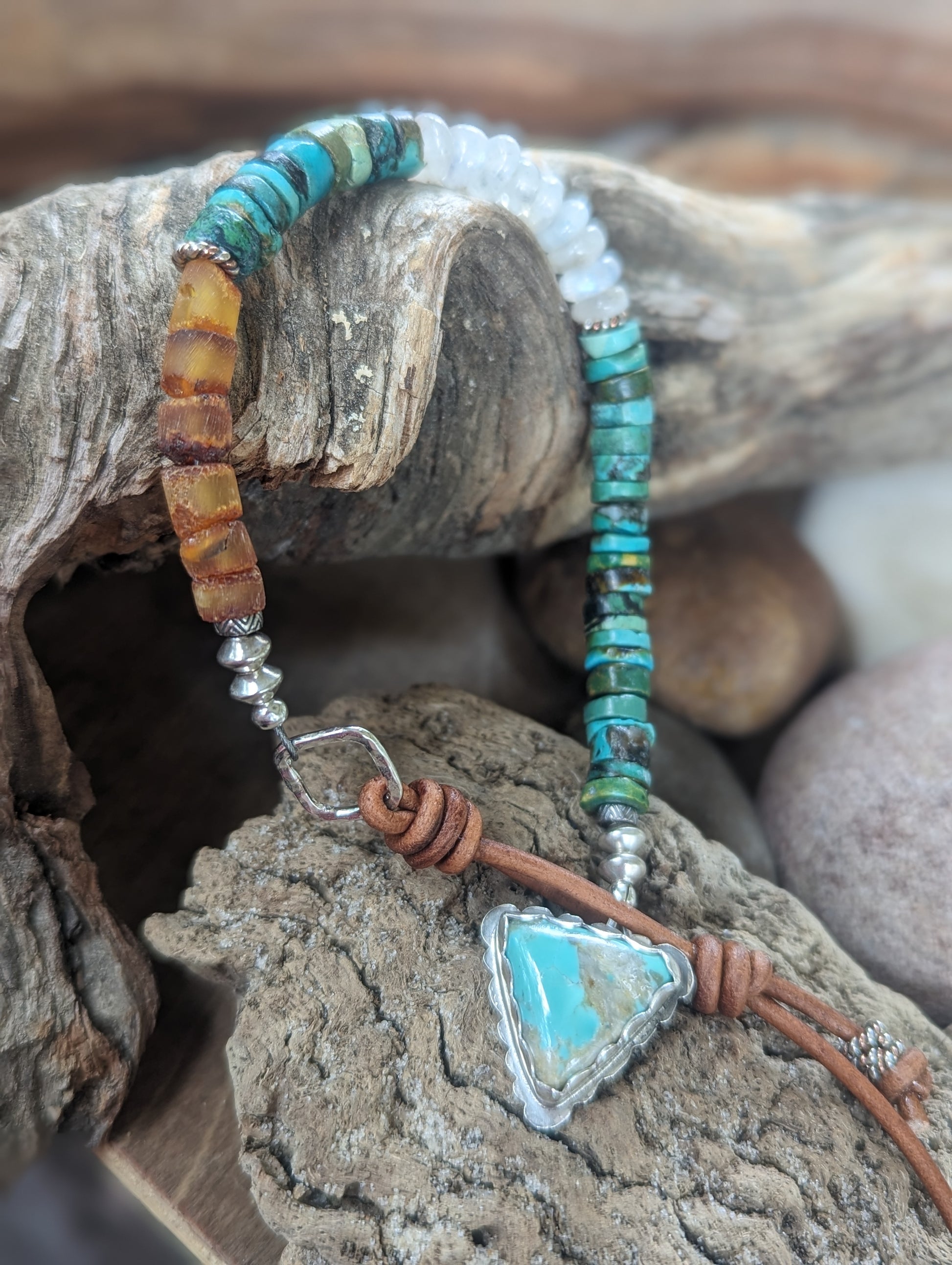 This bohemian bracelet showcases a harmonious blend of cool colors and natural materials, resulting in a unique and eye-catching accessory. The centerpiece of the bracelet is a unique triangular piece of Pilot Mountain turquoise, its vibrant blue-green hue swirling with the soft beige matrix. The stone is hand set in sterling silver as a button to form the clasp for the bracelet. The turquoise heishi beads, selected for their quality and and slightly darker shade, are polished to a smooth finish, allowing their natural beauty to shine. In contrast to the turquoise is a strand of moonstone, renowned for its ethereal glow which resembles the soft radiance of the moonlight. These translucent gems exhibit a captivating play of colors, often showcasing iridescent blues, whites, and subtle flashes of other hues. Completing the earthy quality of the bracelet is a section of raw baltic amber. Amber is fossilized tree resin that showcases warm, golden hues and brings a natural, organic feel to the bracelet. The bracelet is secured around the wrist with a knotted leather closure is used. The leather provides a soft and comfortable touch against the skin, while also adding a rustic and bohemian charm to the design. The leather is sourced from Texas where is is processed with environmentally friendly chemicals and dyes.