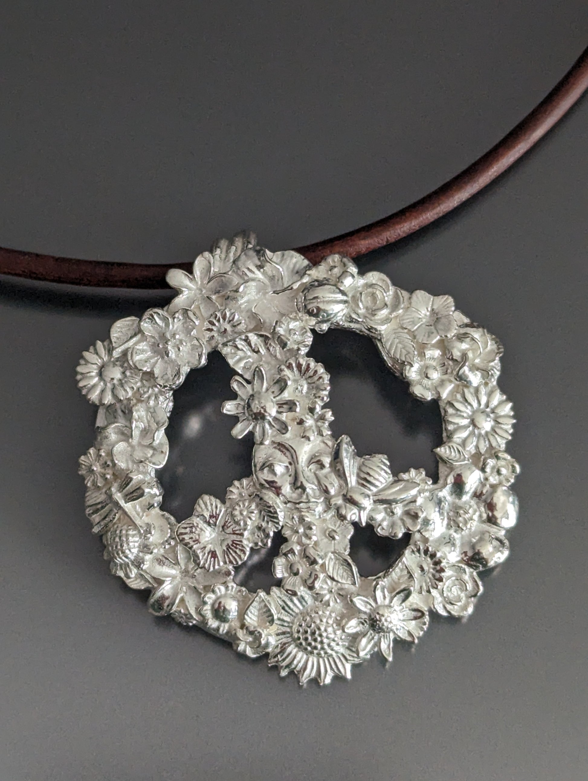 This pendant is a mesmerizing fusion of nature's delicacy and the symbolism of peace. Crafted with meticulous care, it features a large peace sign intricately composed of tiny flowers and insects, each delicately sculpted from fine silver metal clay. The surface of the pendant is a tapestry of textures, as delicate blossoms intertwine with miniature creatures like butterflies, bees, and ladybugs. Each petal and wing is meticulously detailed, capturing the essence of the natural world in miniature. At the heart of the peace sign rests a serene face, a single tear gracefully trickles from one eye, adding a poignant touch to the piece. The tear serves as a subtle reminder of the fragility of peace, a symbol of empathy and compassion amidst the beauty and chaos of existence. Suspended from an organic brown leather cord, this handmade pendant is not just a piece of jewelry but a work of art that invites contemplation and reflection. It carries with it a profound message of harmony, reminding the wearer of the interconnectedness of all living beings and the enduring power of compassion.