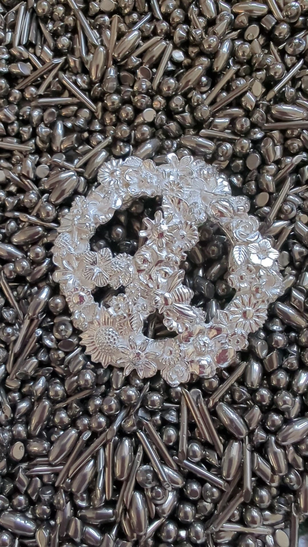 This is a statement piece of jewelry for sure. A hefty shiny silver peace sign will attract attention on it's own. But look more closely and you will see that this one is hand crafted of tiny flowers and pollinators from fine silver metal clay. But even closer inpection will turn the conversation into a full on debate when the face with the teardrop is finally noticed in the center! Yes, this is a bold piece for that bold moment!