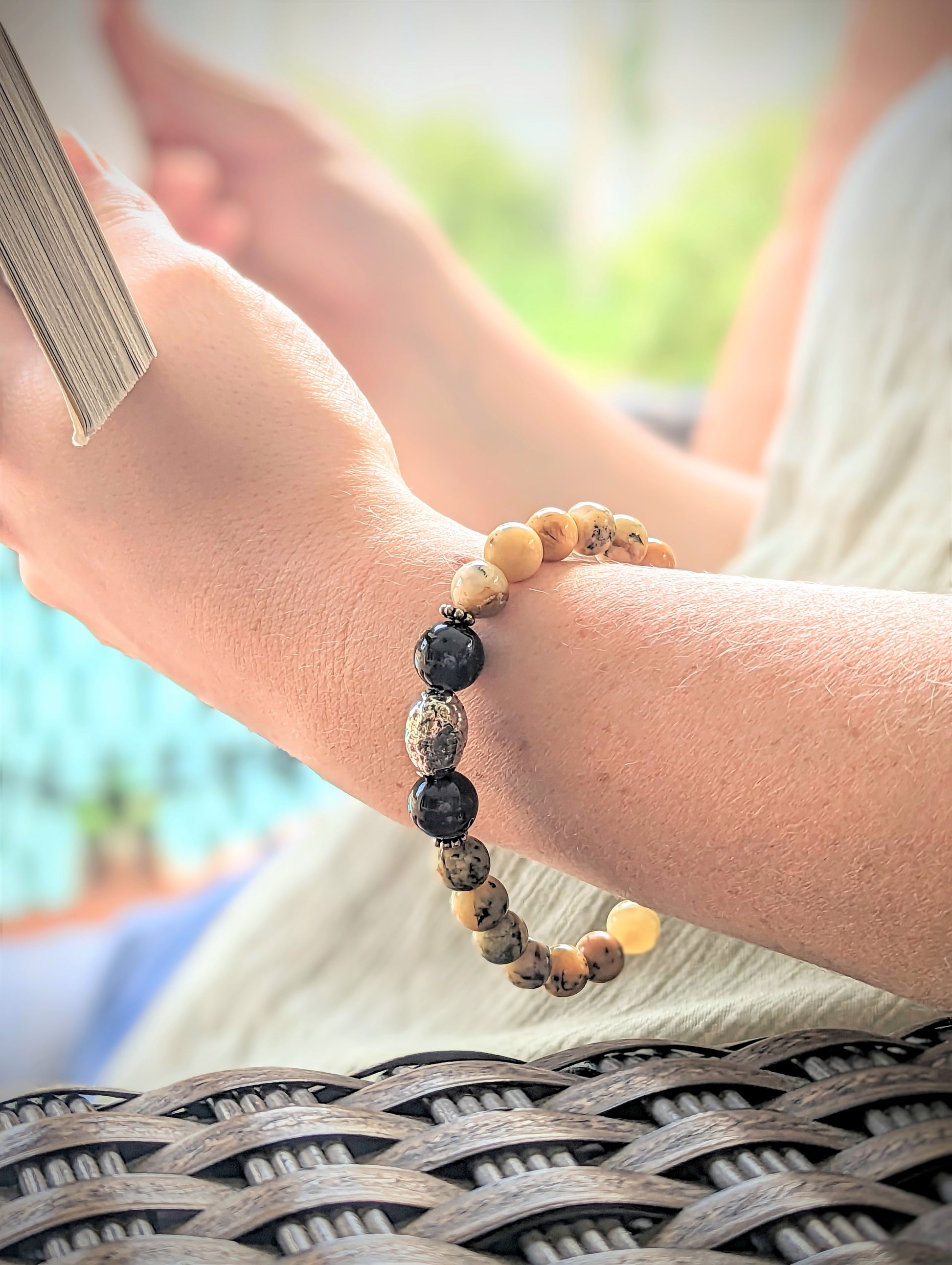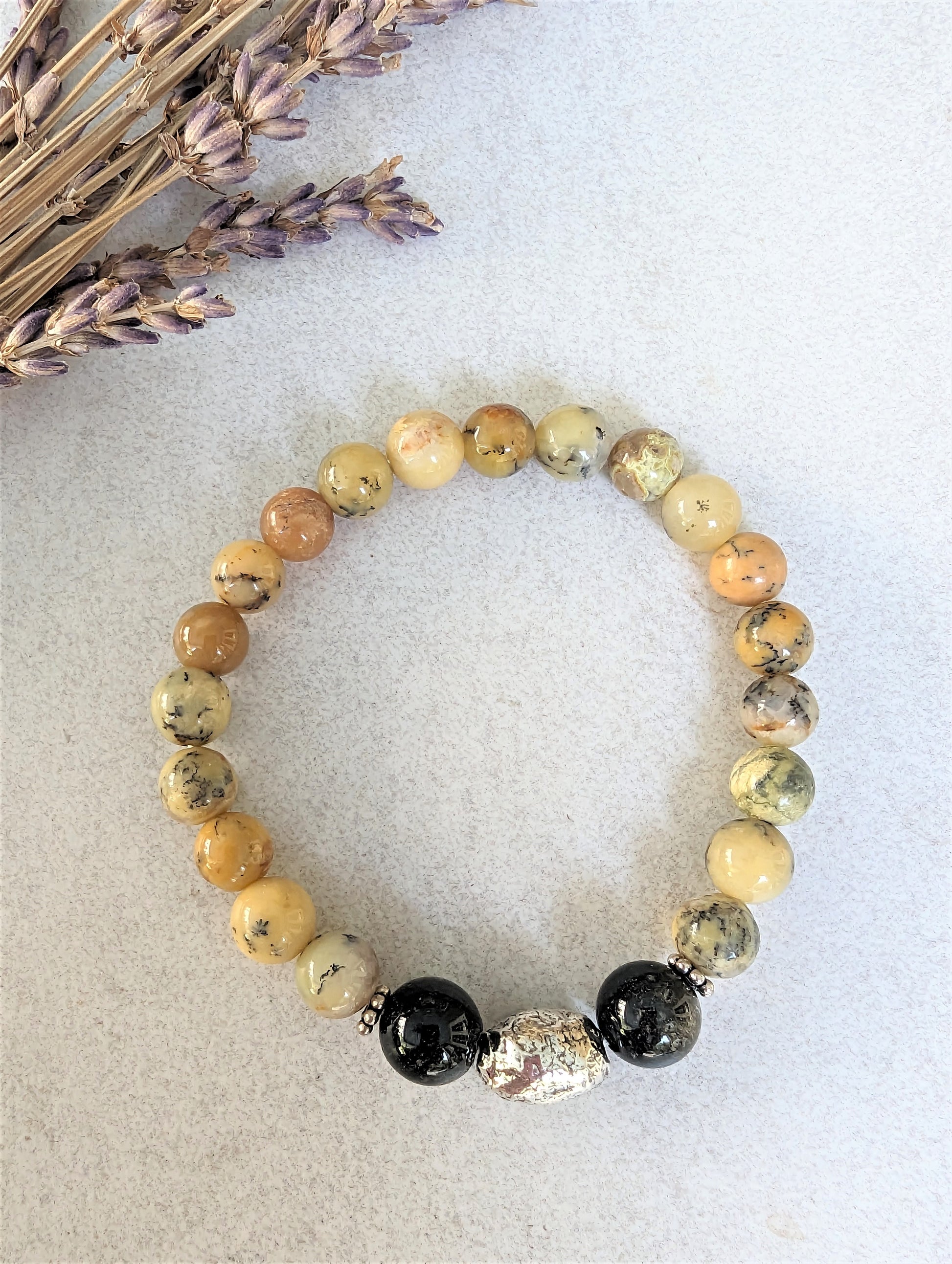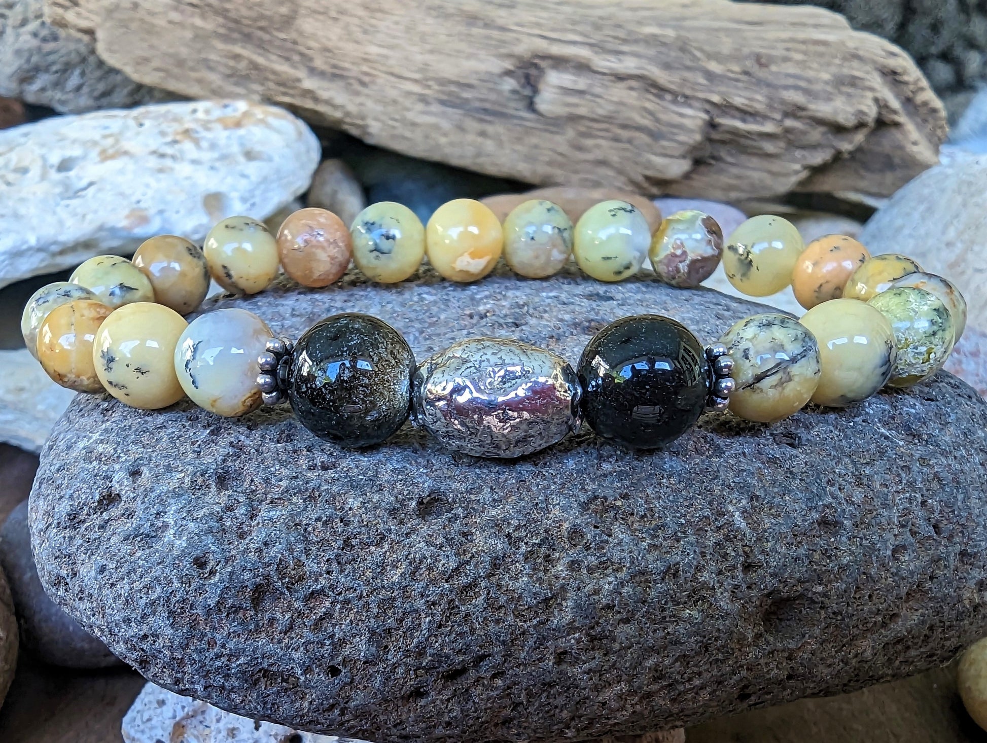 The bracelet features smooth, polished yellow dendritic opal beads. These beads showcase a warm and inviting buttery yellow. The jelly-like quality of the opal adds depth to the beads, revealing delicate, fern-like inclusions, dendrites, that create a mesmerizing natural pattern. At the centerpiece of the bracelet are two lustrous gold sheen obsidian beads which contribute a touch of mystery and sophistication to the bracelet. Providing a striking contrast to the yellow opal, the deep,dark base of the obsidian shimmers with a golden sheen, caused by reflective layers within the obsidian. The focal point of the bracelet is a meticulously crafted oval bead of fine silver metal clay. The organic texture of the silver adds an artisanal touch to the bracelet. The bracelet is strung on a durable yet flexible elastic cord, allowing for ease of wear and a comfortable fit. Overall, this bracelet seamlessly blends the earthy charm of yellow dendritic opal, the mysterious allure of gold sheen obsidian, and the artisanal elegance of a fine silver bead, resulting in a wearable work of art that captures attention and showcases the beauty of natural gemstones and skilled craftsmanship.