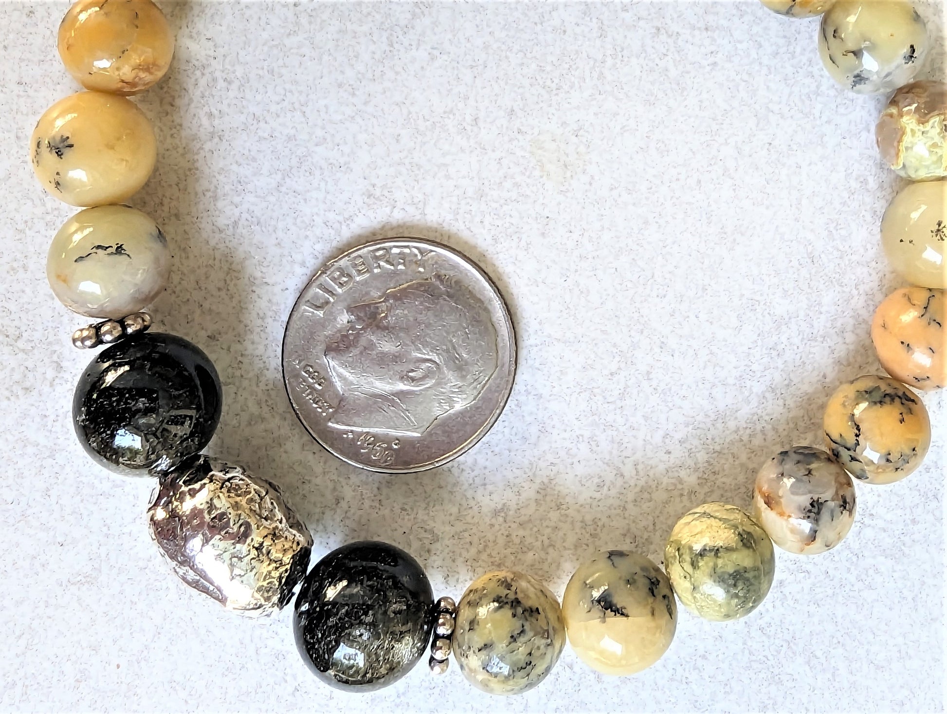Yellow Dendritic Opal with Gold Sheen Obsidian and Silver Elastic Bracelet