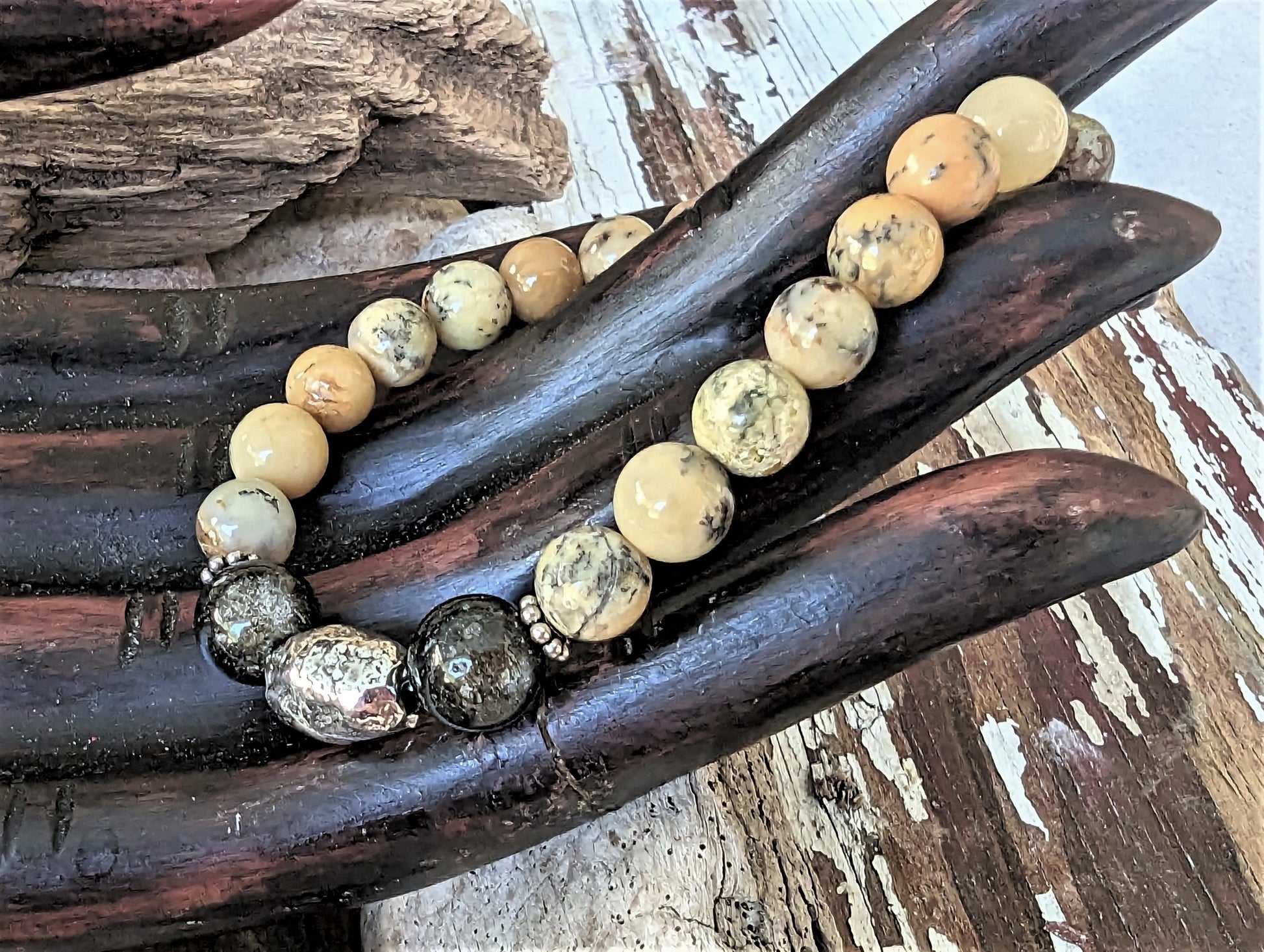 This is a fun and unique elastic bracelet of unusual yellow denritic opal beads with a centerpiece of gleeming gold sheen obsidian and a handmade silver bead.